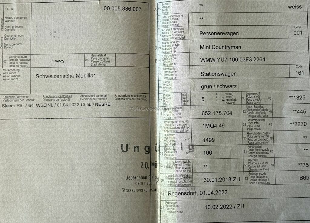 | Information | Keine technische Prüfung (Werkstatttest) vorgenommen Diverse Schäden an Karosserie/Lack. Fahrzeug ab Platz, ohne Garantie und Aufbereitung. Keine Gewähr auf die Angaben der Sonder- und Serienausstattung / keine mechanische Prüfung. Fahrzeug wurde unzerlegt expertisiert / keine Haftung für allfällige, nach Demontage bekanntwerdenden Mängel. Fahrzeugbereifung und Ausstattung gemäss Fotos / Fahrzeugkauf auf eigenes Risiko ab Platz ohne Nachwährschaft - Div. Dellen und Kratzer am gesamten Fahrzeug. - Hundefahrzeug!! - Letzter Service 04.2024 |