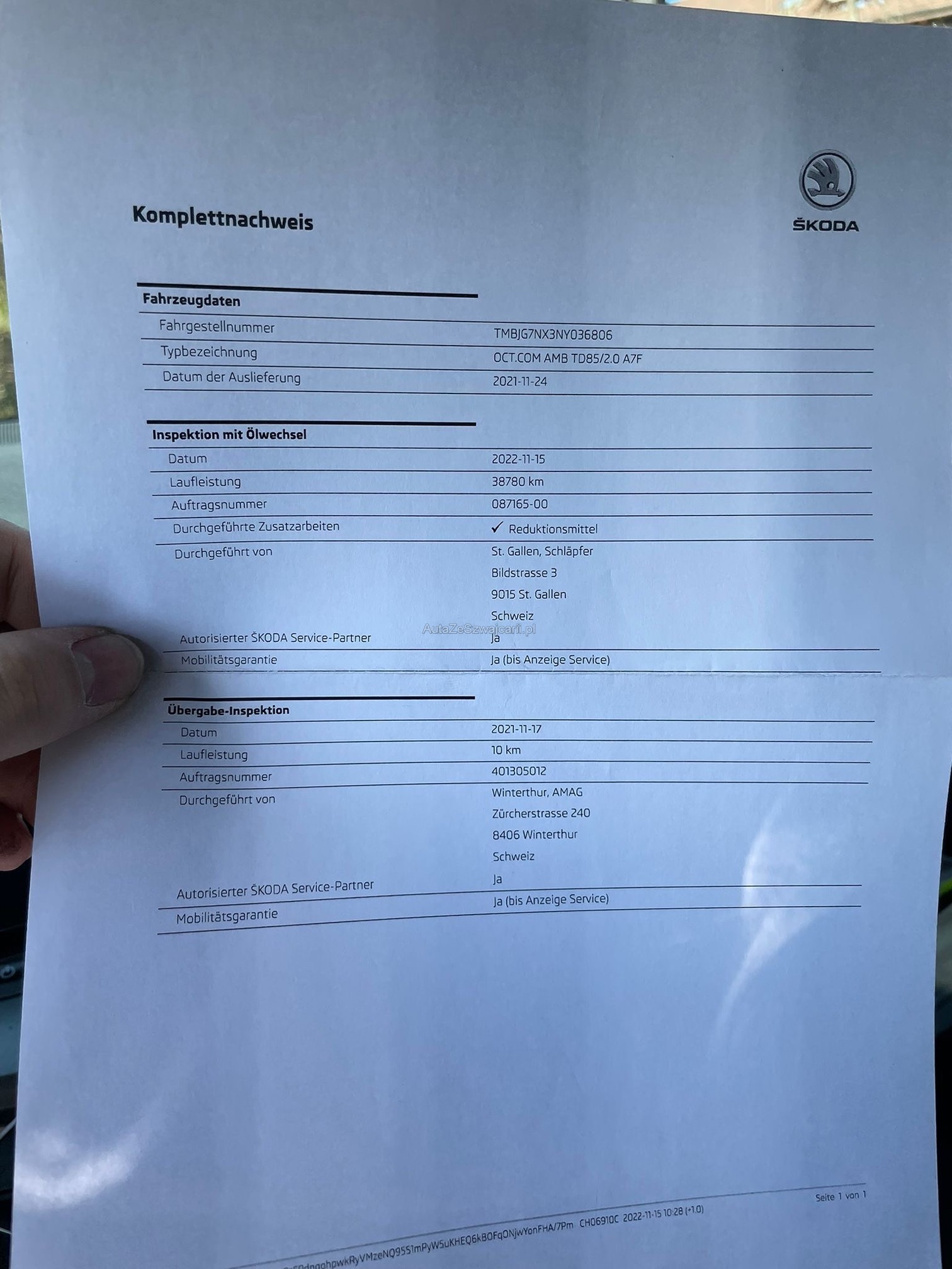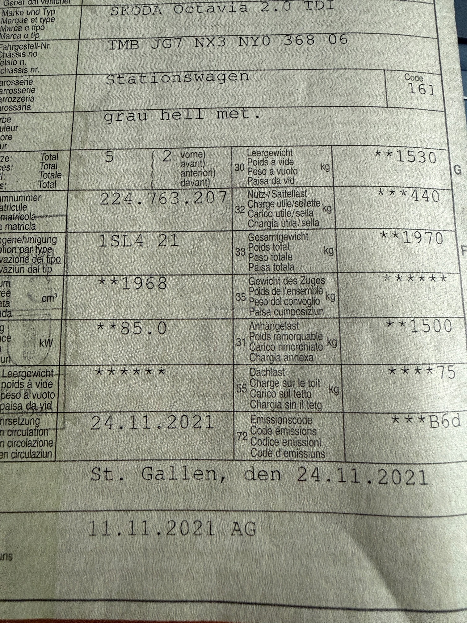 | Kommentar | Am Fahrzeug wurde kein Werkstatttest gemacht (Für sichtbare oder nicht sichtbare Mängel wird nicht gehaftet). Wir testen & kontrollieren nicht alle Funktionen vom Fahrzeug. Das Risiko liegt somit vollumfänglich beim Käufer. Nachdem der Höchstbietende den Zuschlag erhalten hat, gibt es keine Nachverhandlung, auch wenn nicht deklarierte Mängel zum Vorschein kommen sollten. Ab Platz ohne Garantie, die Gewährleistung ist vollständig ausgeschlossen, damit insbesondere auch Wandelung und Minderung. _ Sonderausstattung gemäss Eurotax ohne Gewähr: _ Assist: Regensensor mit Lichtassistent (Coming Home, Leaving Home, Tunnel Light) Scheibenwaschdüsen beheizt Media: SmartLink Premium Assist: Berganfahrassistent SunSet (Heckscheibe und hintere Seitenscheiben dunkel getönt) Paket: Navi Pack (Ambition) Räder: Leichtmetallräder 7,0 Jx 17" (ROTARE) silber 205/55 R17 Räder: Stahlnotrad inkl. Wagenheber, Radschraubenschlüssel (ohne Pannenset) Anhängerkupplung, mechanisch anklappbar mit elektrischer Entriegelung Paket: mySKODA Pack Basic Lackierung: Metallic-Lackierung |