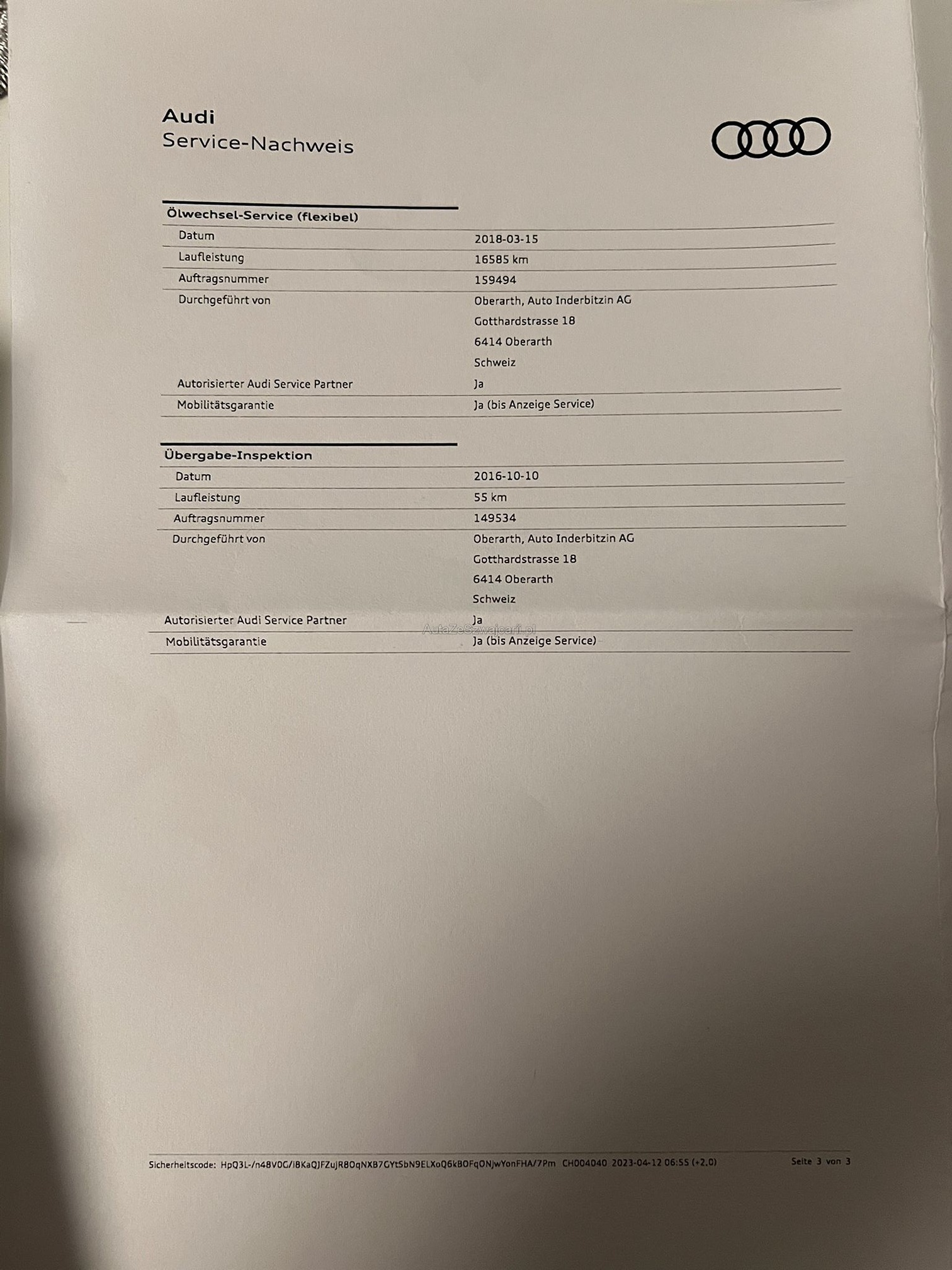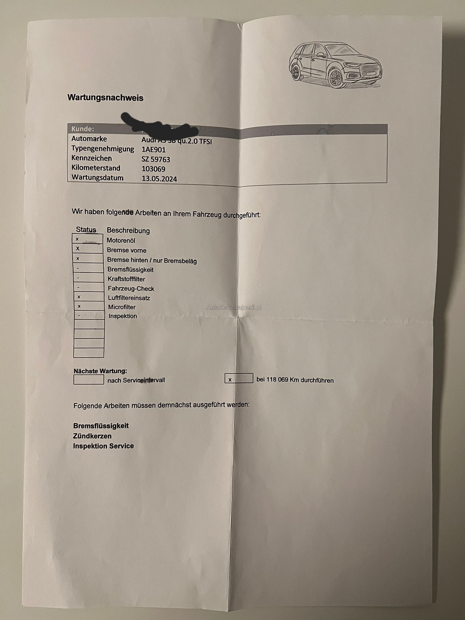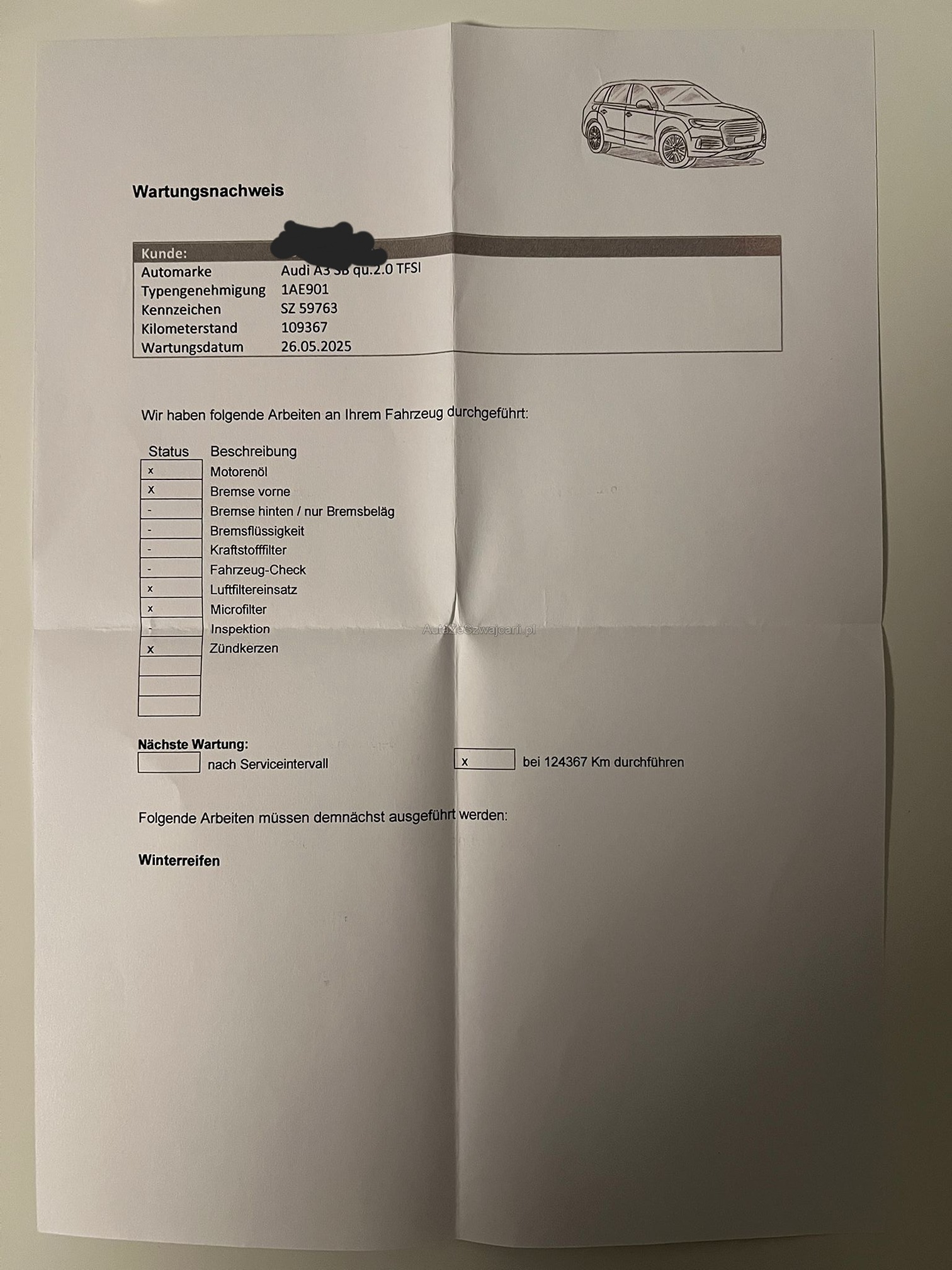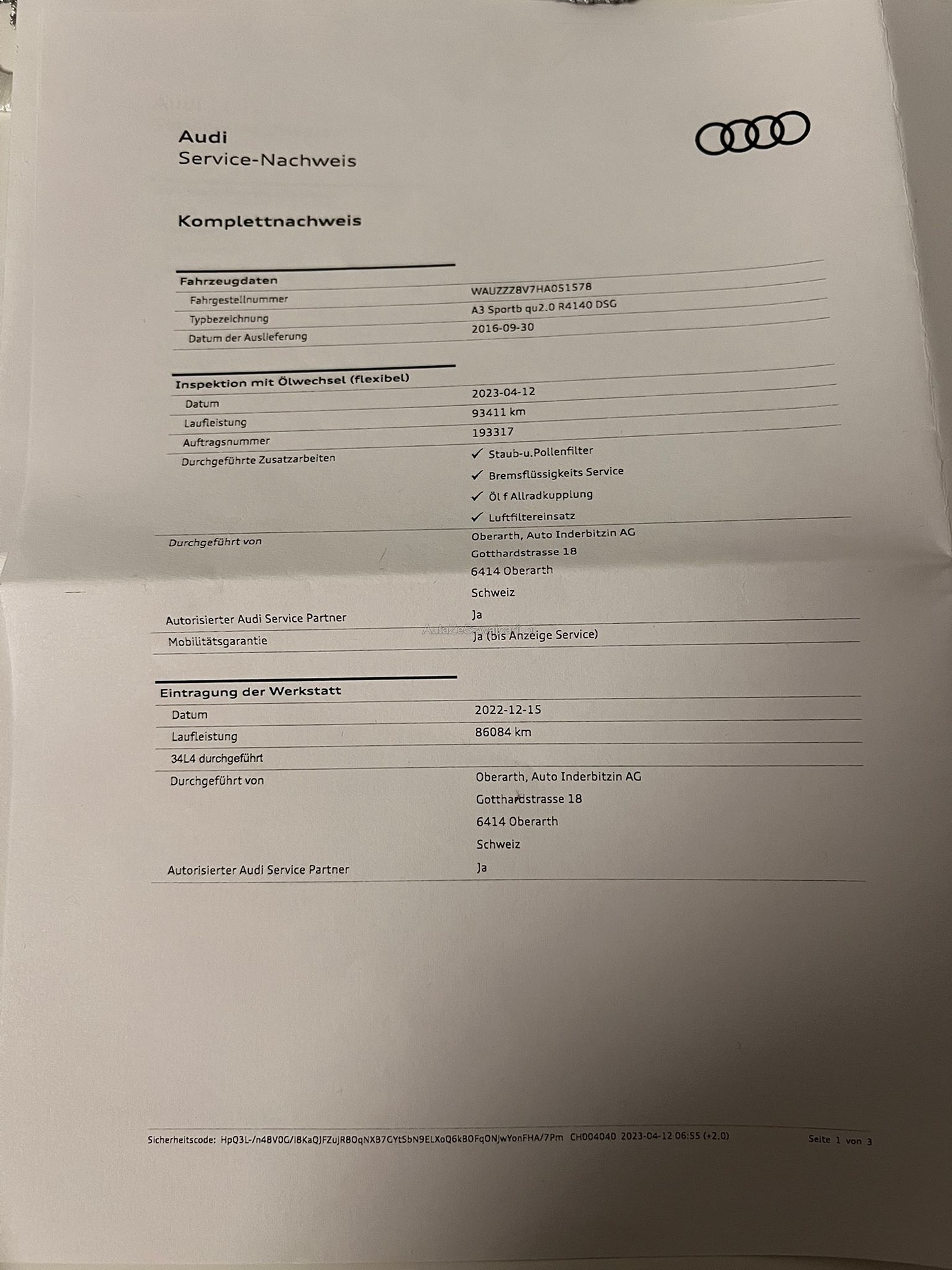 | Kommentar | Kein Werkstatttest durchgeführt, das Fahrzeug ist aber innen wie aussen sehr gepflegt! |