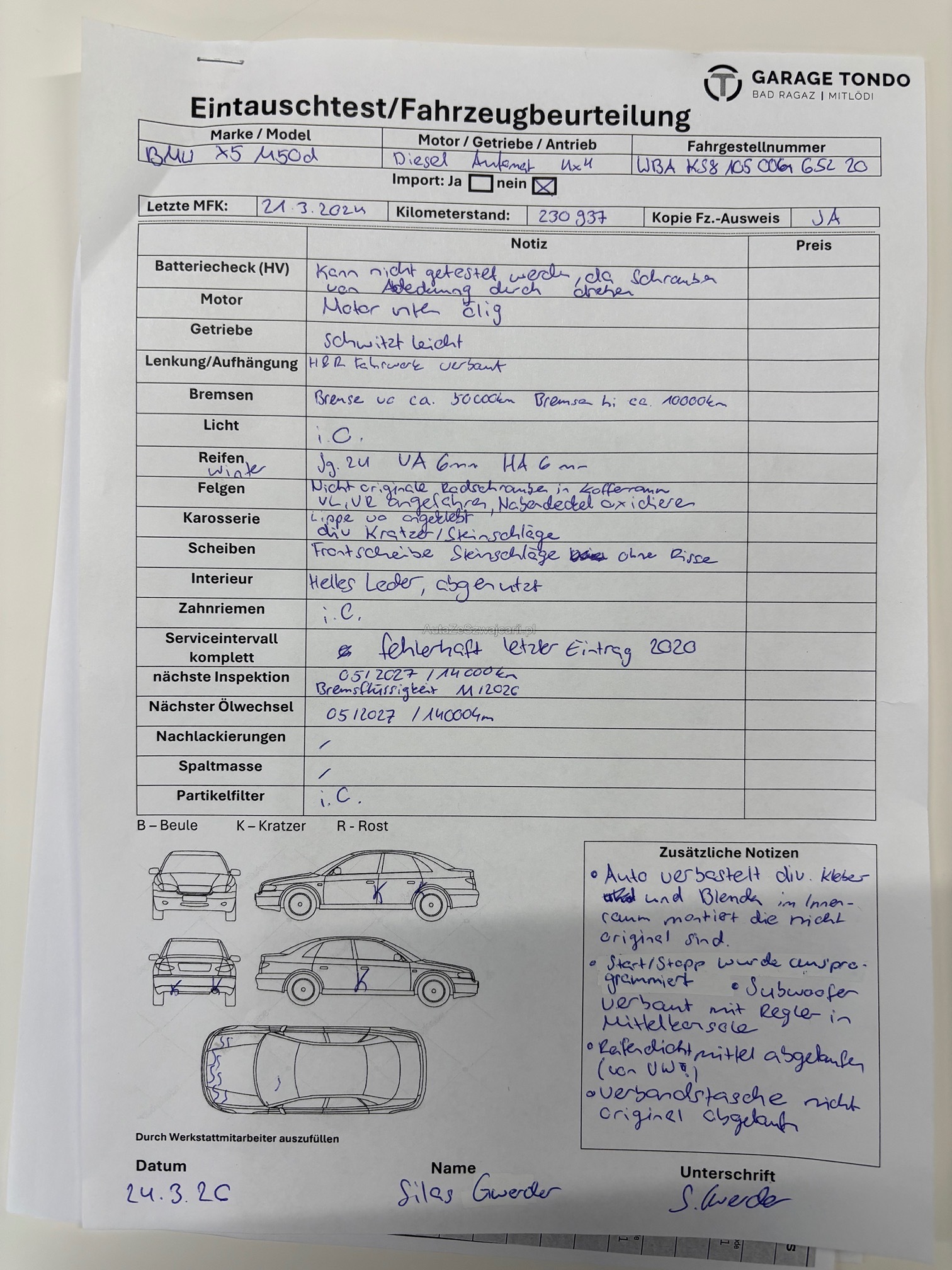 | Kommentar | H&R Federn sind eingetragen Gemäss Kunde hat das Fahrzeug einen Federbruch, wir habe Ihn nicht gesehen Frontschürze eingetragen Winterräder & Sommerräder eingetragen Flaps auf der Seite eingetragen Innenraum abgenutzt Motor leicht ölig, Getriebe schwitzt leicht Servicehistorie nicht nachvollziehbar Start-Stopp System aus programmiert Subwoofer mit Regler in der Mittelkonsole verbaut |