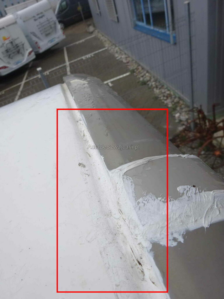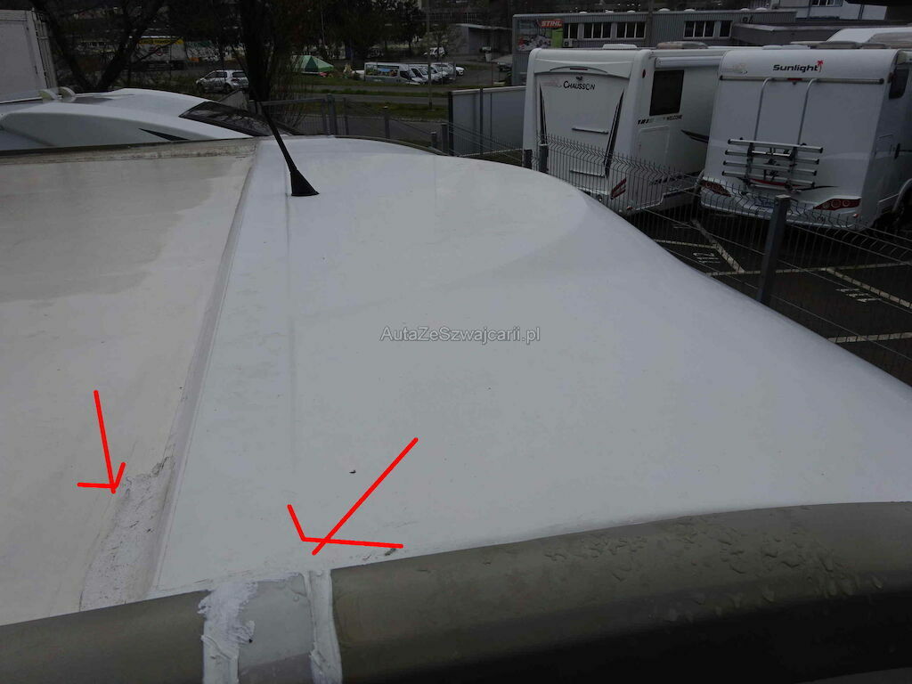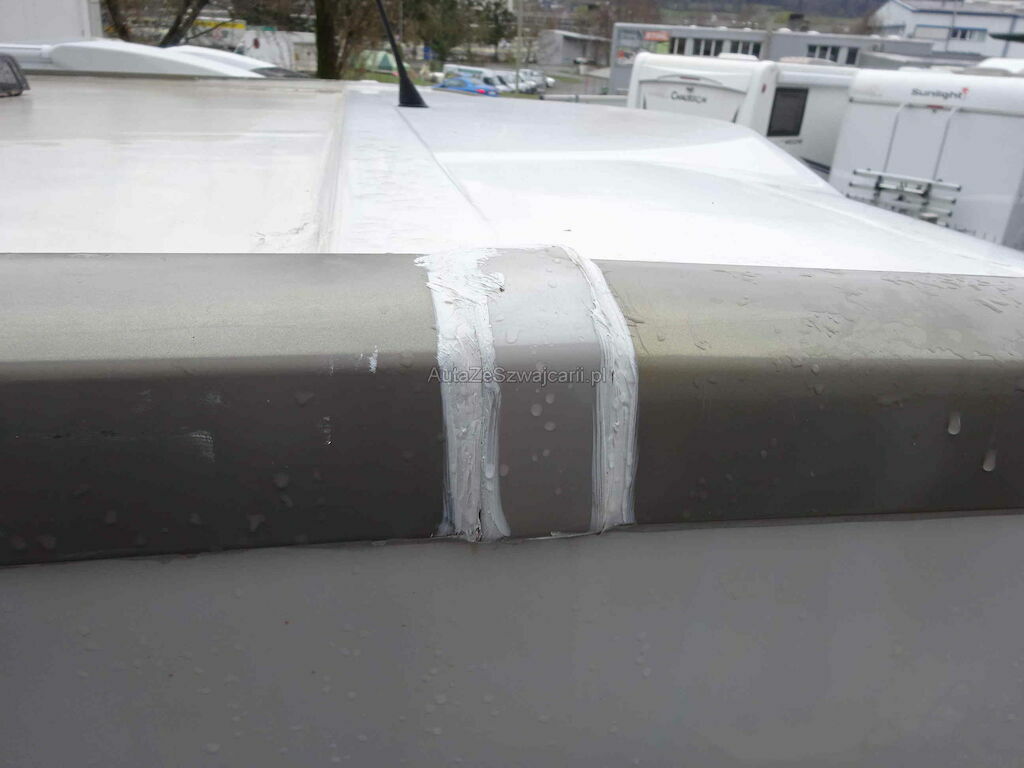 Dach v.re undicht Wasser lief rein Seitenwand re,Teile des Dachs, evt auch des Bodens mit Wasser vollgesogen und verzogen.