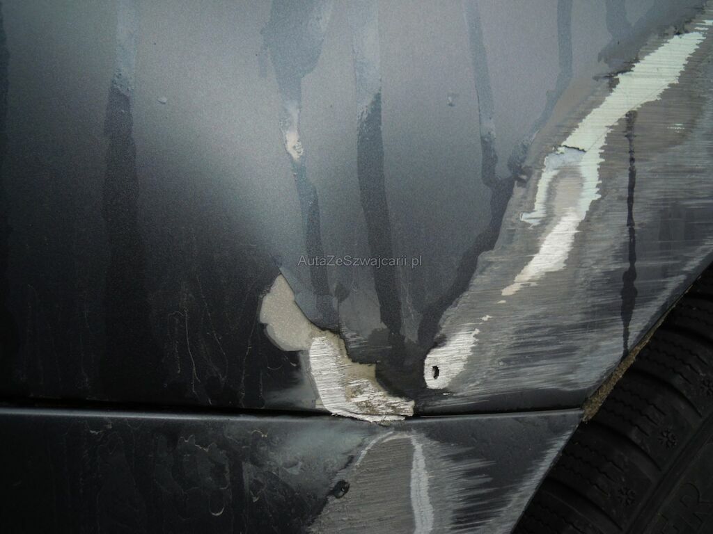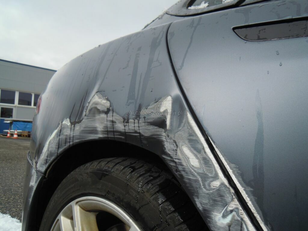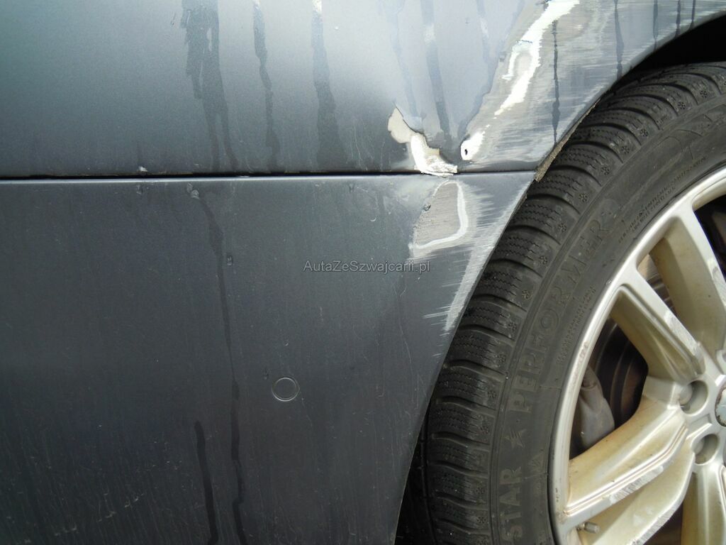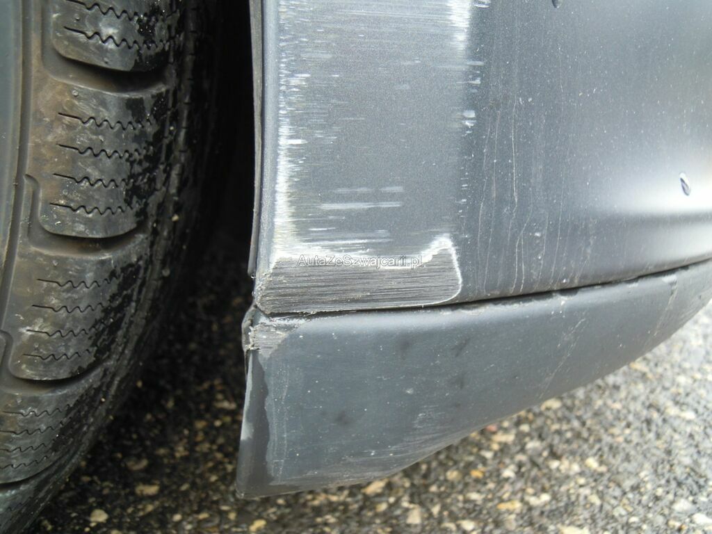Dommage zone latérale droite: Pare-chocs avant, spoiler inférieur, pare-chocs arrière grffés, rétroviseur griffé et usé (trou), aile avant déformée, gonflée et griffée, support de phare cassé, porte arrière griffée, aile arrière fortement déformée, griffée et usée (trou), jantes griffées, jeu dans la crémaillère de direction (env. 2 cm ressenti dans le volant).
