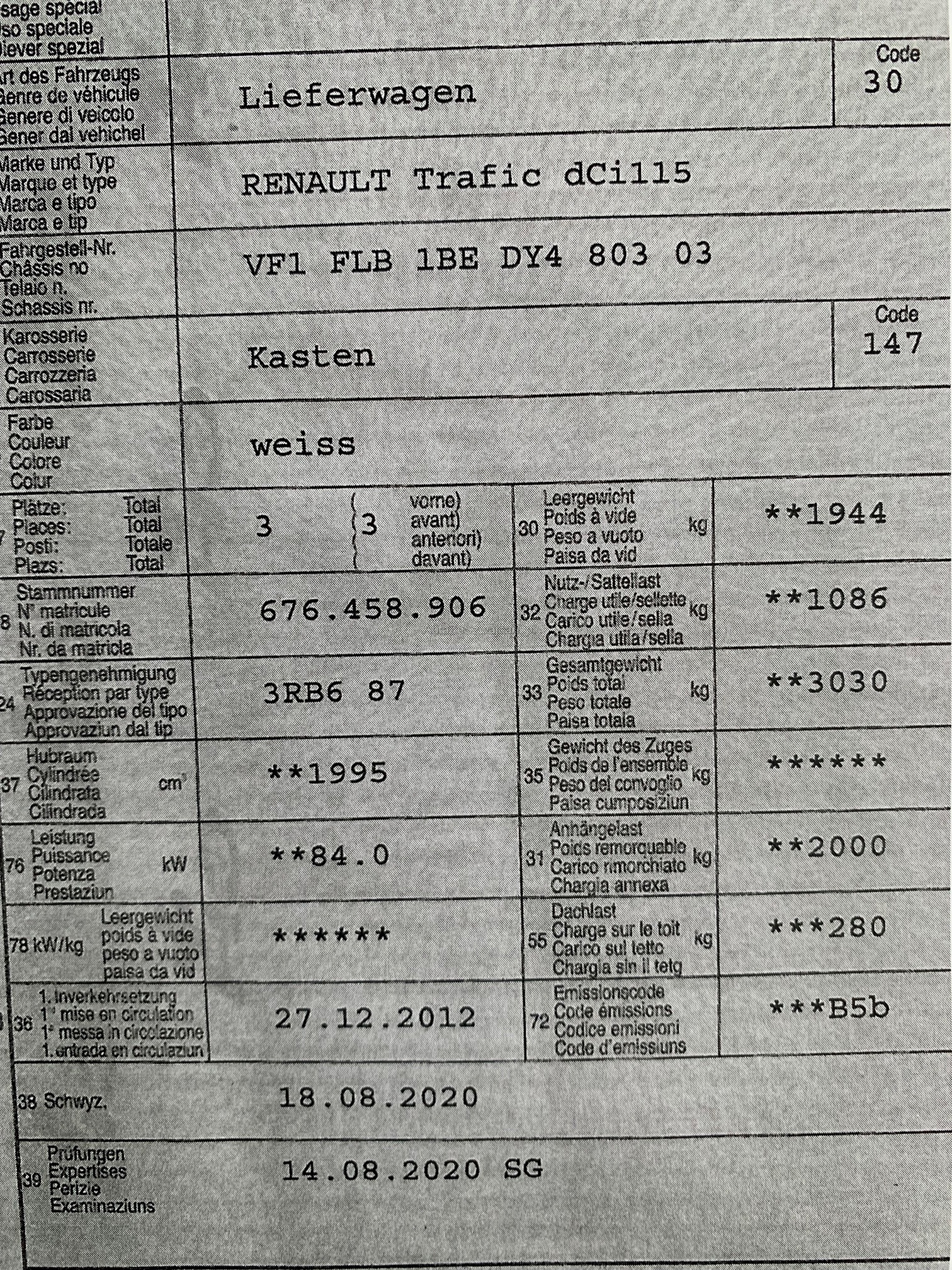 | Kommentar | Im November 2025 wurde ein neuer Partikelfilter montiert. Das Fahrzeug hat ein Regenerierungsproblem. Wir haben die Regenerierung via Testgerät gemacht jetzt wieder Ok Läuft einwandfrei, aber keine Lösung des Problems. Wir haben keine Diagnose gemacht. Letzte MFK 11.2025. Innenausbau im Laderaum wird ausgebaut und gehört somit nicht ins Inserat. Einspritzung prüfen leuchtet keine Diagnose gemacht Am Fahrzeug wurde kein Werkstatttest gemacht (Für sichtbare oder nicht sichtbare Mängel wird nicht gehaftet). Wir testen und kontrollieren nicht alle Funktionen vom Fahrzeug. Das Risiko liegt somit vollumfänglich beim Käufer. Um Missverständnisse zu vermeiden kann das Fahrzeug auf Voranmeldung besichtigt und getestet werden, sollten Sie davon bewusst kein Gebrauch machen dann liegt die Verantwortung bei Ihnen. Nachdem der Höchstbietende den Zuschlag erhalten hat, gibt es keine Nachverhandlung, auch wenn nicht deklarierte Mängel zum Vorschein kommen sollten. Ab Platz ohne Garantie, Wandelung und Minderung werden wegbedungen. |