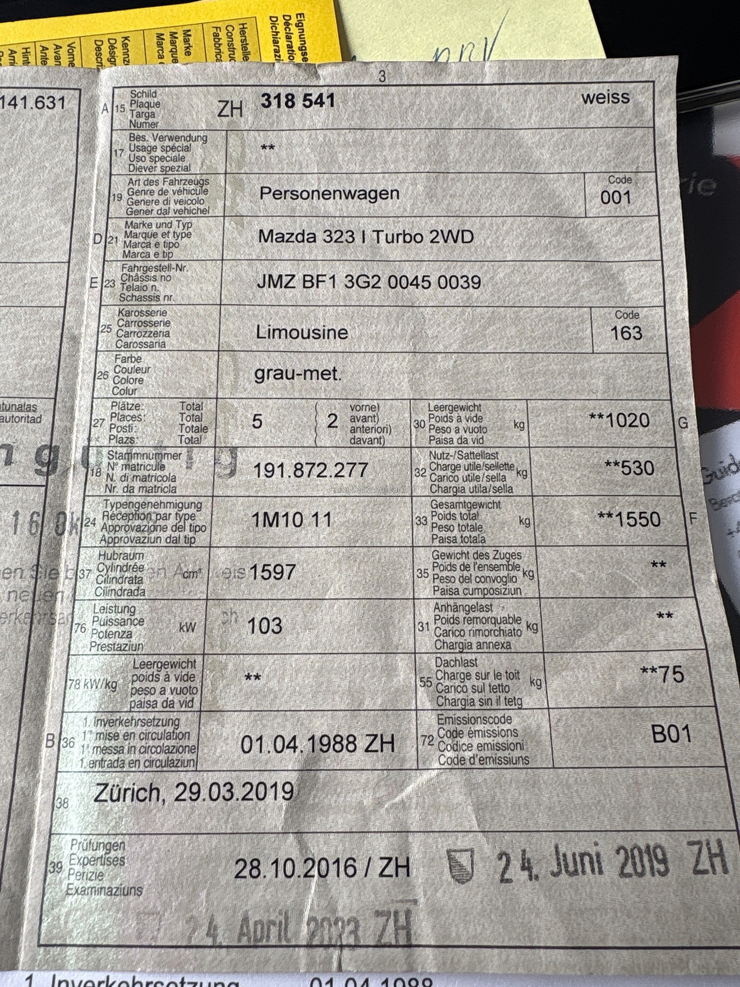| Kommentar | Biete hier einen sehr seltenen Mazda 323 BF Turbo 16V 2WD an! Fahrzeug hat kein Rost und sieht von unten aus wie neu. Diesen Monat wurde der Zahnriemen inkl Keilriemen ersetzt. Tieferlegung inkl neuen Stossdämpfer und neue 16“ OZ Felgen inkl neuen Reifen. Fast alle Fahrwerksteile wurden ersetzt. Frisch ab großem Service. Fahrzeug läuft einwandfrei und ist ein sehr sehr seltenes Exemplar. Rost Dohmlager und Radlauf hl und re wurde frisch gemacht. Preisvorstellung 9500.- Frisch ab MFK |