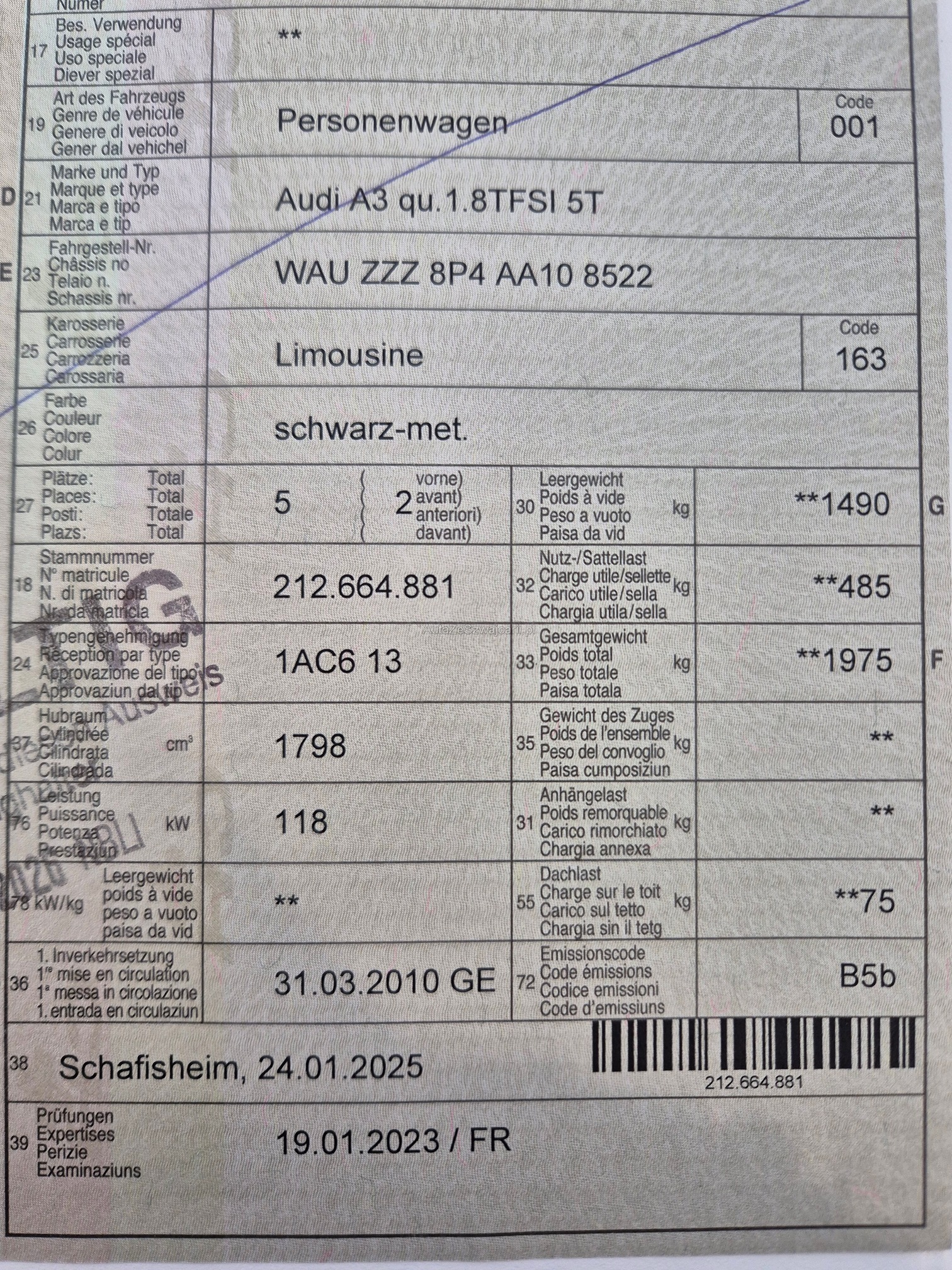 | Kommentar | Am Fahrzeug wurde kein Werkstatttest gemacht (Für sichtbare oder nicht sichtbare Mängel wird nicht gehaftet). Wir testen & kontrollieren nicht alle Funktionen vom Fahrzeug. Das Risiko liegt somit vollumfänglich beim Käufer. Nachdem der Höchstbietende den Zuschlag erhalten hat, gibt es keine Nachverhandlung, auch wenn nicht deklarierte Mängel zum Vorschein kommen sollten. Ab Platz ohne Garantie, Wandelung und Minderung werden wegbedungen. Abholung nach Zuschlag innert 5 Tagen. Das Fahrzeug kann vorgängig am Steinackerweg 12 in 4322 Mumpf besichtigt werden. |