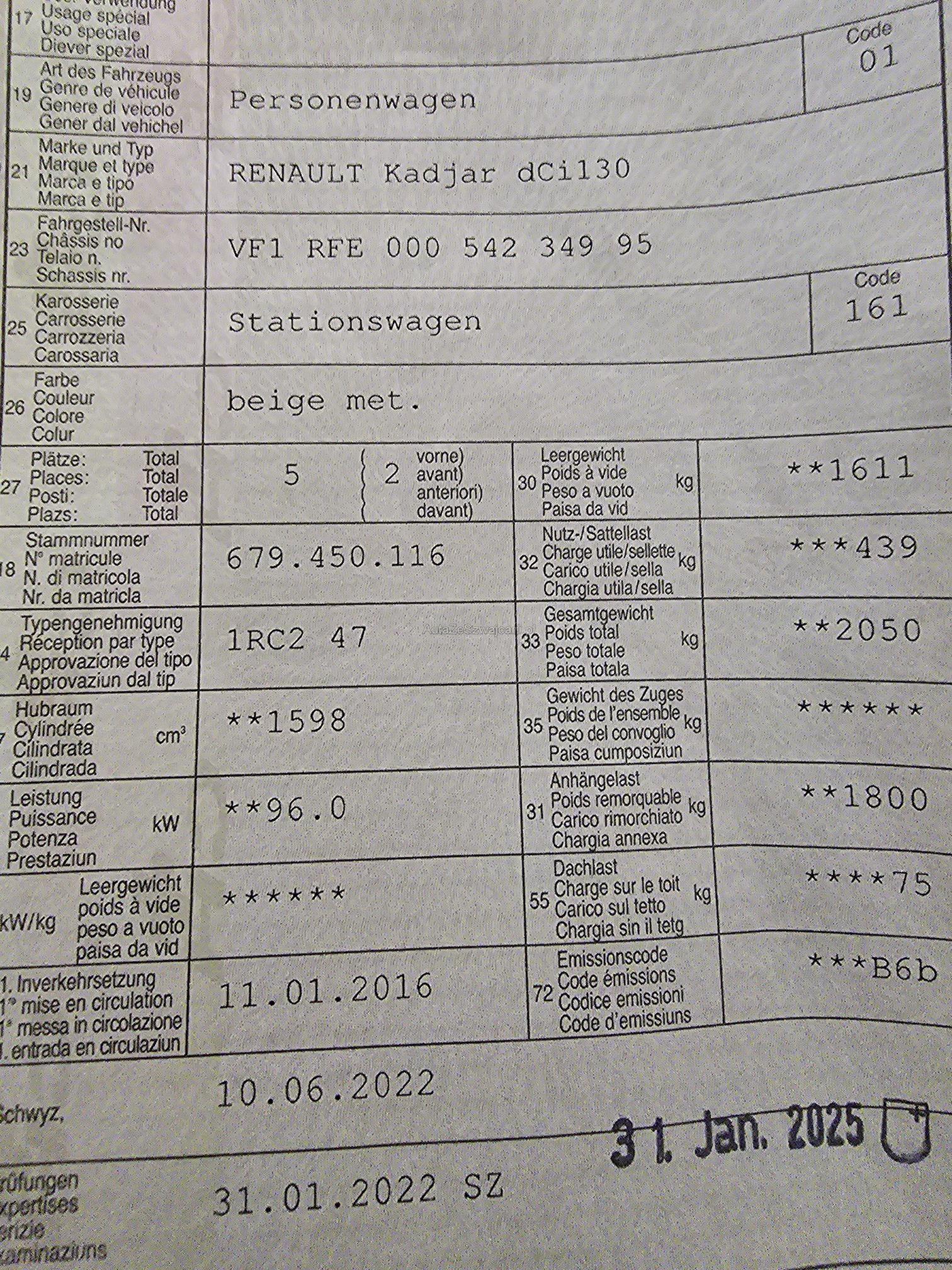 | Kommentar | Gepflegter Renault Kadjar 4x4 1.6dci. Fahrzeug aus 1.Hand der Service wurde Jährlich gemacht. Fahrzeug verfügt über eine AHK war aber nur für einen Veloträger in Gebrauch. Service ist fällig und Sommerreifen sind zu ersetzen . Fahrzeug fährt schaltet und funktioniert einwandfrei Keine mechanische oder technische Prüfung verkauf ab Platz. Diverse kleinere Gebrauchsspuren (siehe Bilder) |