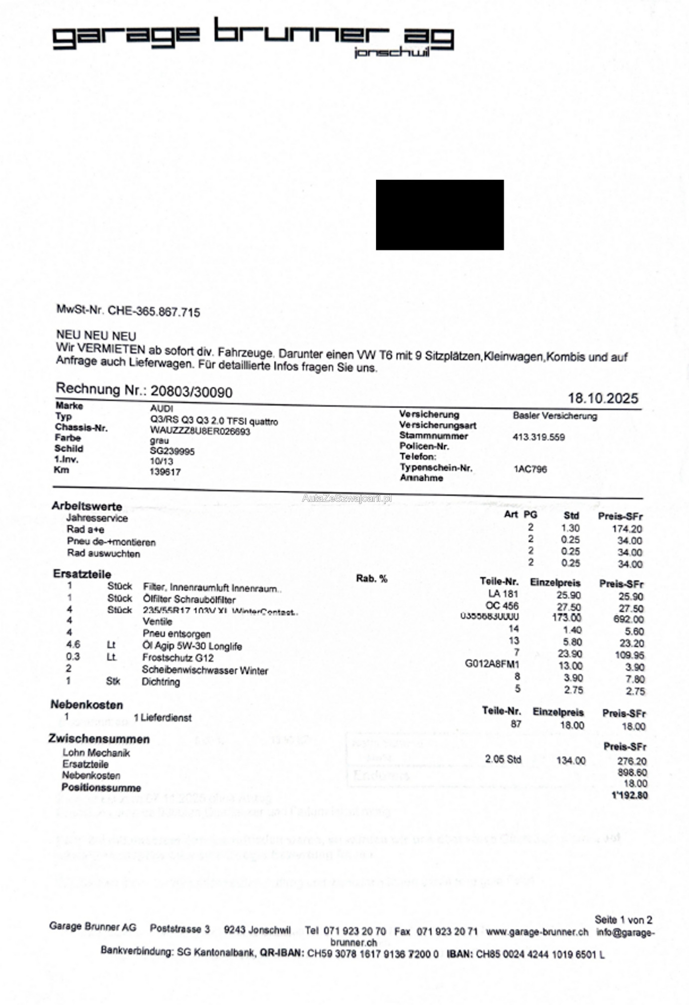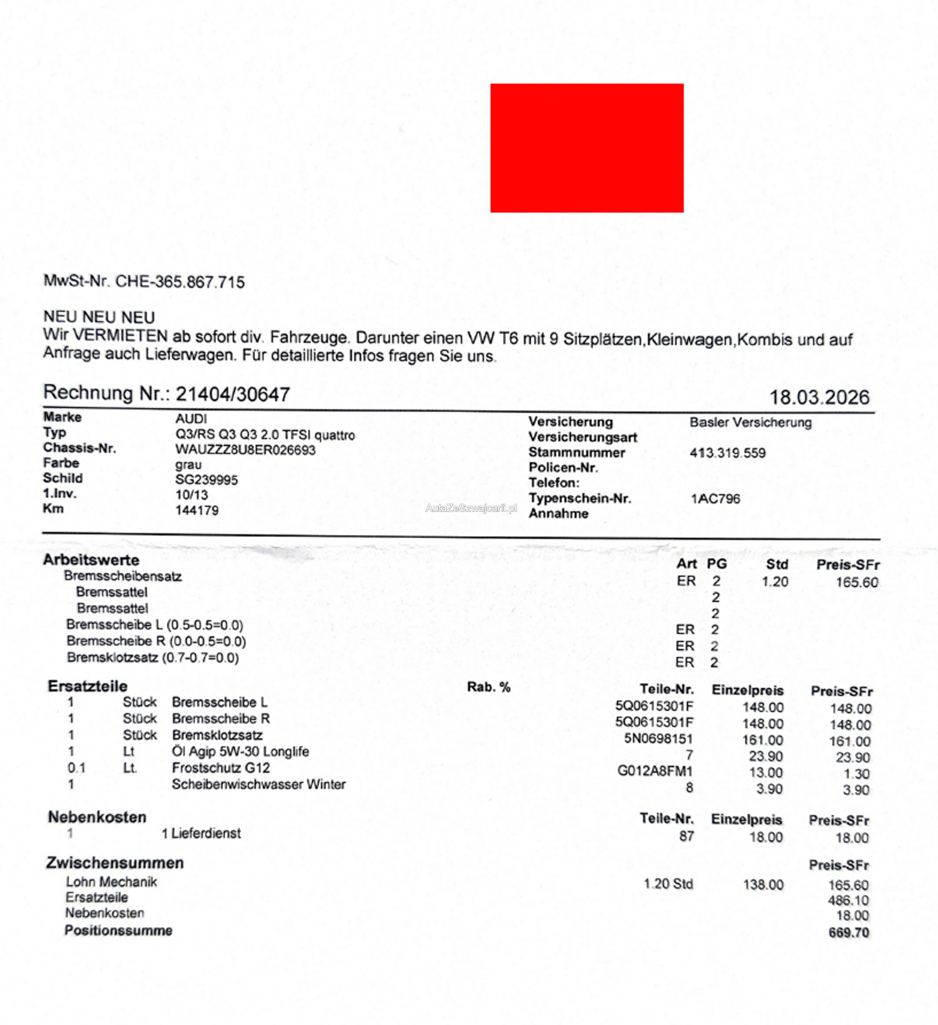 | Kommentar | Verkauf ausschließlich ab Platz, jede Gewährleistung, somit nach Gesetz möglich wird wegbedungen, insbesondere sind Wandelung und Minderung ausgeschlossen. Der technische Zustand ist unbekannt, das Fahrzeug wurde nicht geprüft. Zustand wie auf den Bildern, kann jedoch bei der Abholung abweichen. Sämtliche Mängel sind Sache des Kunden. Keine Rücknahme, keine Nachverhandlung, kein Preisnachlass, Kauf erfolgt wie gesehen. |