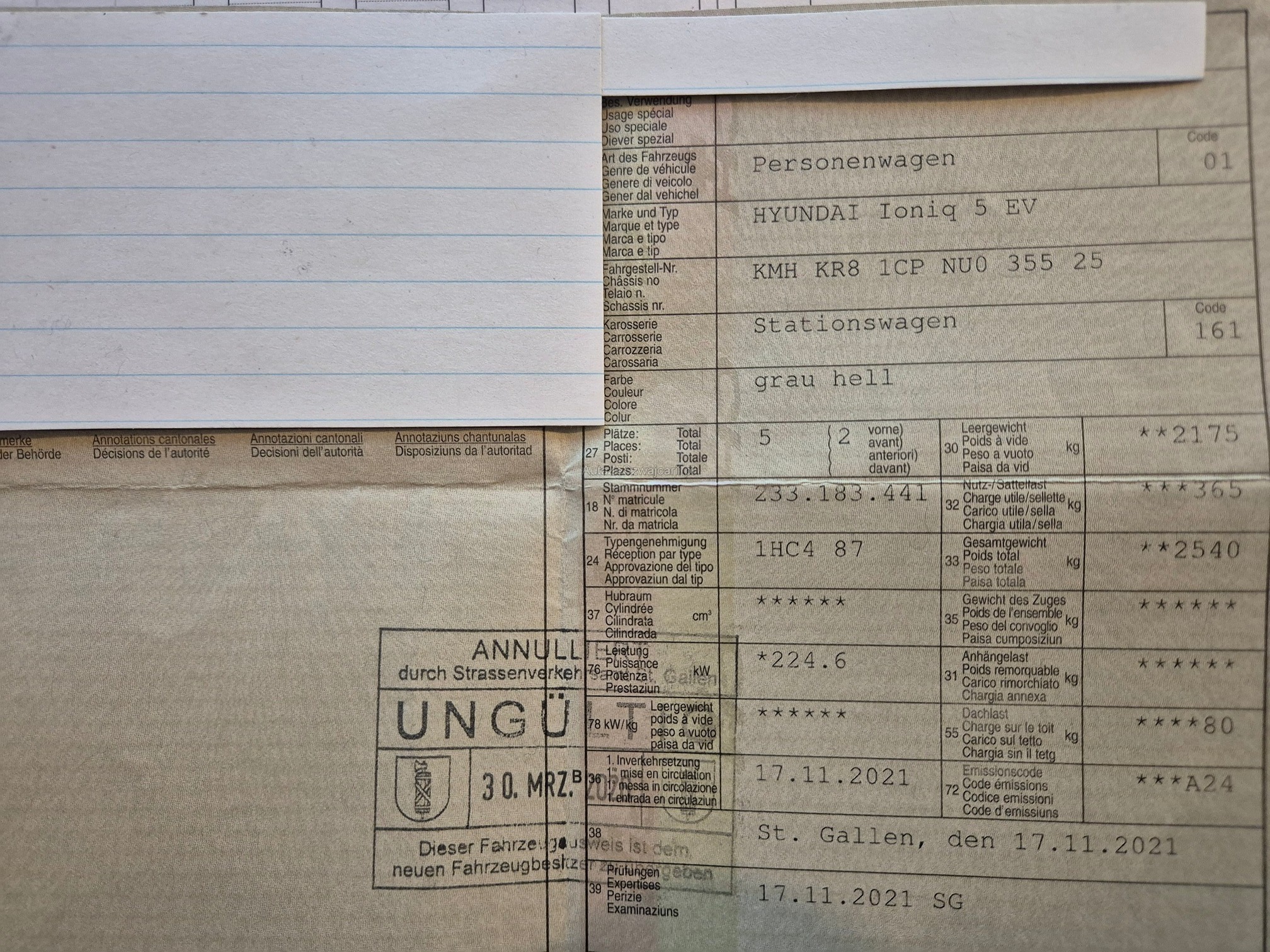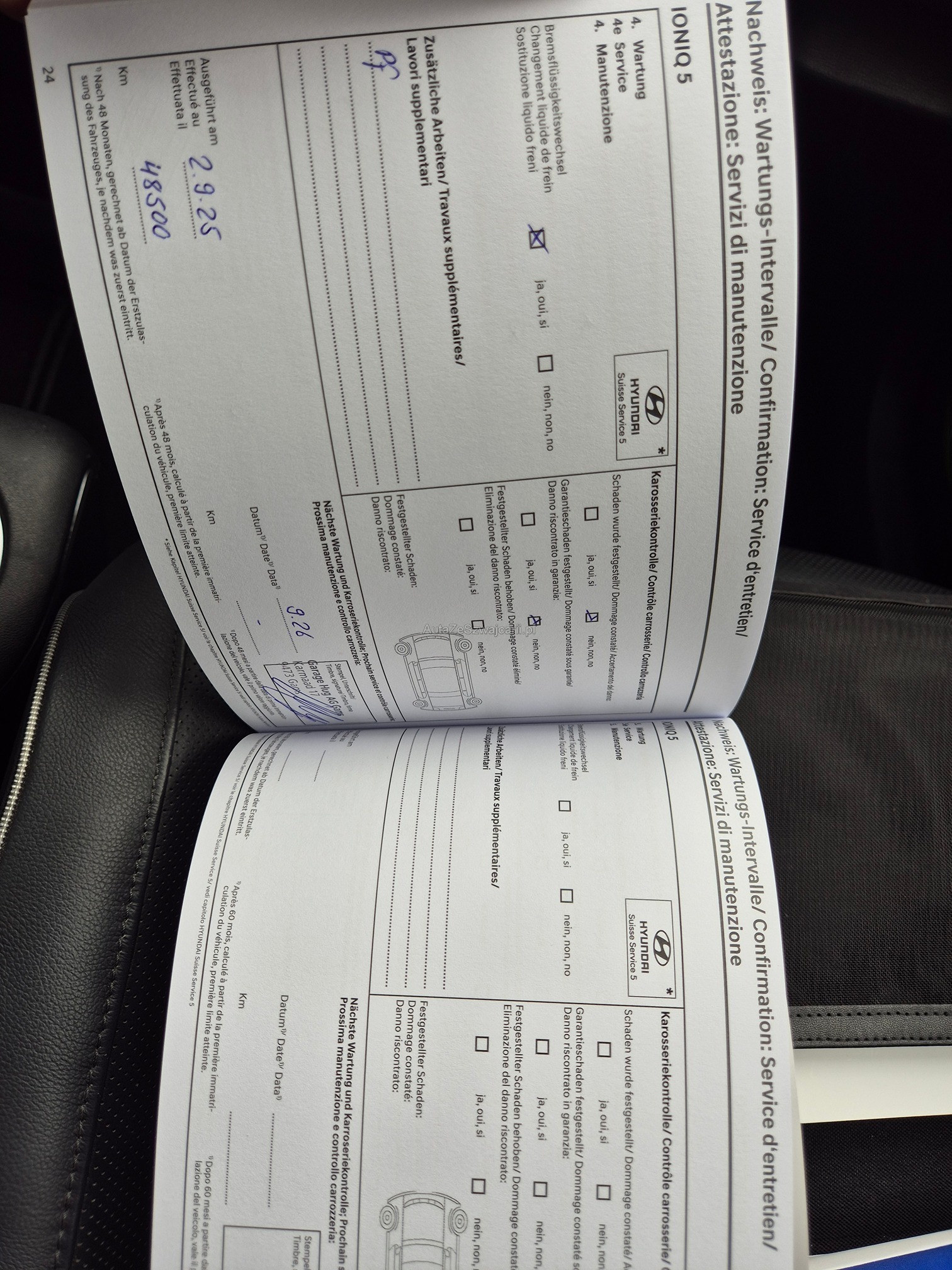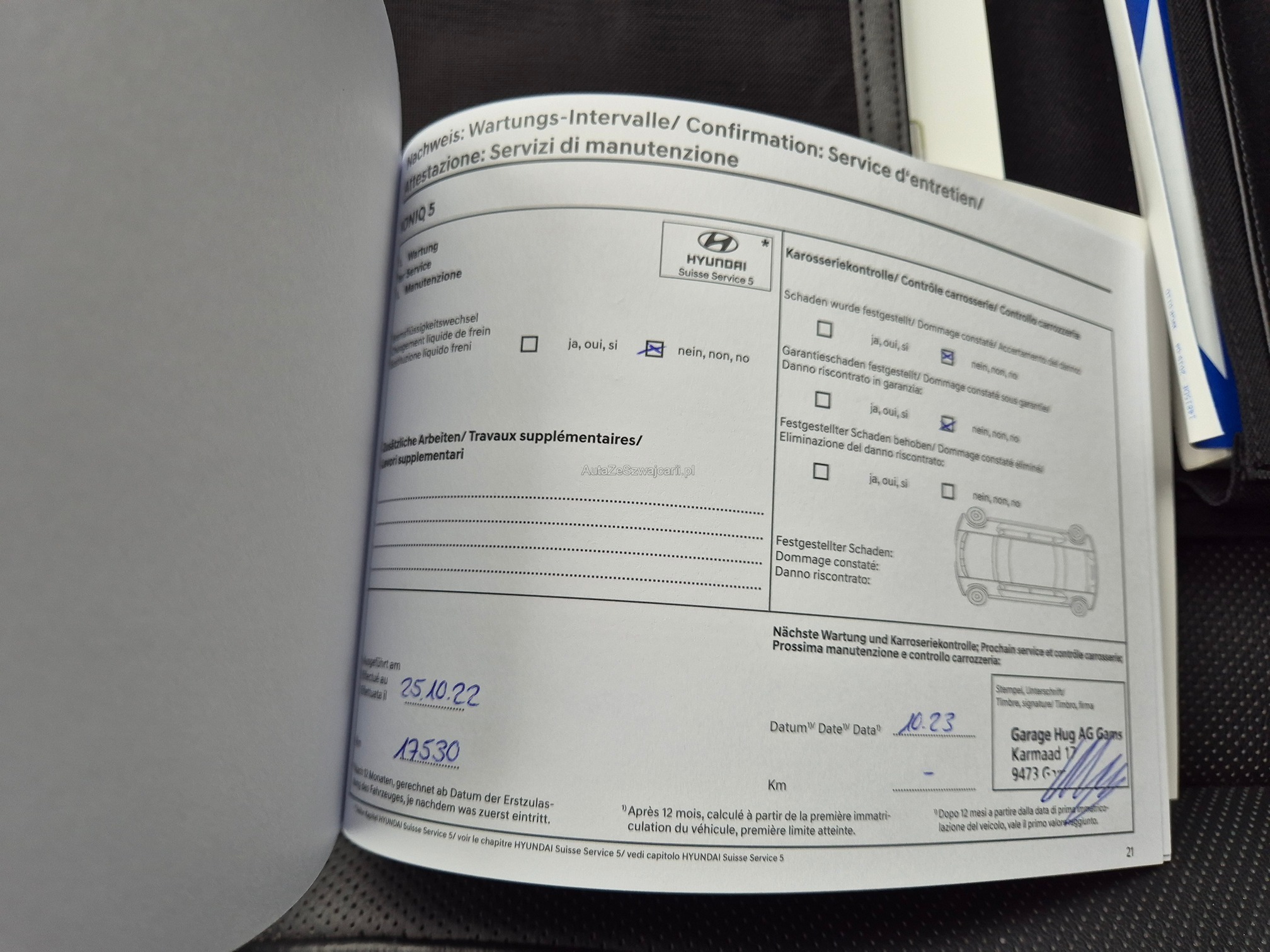 | Kommentar | Winterpneu und Sommerpneu sollten ersetzt werden (Alter) Fortlaufende Werksgarantie bis 16.11.2026 - Kratzer Türe hinten rechts unten (Plastik) - Kratzer Stossstange hinten links unten (Plastik) Sonst keine Mängel bekannt! Wir testen & kontrollieren nicht alle Funktionen vom Fahrzeug. Das Risiko liegt somit vollumfänglich beim Käufer. Nachdem der Höchstbietende den Zuschlag erhalten hat, gibt es keine Nachverhandlung, auch wenn nicht deklarierte Mängel zum Vorschein kommen sollten. Ab Platz ohne Garantie, Wandelung und Minderung werden wegbedungen. |