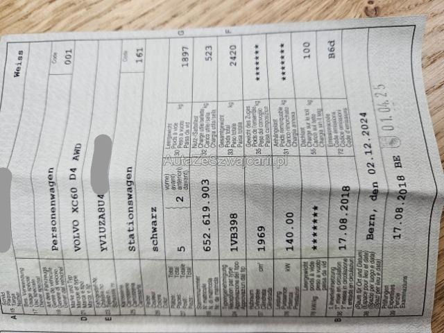 | Condition_and_Equipment | Zustand Fahrzeug ist NICHT fahrbar. Fahrzeug ist rollbar. Sonstiges Fahrzeugdokumente vorhanden. Schlüssel Nur ein Schlüssel vorhanden. --- Links Tür hinten links ist eingedrückt. Heck Heck links eingedrückt. Heck rechts eingedrückt. Seitenwand hinten links eingedrückt/ausgestaucht. Achse Hinterachse links beschädigt. Innenraum Kopfairbag links ausgelöst. Dachhimmel gerissen. Weitere Beschädigungen Vorschäden: - Stossstange vorne Kratzer --- Serienaustattung Airbag Fahrer und Beifahrerseite Elektrische Fensterheber vorne + hinten Aussenspiegel elektrisch verstellbar und heizbar Tempomat Bordcomputer Zentralverriegelung mit Fernbedienung Lederlenkrad Lenkrad verstellbar Höhenverstellbare Vordersitze elektrisch SIPS Kopf-/ Schulterairbag Lederschalthebel Dachreling Alu Deaktivierung Beifahrerairbag Antibeschlagssensor Zwei Zonen-Klimaautomatik Mittelarmlehne vorne mit Staufach Laderaumrollo IDIS Fahrerinformationssystem WHIPS Schleudertrauma-Schutzsystem Regen- und Lichtsensor SIPS Seitenairbag Fahrer und Beifahrerseite Knieairbag Fahrer Dieselpartikelfilter Hill Descent Control HDC ABS und EBD Elektr. Bremskraftverteilung Automatische Parkbremse Berganfahrhilfe Aktivkohlefilter mit automatischer Umluftschaltung Einparkhilfe hinten Leichtmetallräder 18" 5-Doppelspeichen Reifendruck-Sensoren TPMS Polsterung Textil/ T-Tec Stop + Start System Spurhalteassistent LKA Audiosystem High Performance Keine Gewähr auf die Angaben der Serienausstattungen DAS Driver Alert/ Assistenzsystem Lendenwirbelstützen elektr. für Vordersitze VSP Volvo Swiss Premium Verkehrsschild-Erkennungssystem City Safety inkl. Kreuzungsbremsassistent Volvo On Call VOC inkl. WiFi Hotspot LED-Scheinwerfer mit Fernlichtassistent ESC Fahrdynamikregelung Sonderausstattung Pack Winter Leichtmetallräder 19" 5-Doppelspeichen DAB+ Digital Audio Broadcast LED-Nebelscheinwerfer Pack Business Connect |