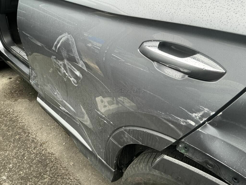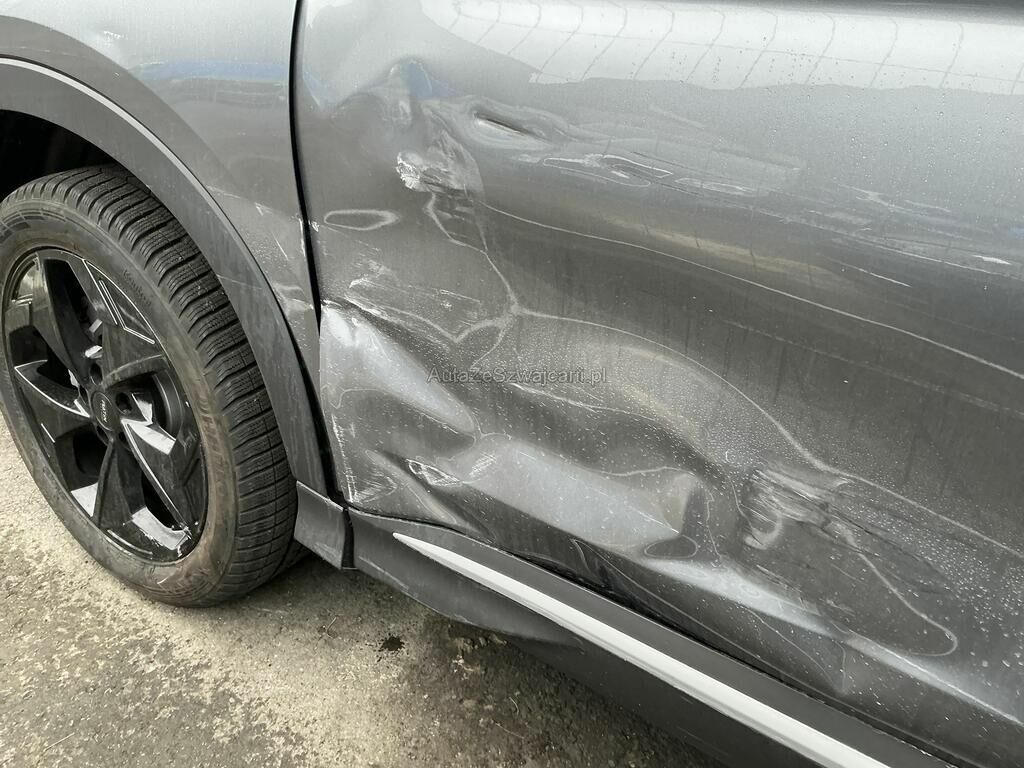 Collision du flanc gauche puis choc jante arrière droite: ailes, portes, poignées, moulures, rétroviseur, jantes, feu, pare-chocs, trains roulant et suspension endommagés.