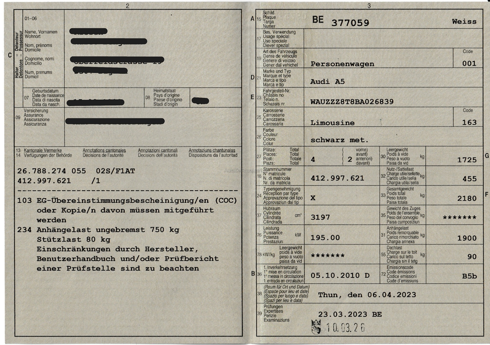 | Kommentar | «Das Fahrzeug wurde keinem Test unterzogen! Der Käufer überzeugt sich vorgängig selbst vom Zustand des Fahrzeuges. Jede Gewährleistung wird wegbedungen, insbesondere sind Wandelung und Minderung ausgeschlossen. Eine Garantie wird nicht gewährt.» Mögliches Eintauschfahrzeug, Fahrzeug wird noch bewegt. |