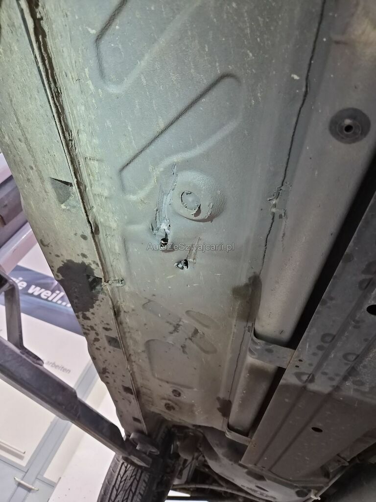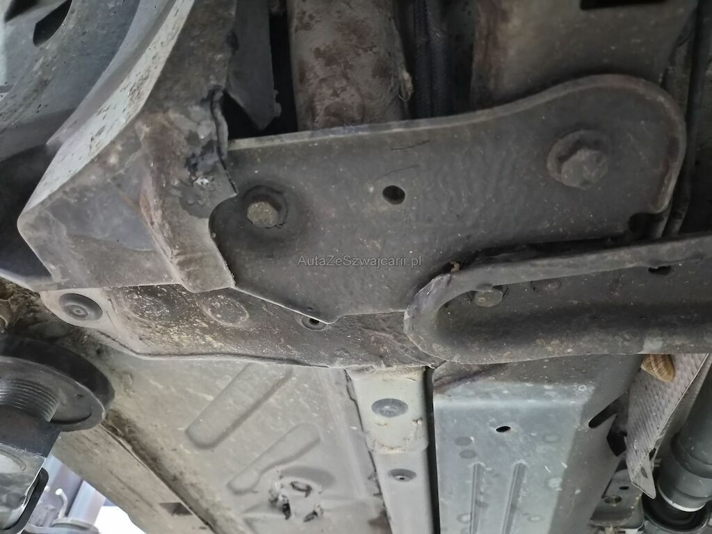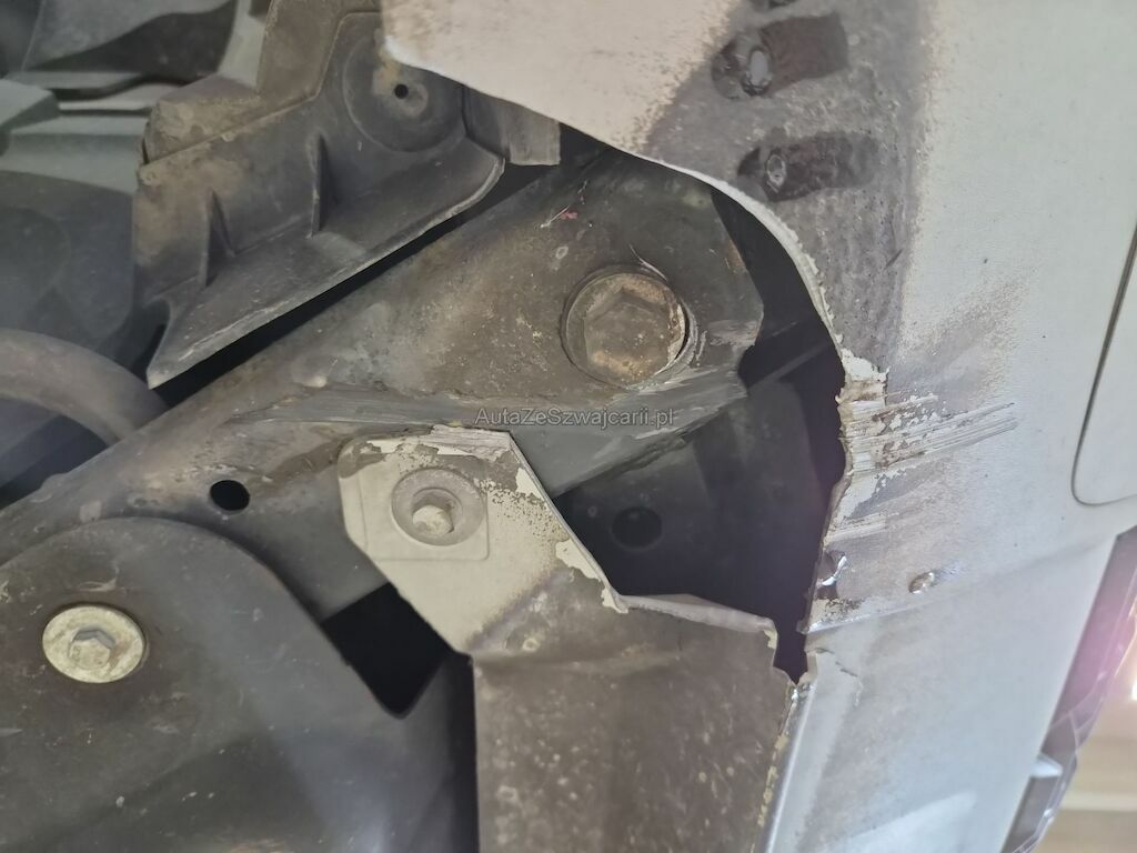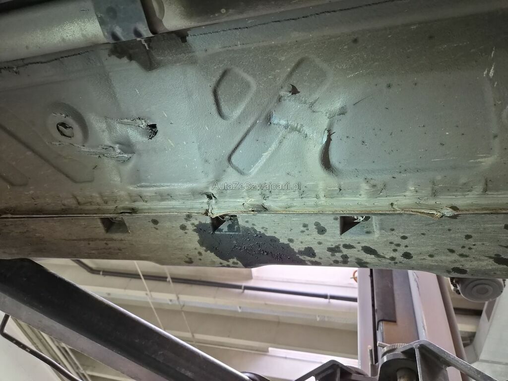 Unfallschaden durch Aufprall unterhalb des Fahrzeugs auf der rechten Seite mit Beschädigungen am Querträger, am Motorträger, am Bodenblech, am Hinterrad sowie diversen Anbauteilen