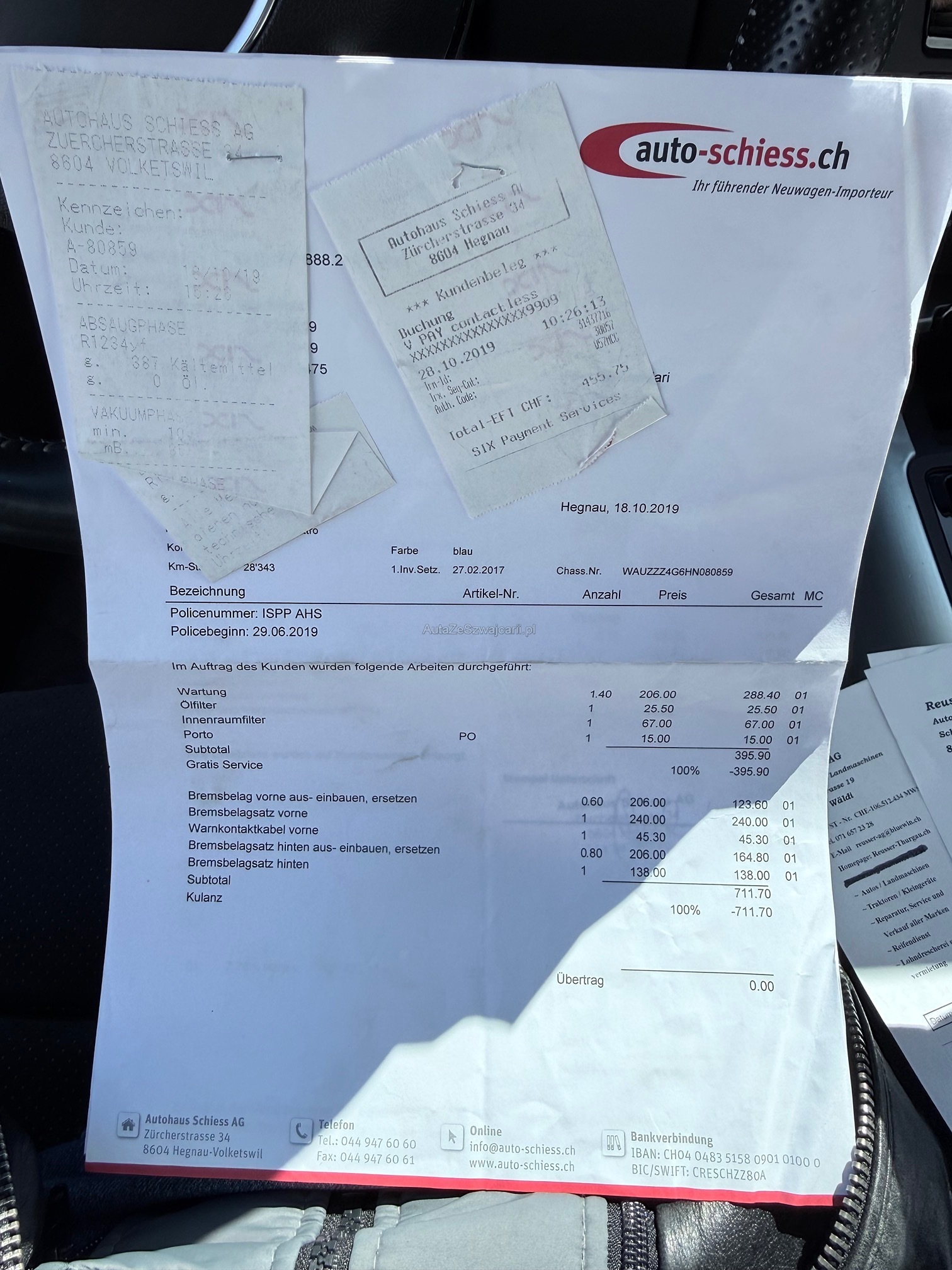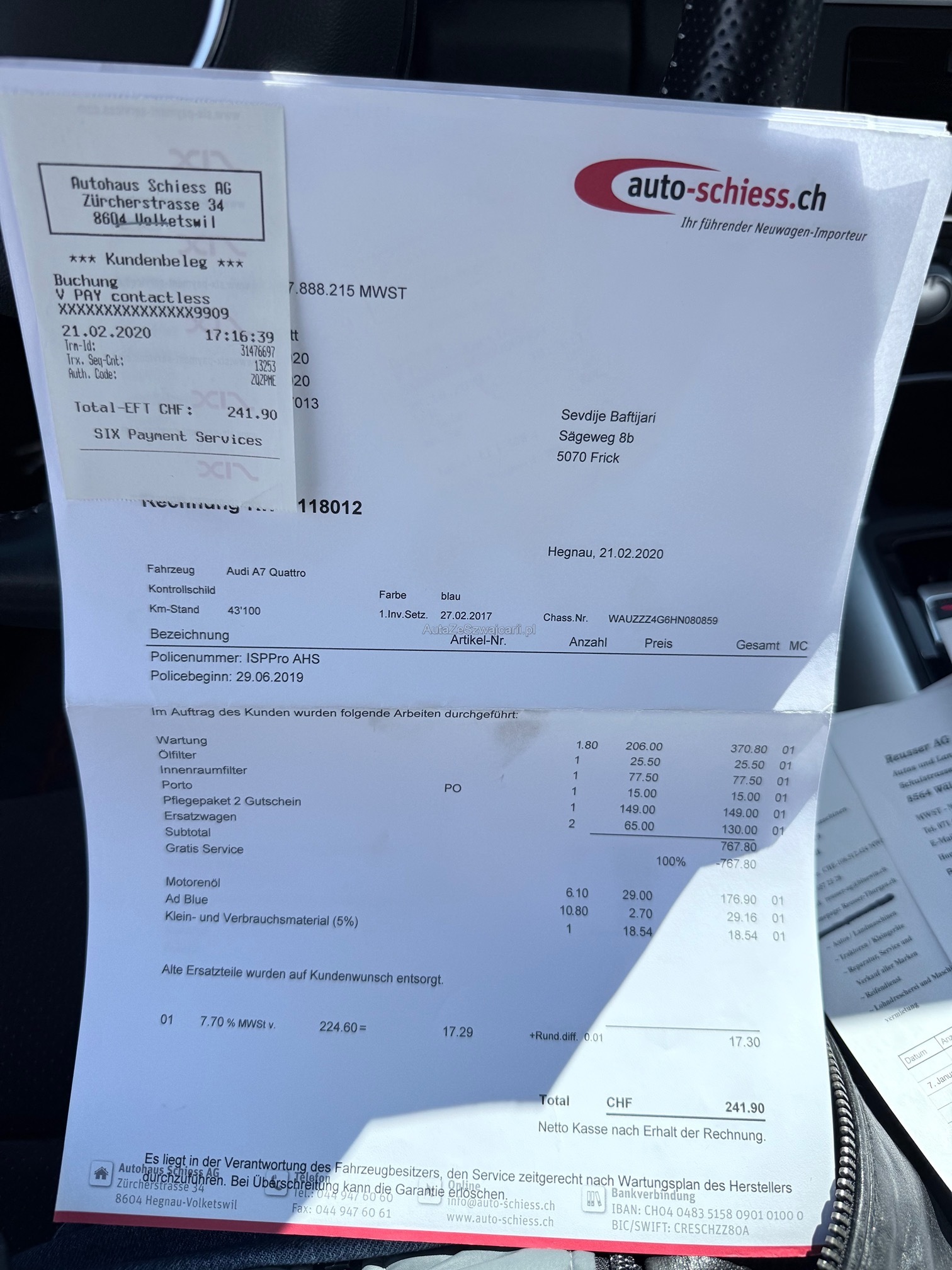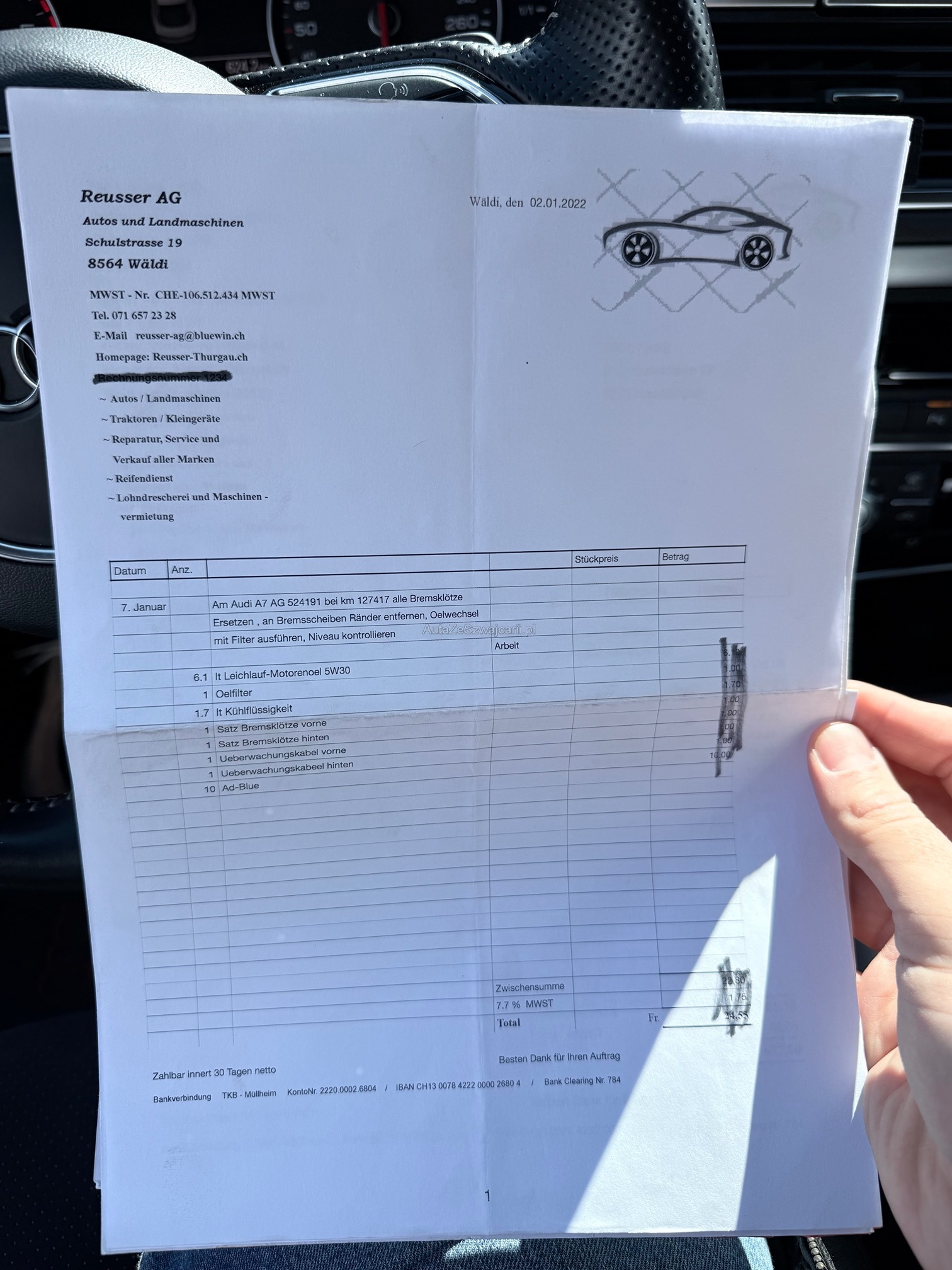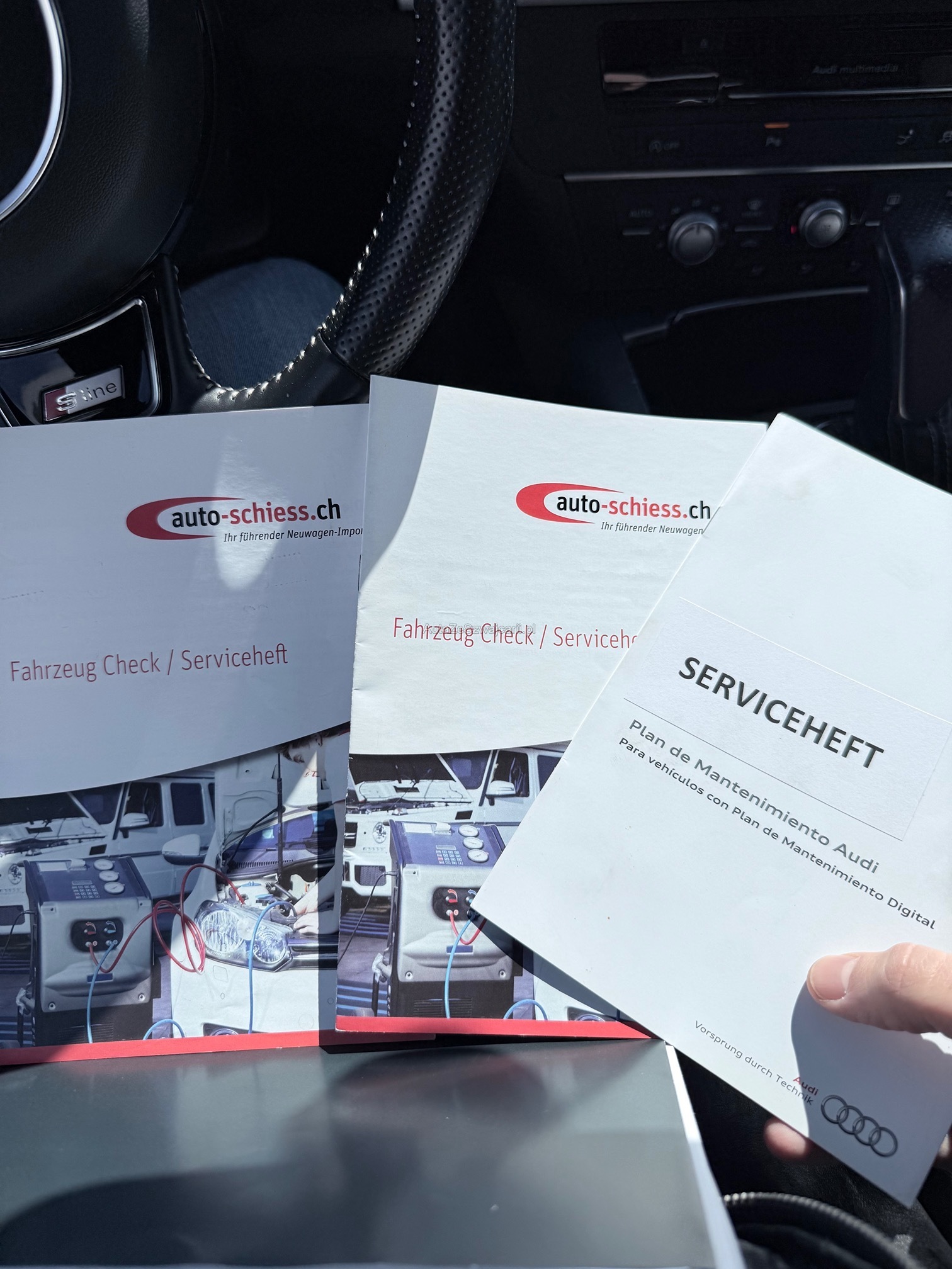 | Kommentar | Fahrzeug ist schwarz matt foliert; Originallack ist dunkelblau 2 Schlüssel; 4-fach bereift Sommer Aluminium bei Mittelkonsole teilweise gedellt und verkratzt sowie Leder in diesem Bereich ebenfalls leicht beschädigt; Fach bei Mittelarmlehne löst sich der Stoff; 1x leichte Blasenbildung auf Folie bei Haube; Vorne links kleiner Schaden an Stossfänger; Vorne unten rechts kleine Beschädigung an Spoilerlippe; Drehknopf für Helligkeit der Innenraumbeleuchtung fehlt Ansonsten ist das Fahrzeug für die Laufleistung in gepflegtem Zustand. Uns sind bei der Probefahrt keine Mängel aufgefallen. Ohne jede Garantie. Zustand gemäss Bilder. Ungereinigt ab Platz. Es wurde kein Test am Fahrzeug vorgenommen. Für sichtbare und unsichtbare Mängel wird keine Haftung übernommen. Kauf auf eigenes Risiko. Jede Gewährleistung, soweit nach Gesetz möglich, wird wegbedungen. Insbesondere sind Wandelung und Minderung ausgeschlossen. |