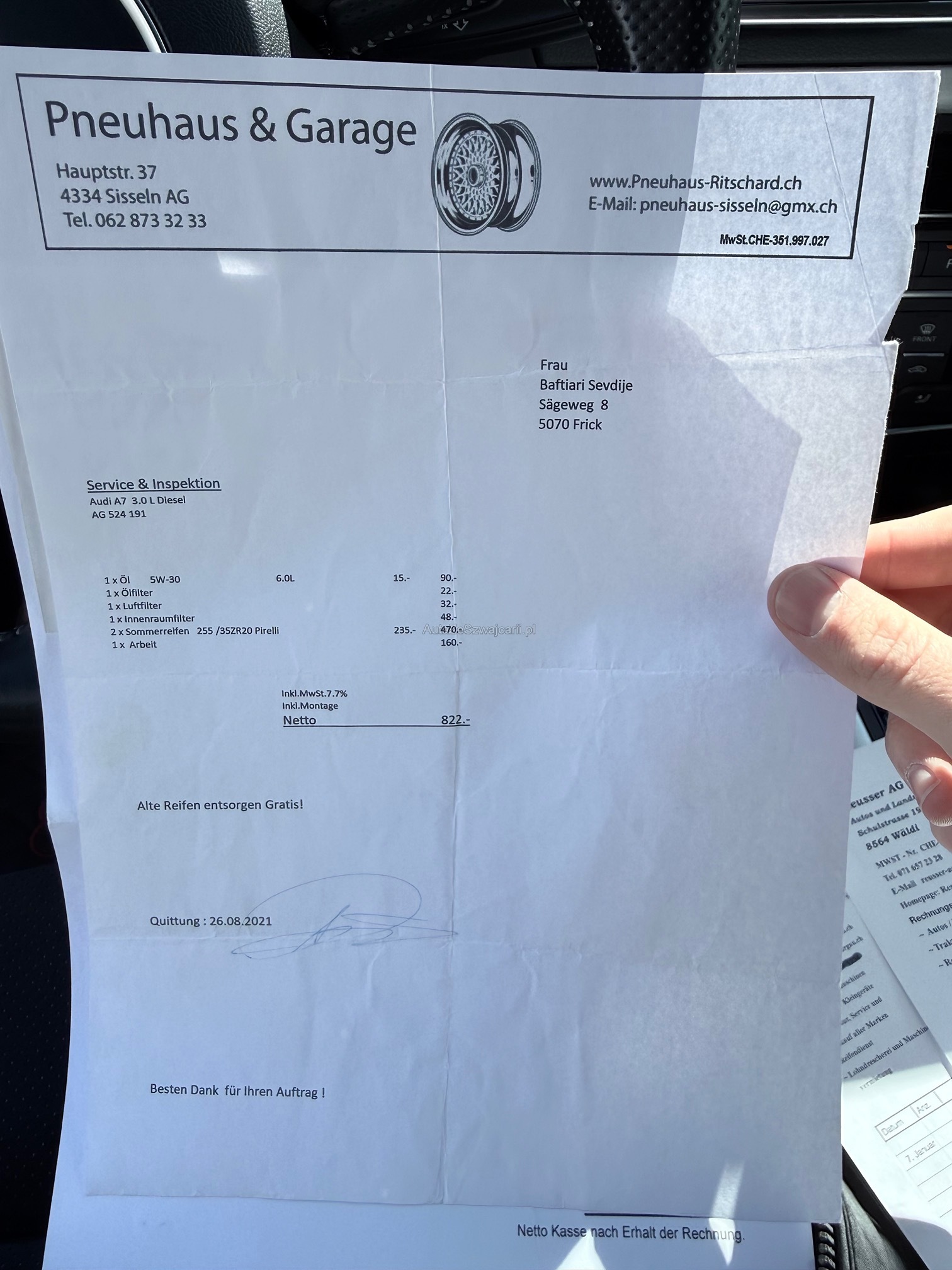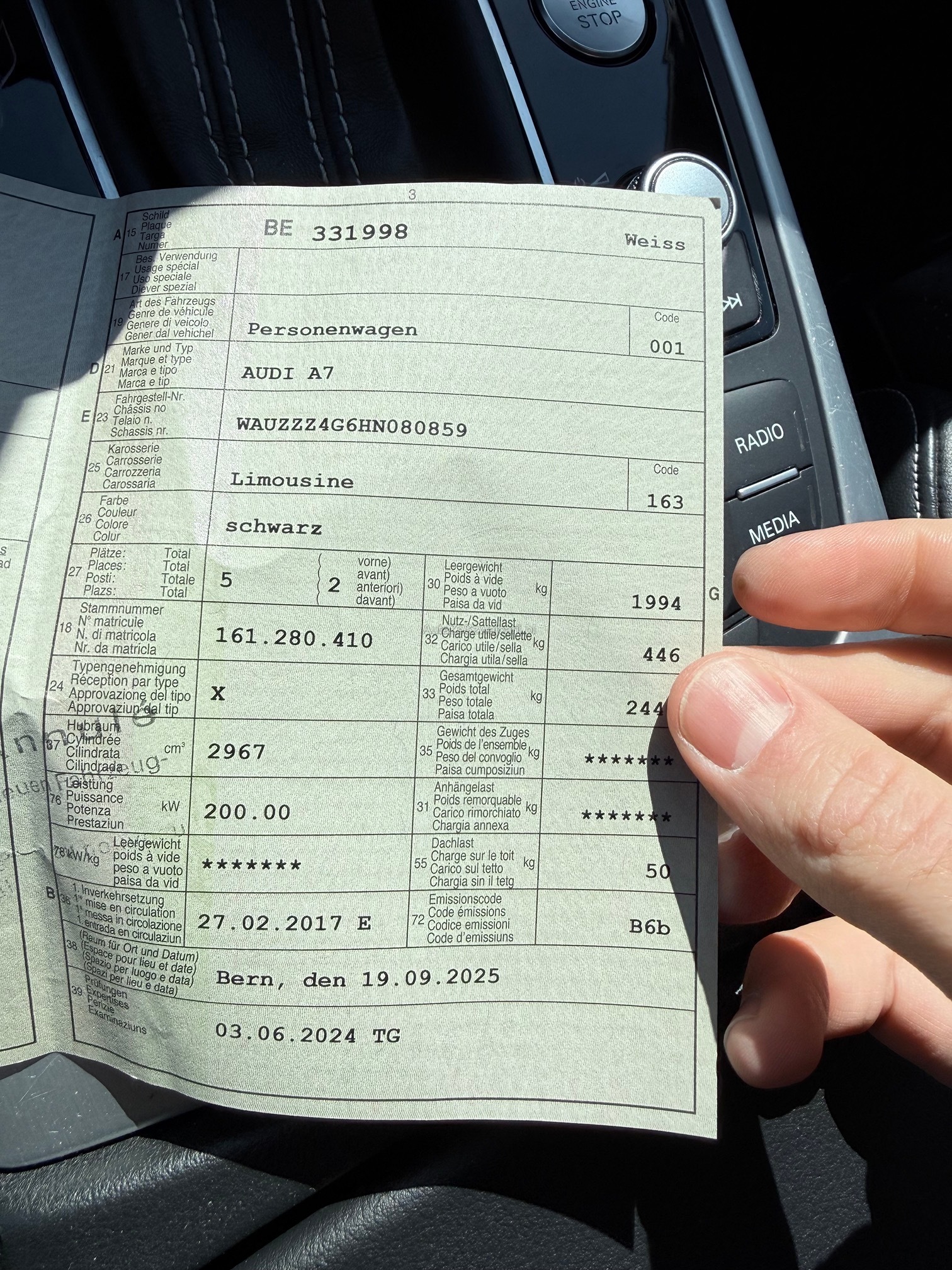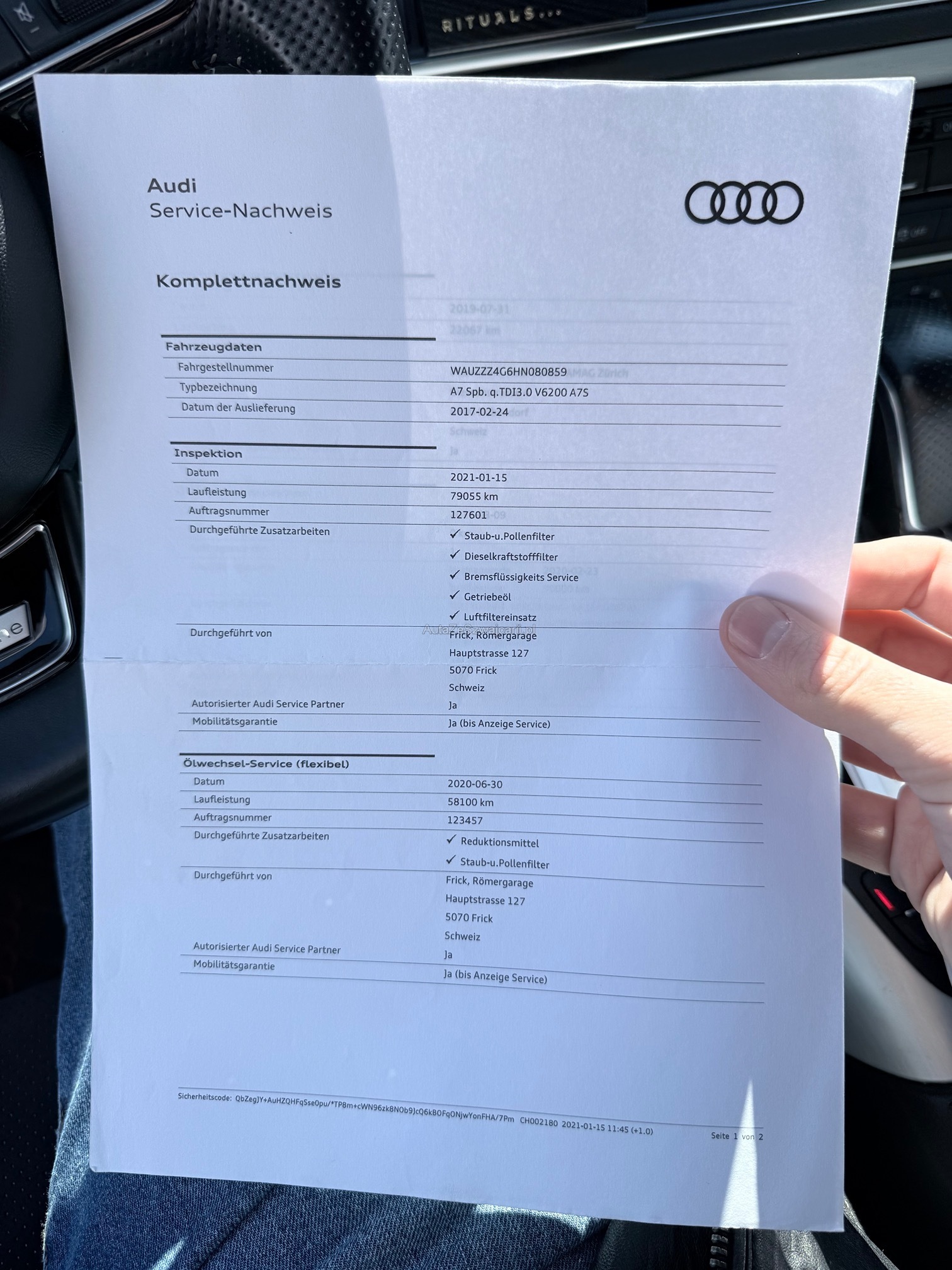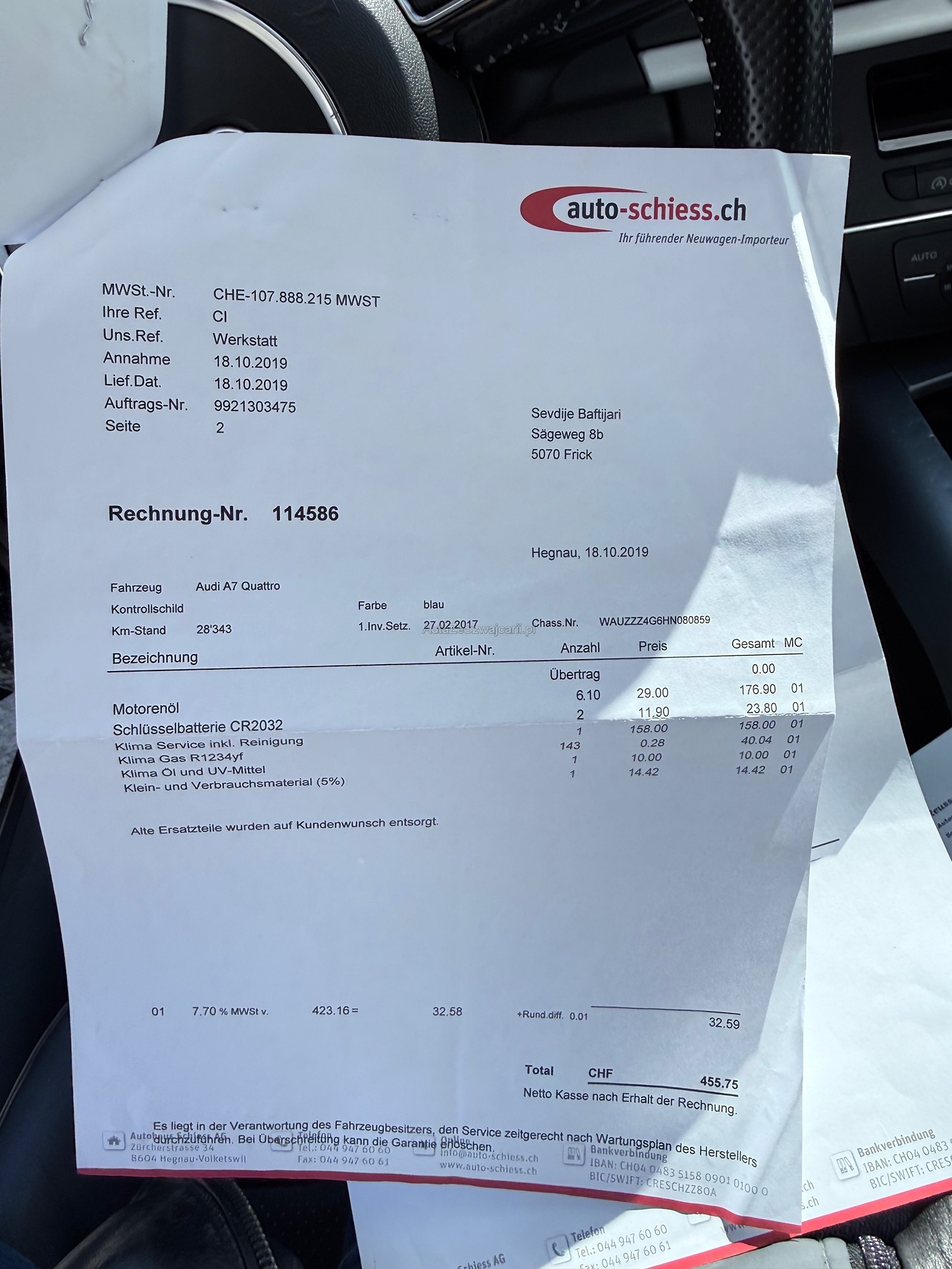| Kommentar | Fahrzeug ist schwarz matt foliert; Originallack ist dunkelblau 2 Schlüssel; 4-fach bereift Sommer Aluminium bei Mittelkonsole teilweise gedellt und verkratzt sowie Leder in diesem Bereich ebenfalls leicht beschädigt; Fach bei Mittelarmlehne löst sich der Stoff; 1x leichte Blasenbildung auf Folie bei Haube; Vorne links kleiner Schaden an Stossfänger; Vorne unten rechts kleine Beschädigung an Spoilerlippe; Drehknopf für Helligkeit der Innenraumbeleuchtung fehlt Ansonsten ist das Fahrzeug für die Laufleistung in gepflegtem Zustand. Uns sind bei der Probefahrt keine Mängel aufgefallen. Ohne jede Garantie. Zustand gemäss Bilder. Ungereinigt ab Platz. Es wurde kein Test am Fahrzeug vorgenommen. Für sichtbare und unsichtbare Mängel wird keine Haftung übernommen. Kauf auf eigenes Risiko. Jede Gewährleistung, soweit nach Gesetz möglich, wird wegbedungen. Insbesondere sind Wandelung und Minderung ausgeschlossen. |