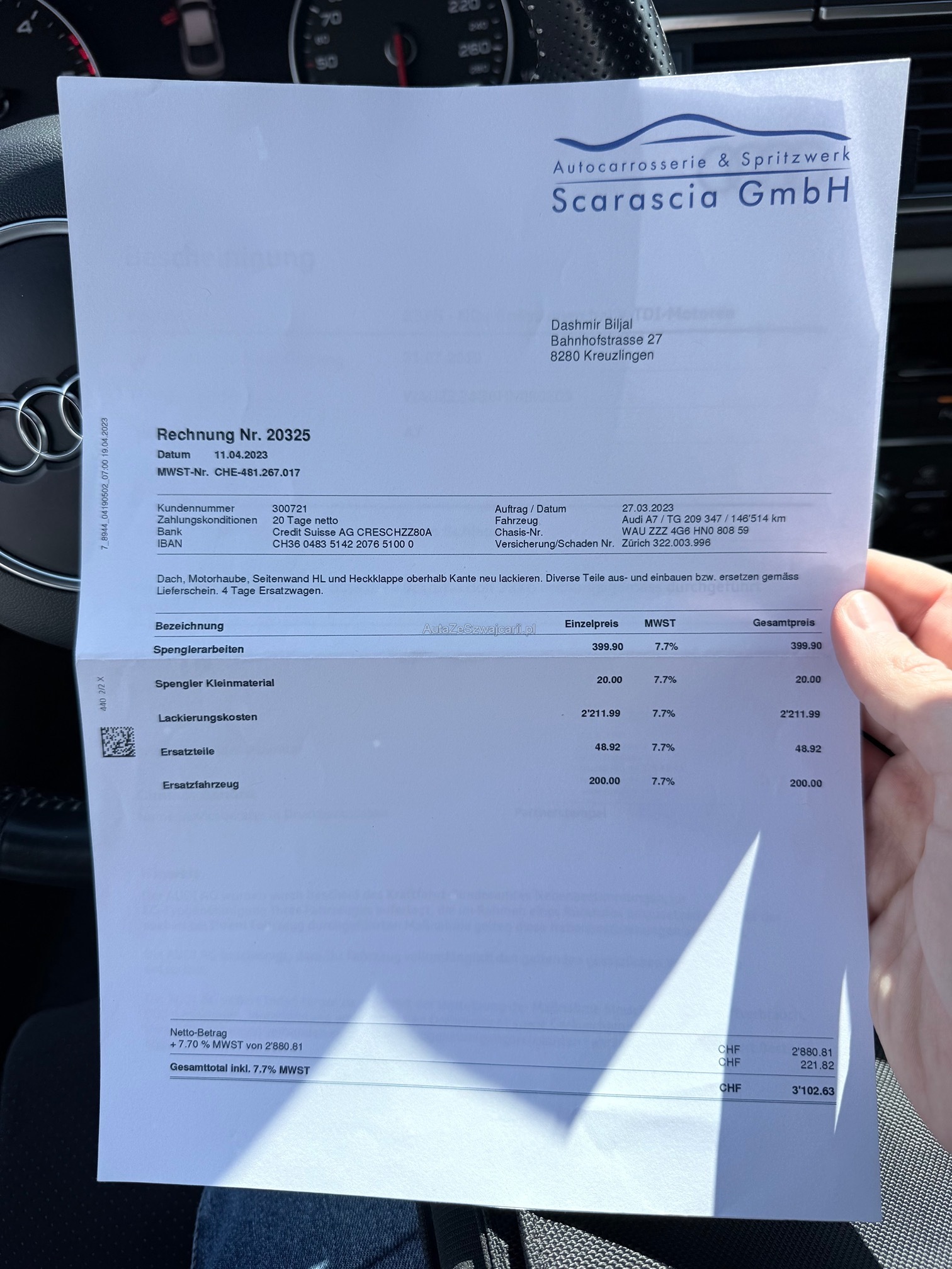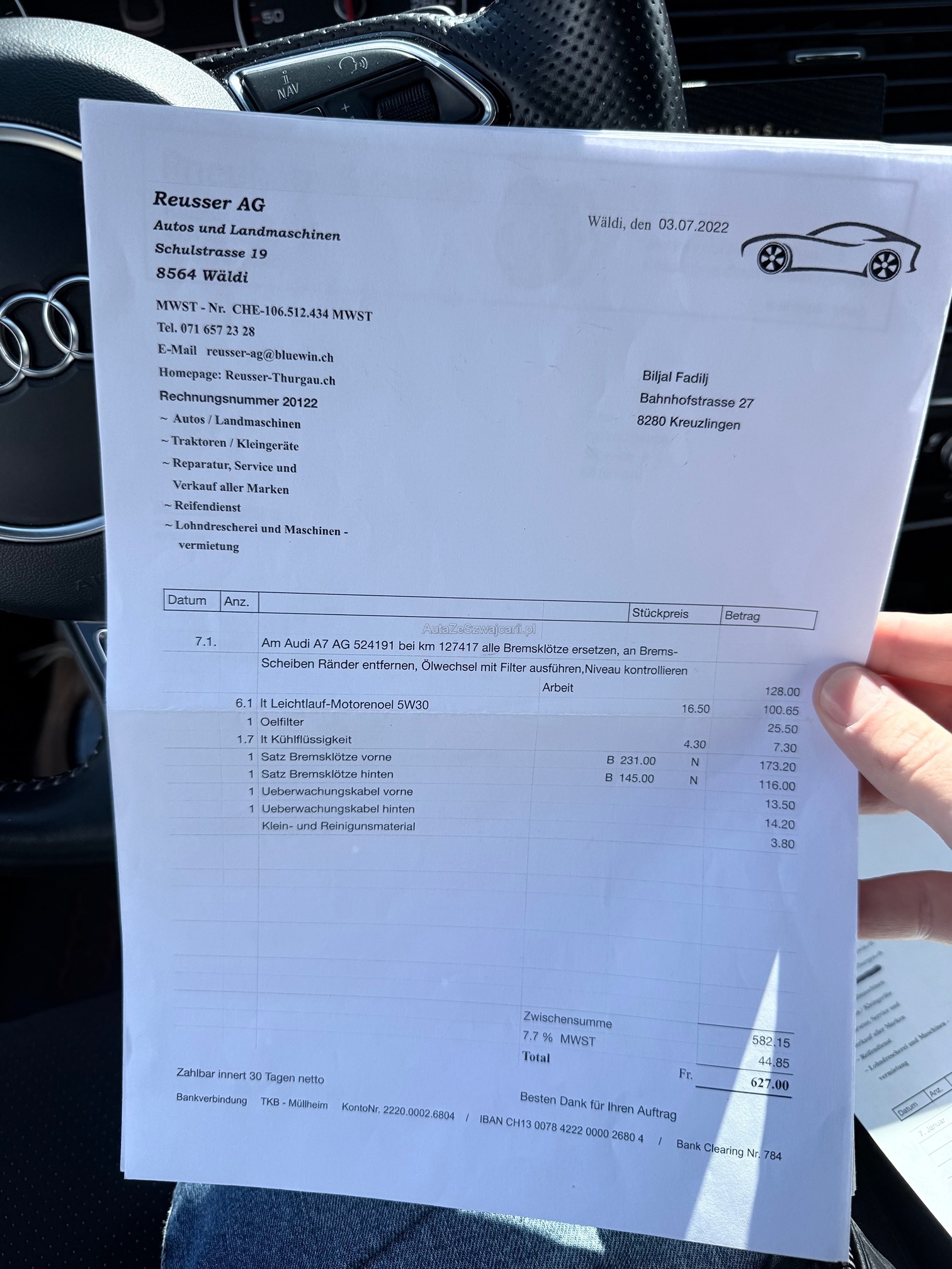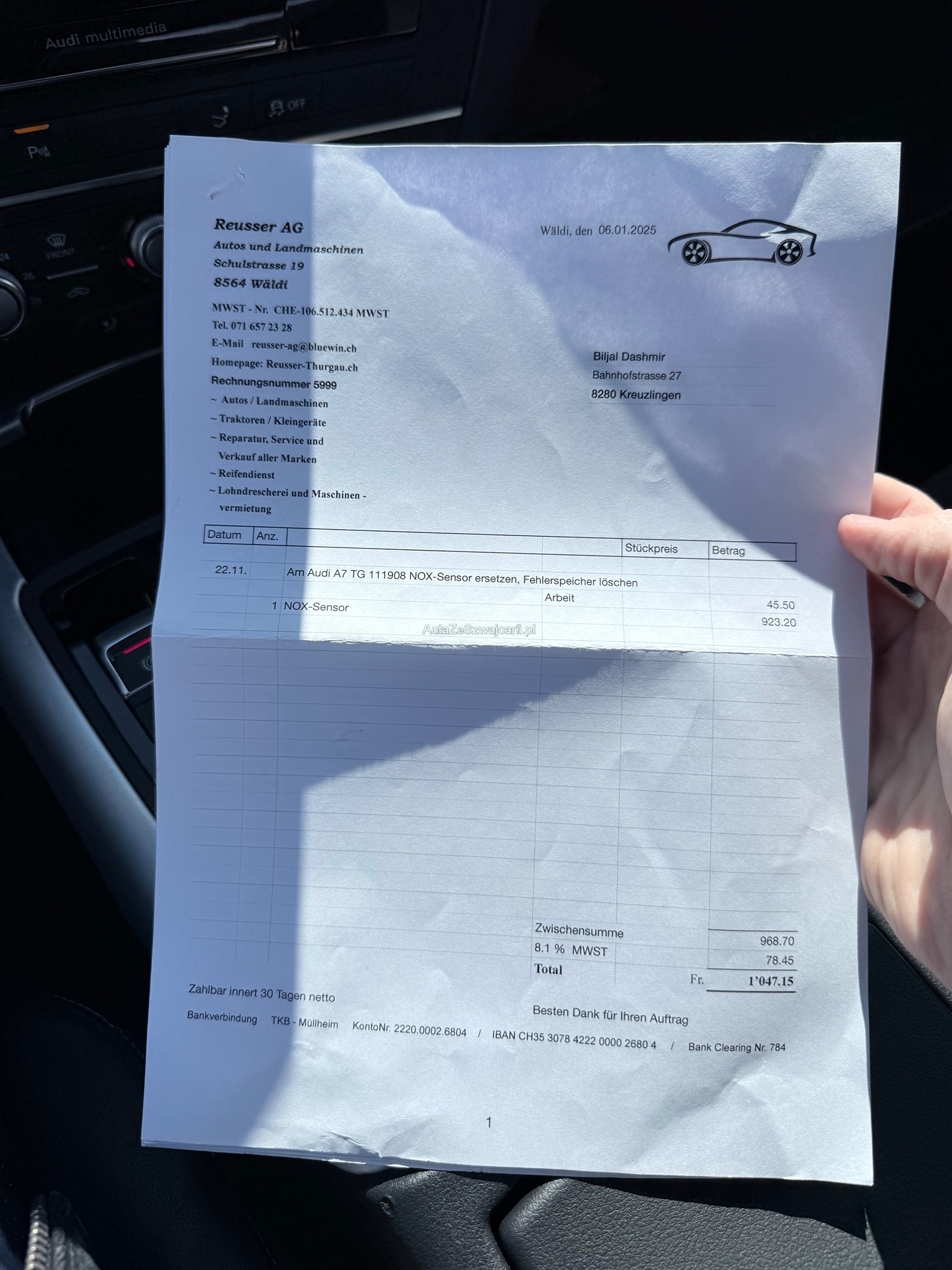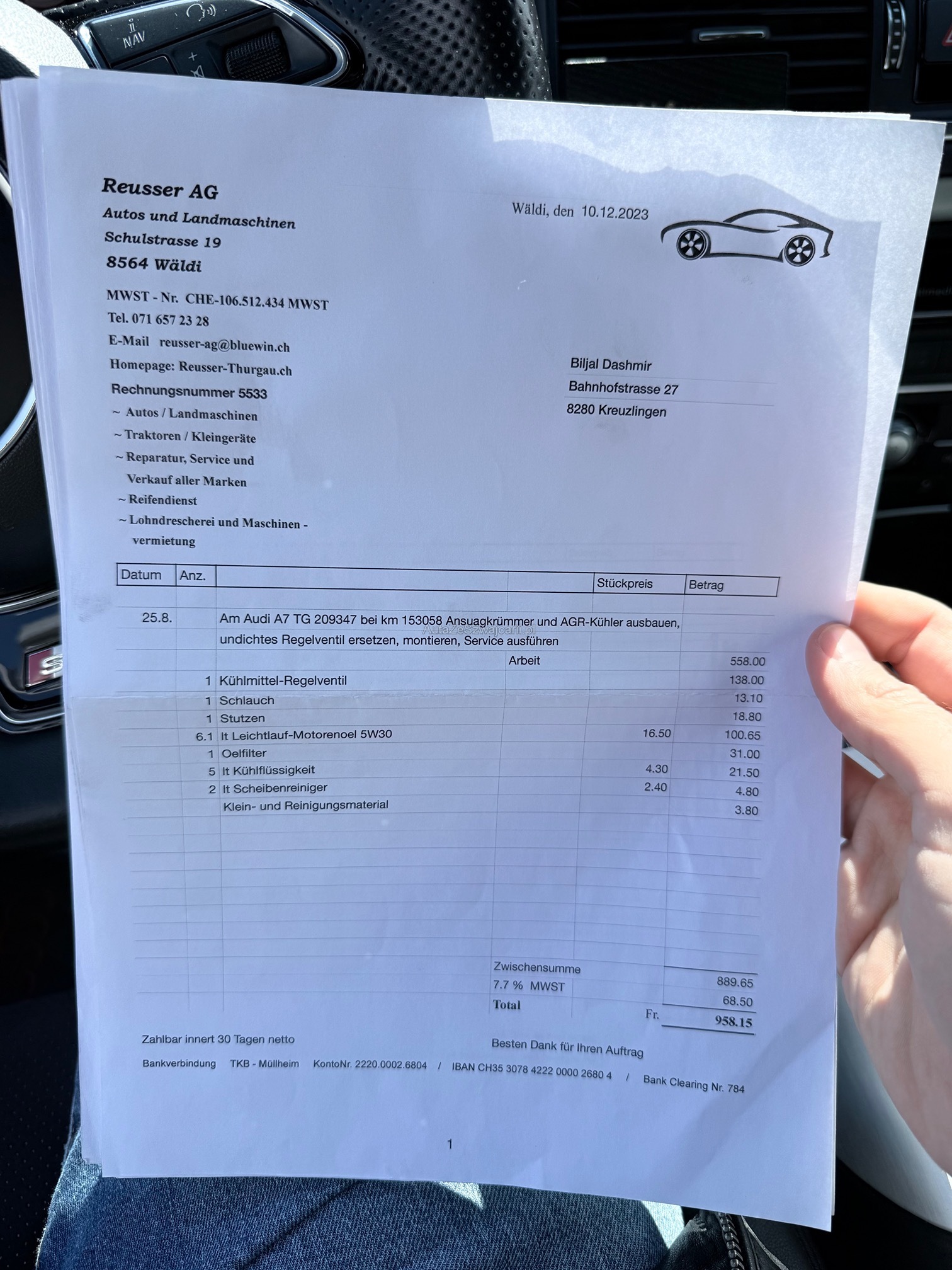 | Kommentar | Fahrzeug ist schwarz matt foliert; Originallack ist dunkelblau 2 Schlüssel; 4-fach bereift Sommer Aluminium bei Mittelkonsole teilweise gedellt und verkratzt sowie Leder in diesem Bereich ebenfalls leicht beschädigt; Fach bei Mittelarmlehne löst sich der Stoff; 1x leichte Blasenbildung auf Folie bei Haube; Vorne links kleiner Schaden an Stossfänger; Vorne unten rechts kleine Beschädigung an Spoilerlippe; Drehknopf für Helligkeit der Innenraumbeleuchtung fehlt Ansonsten ist das Fahrzeug für die Laufleistung in gepflegtem Zustand. Uns sind bei der Probefahrt keine Mängel aufgefallen. Ohne jede Garantie. Zustand gemäss Bilder. Ungereinigt ab Platz. Es wurde kein Test am Fahrzeug vorgenommen. Für sichtbare und unsichtbare Mängel wird keine Haftung übernommen. Kauf auf eigenes Risiko. Jede Gewährleistung, soweit nach Gesetz möglich, wird wegbedungen. Insbesondere sind Wandelung und Minderung ausgeschlossen. |