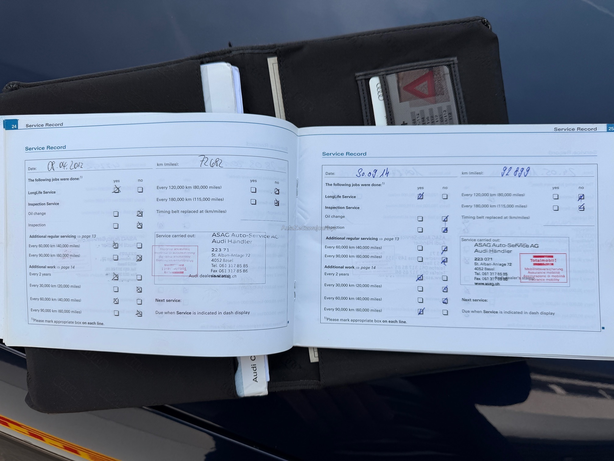 | Kommentar | Unterbodenabdeckung defekt. Winterreifen innen angefahren. Bremsen hinten demnächst fällig. Zahnriemen macht Geräusche. Dach ging nach Wäsche in Waschstrasse nicht auf. Gemäss Kunde funktioniert jedoch alles. |