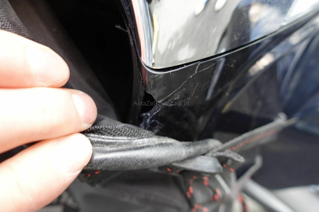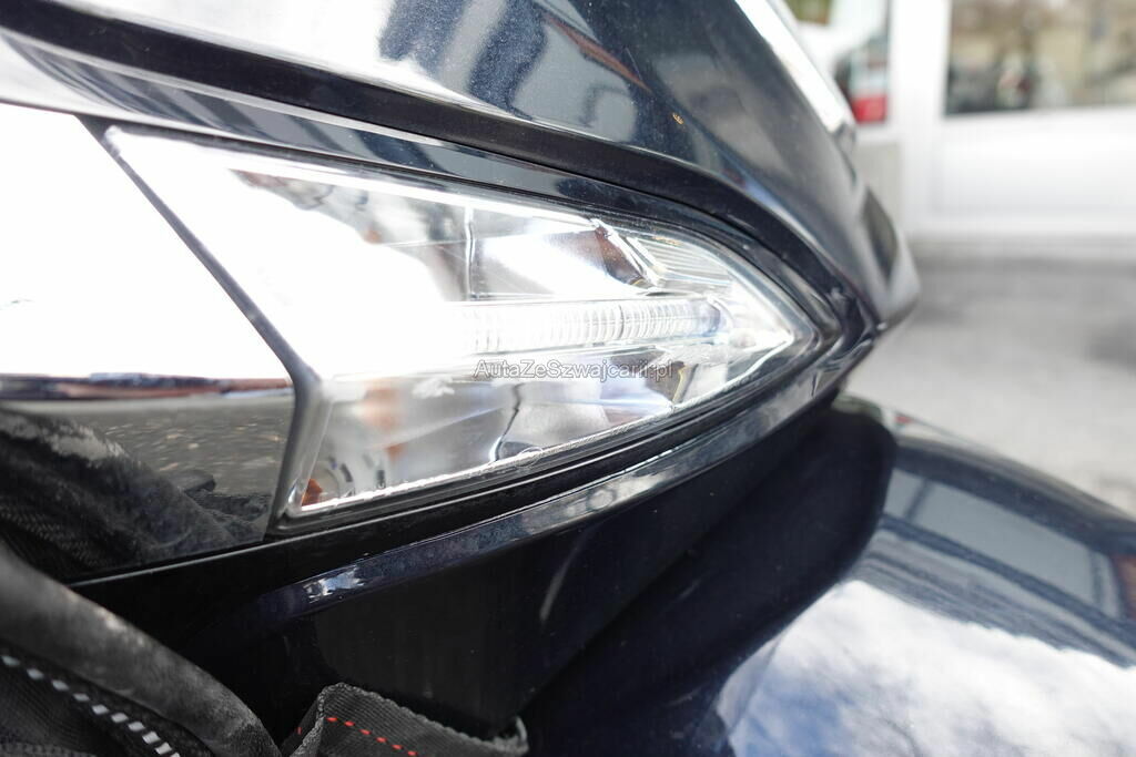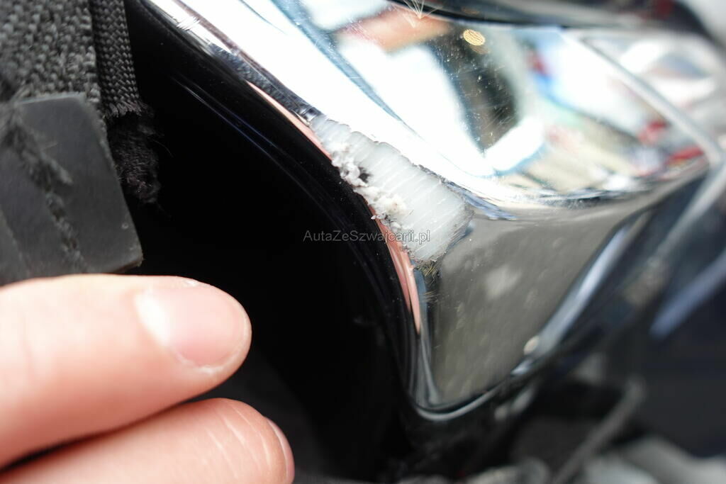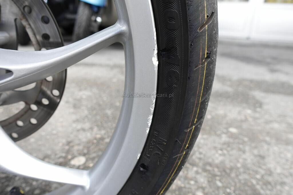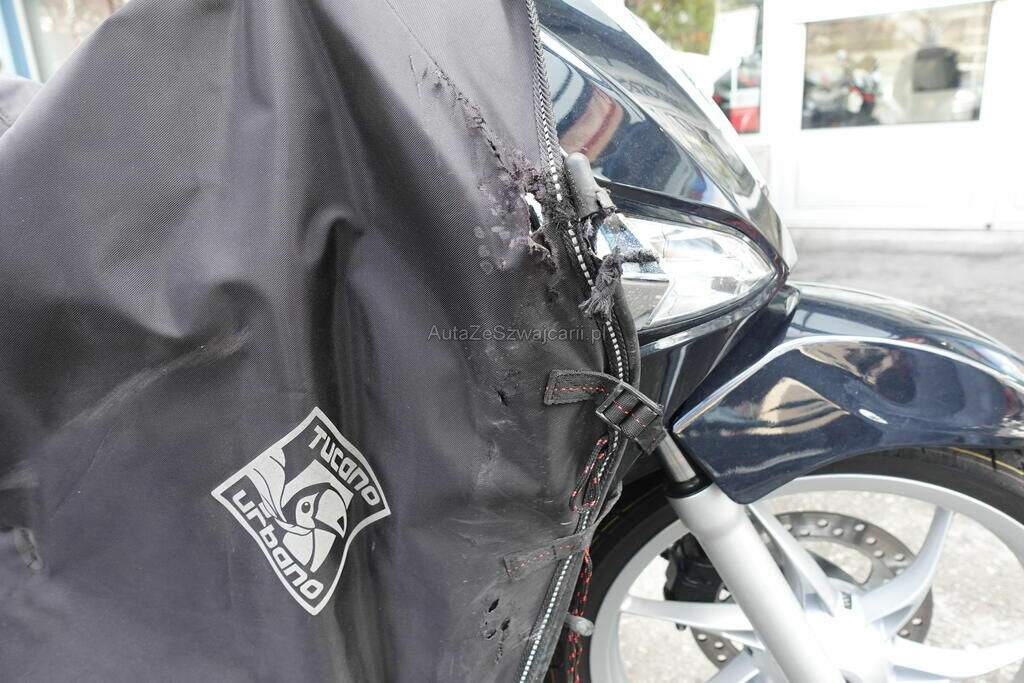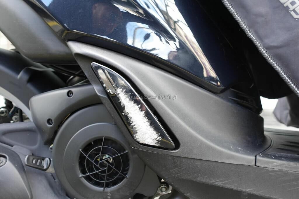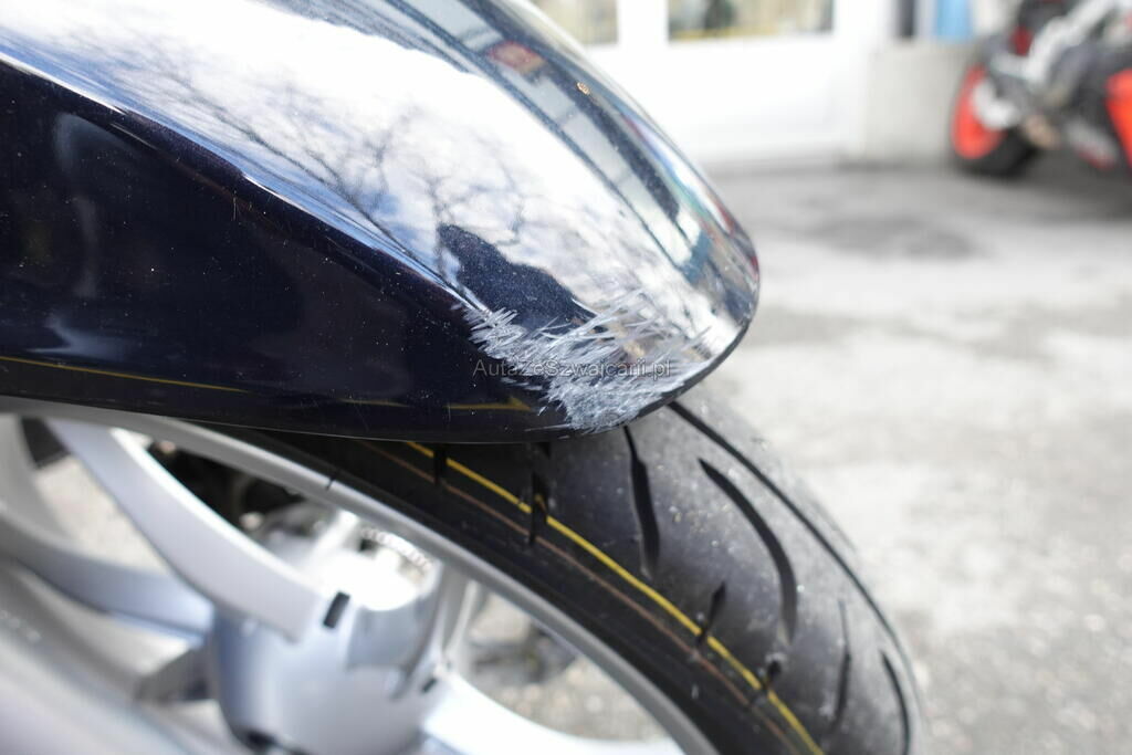 Top case, cale-pied passager, protection thermique échappement, échappement, rétroviseur, levier frein avant, couverture thermique, tablier, carénage latéral avant, bas de caisse, plancher, clignotant avant, pare-boue avant, jante et pneu avant; endommagés.