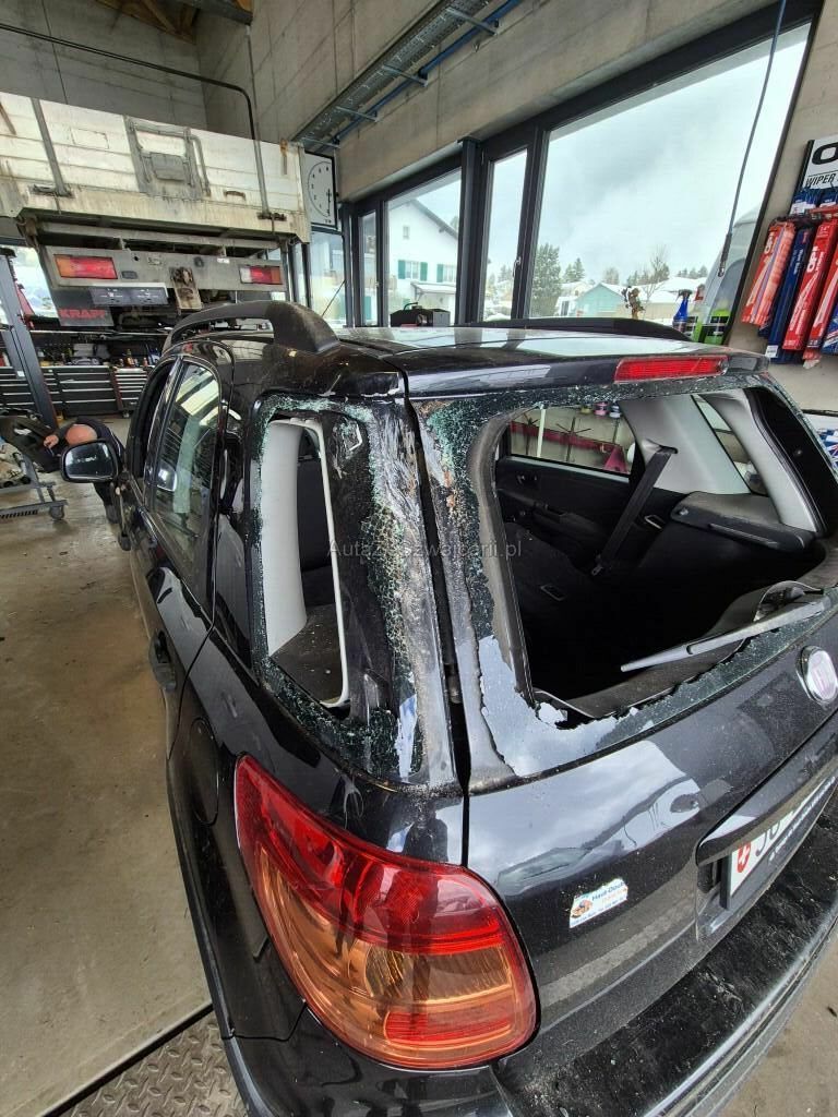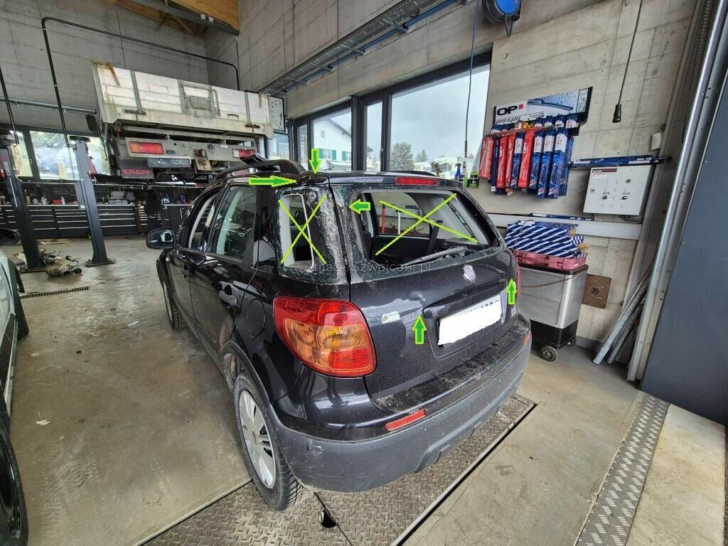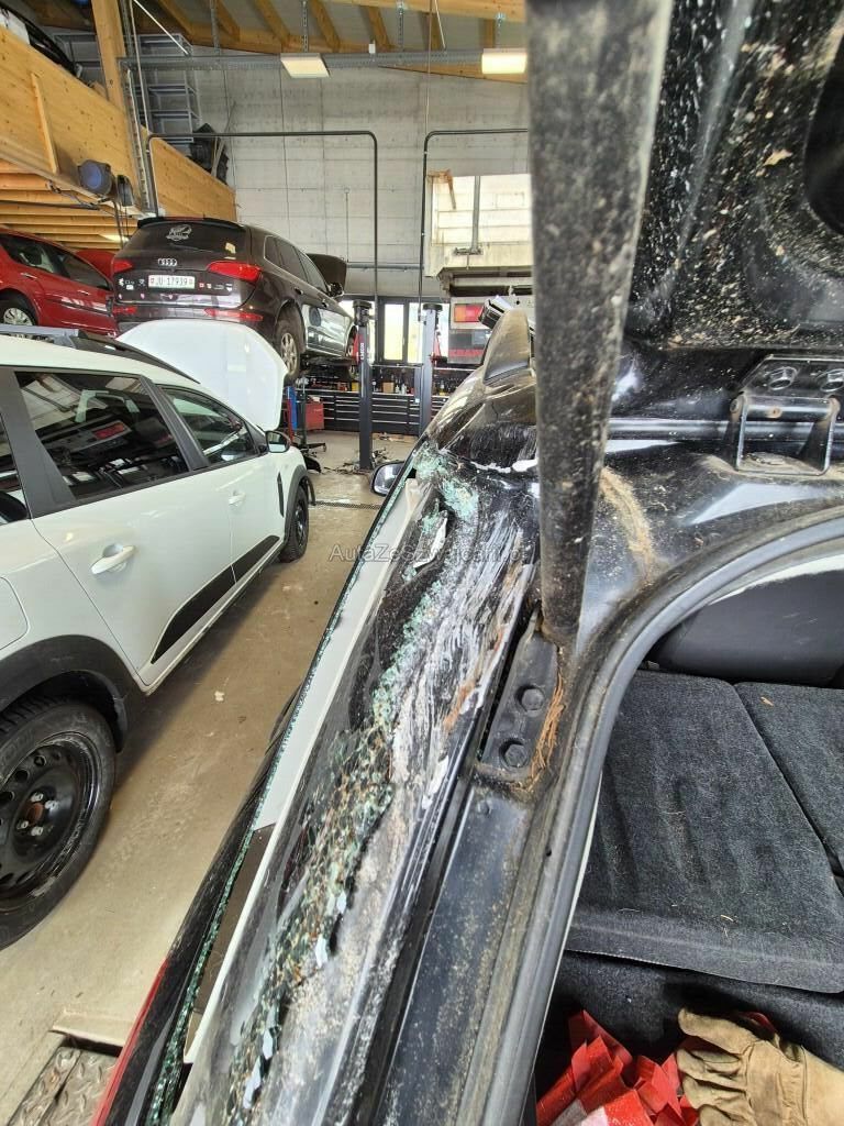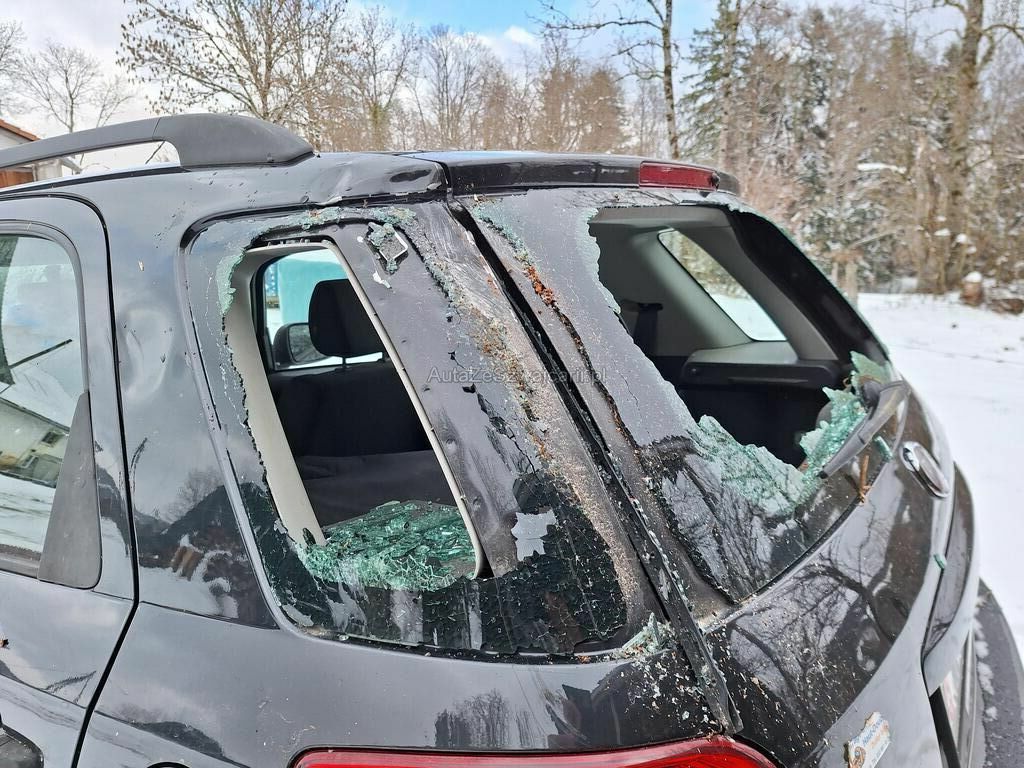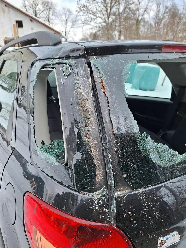 Vitre arrière ainsi que la petit vitre latérale cassée, feu arrière droit fissuré, carrosserie porte vitre arrière défoncée.