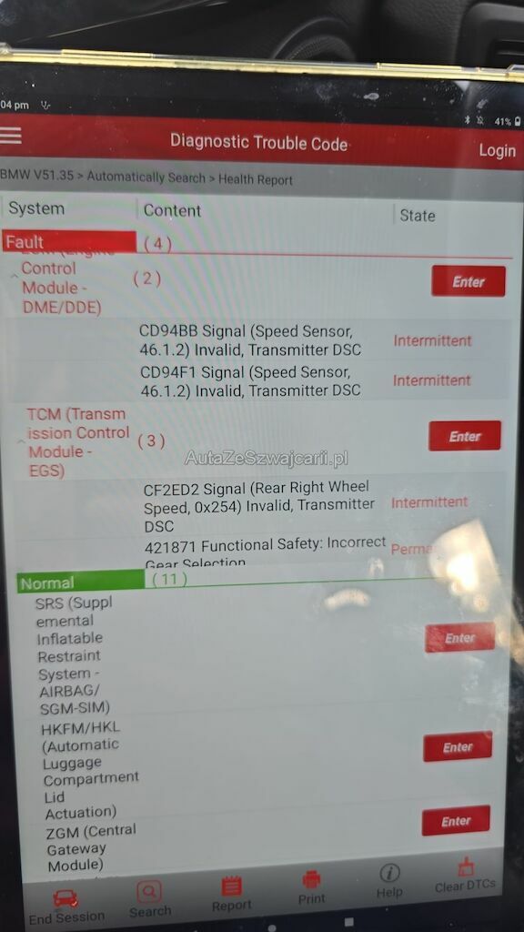 Delle und Verformung hinten rechts (Heckklappe / Seitenwand rechts hinten, Bereich Rücklicht). Möglicher Hagelschaden auf Dach und Fronthaube (Dellen). Meldung "Antrieb defekt" — vermutlich schwache Batterie. Diverse Fehlermeldungen im OBD-Scan: Raddrehzahlsensor hinten rechts defekt (ABS/DSC/DME/TCM-Fehler), Fahrstabilisierung-Warnung. Rechter Aussenspiegel: LIN-Kommunikationsfehler (kein Signal). Batterie sollte ersetzt werden.