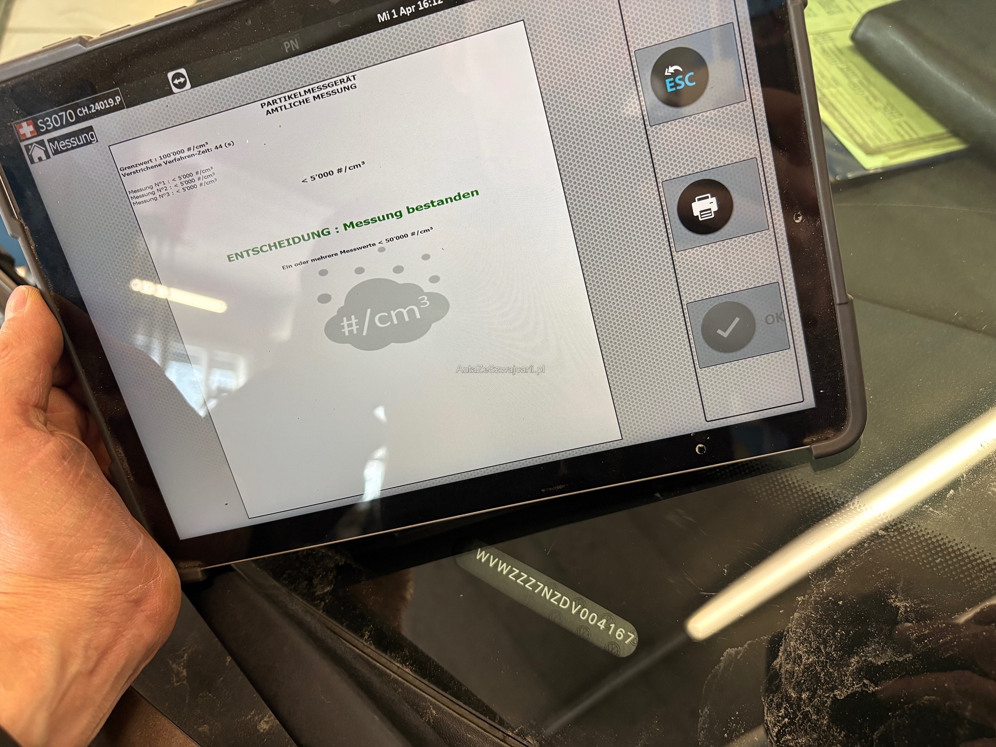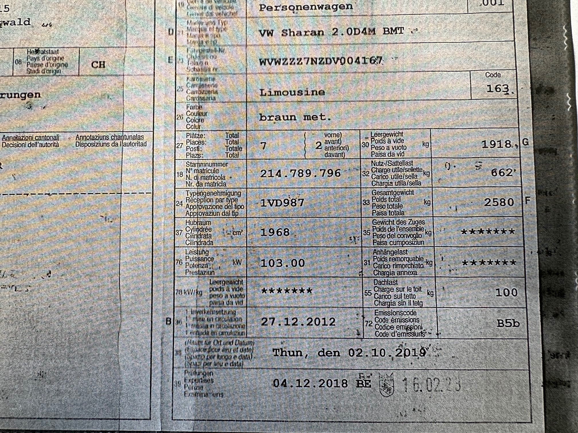 | Kommentar | Probefahrt durchgeführt, fährt gut, keine Geräusche, Motor und Getriebe i.O. Dieselpartikelfilter i.O. (siehe Foto von Messung) Winterreifen Conti Seal sehr gut 7mm Profil Sommerreifen Conti Seal gut 4mm Profil Kurzer Werkstatt-Test durchgeführt, festgestellte Mängel: -Querlenker hl (kleines Rostloch) und Feder hl (gebrochen) -Gummilagerbock für Querlenker vorne l+r rissig -Niveausensor für Leuchtweitenregulierung vl gebrochen -Hutablage/Kofferraumabdeckung fehlt (Kunde sucht, vielleicht findet er sie noch) Carrosserie (siehe Fotos): -Rost Türe vl (noch kein Loch) -Kratzer und Beule Schiebetür links -Wenig Rost an Seitenwand hl (noch kein Loch) -Kratzer an Stossstange hl und Ladekante -Wenig Rost an Schiebetür rechts hinten (noch kein Loch) -Kleine Parkschaden-Beule Türe vr unter Griff -Schraube für Kennzeichenhalter hinten rechts abgebrochen |