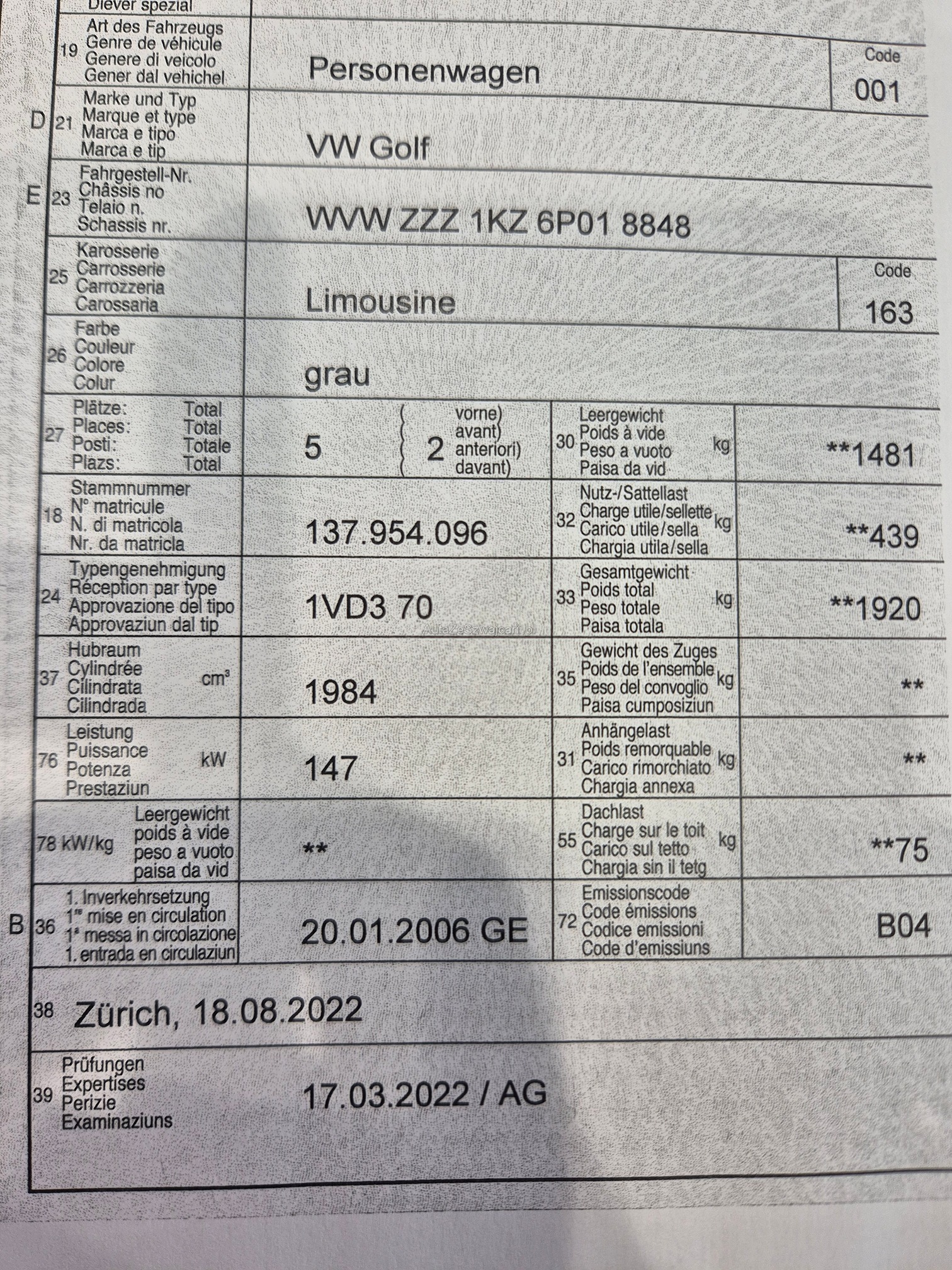 | VIN | WVWXXX |