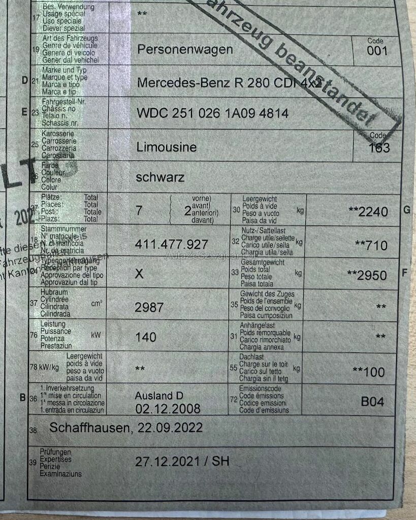 | Information | Fahrzeug ab Platz, ohne Garantie und Aufbereitung 8-fach bereift Diverse Gebrauchsspuren an Karosserie/Lack Keine technische Prüfung (Werkstatttest) vorgenommen DPF/FAP Filter nicht kontrolliert MFK- Nicht bestanden, siehe MFK-Bericht (Fahrzeug beanstandet) Beifahrertüre schliesst nicht beim abschliessen (eventuell Türschloss defekt, keine Diagnose gemacht) |