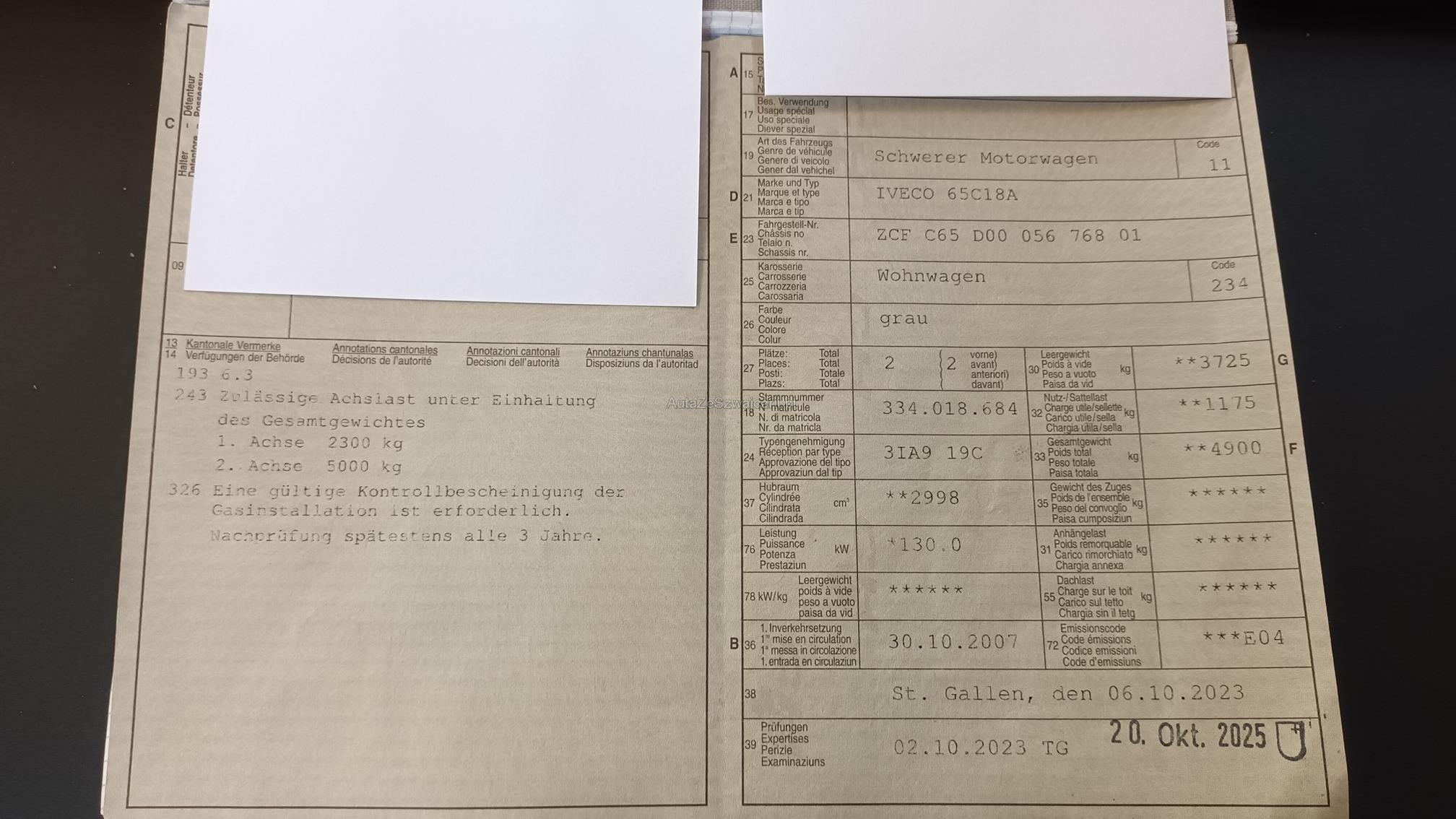 | Kommentar | keine Serviceeinträge vorhanden Öffnung in Heckwand, es war ein Camperaufbau montiert Bremsen vorne und hinten i.O Reifen i.O. Div. Fehlerlampen umlackiert, war früher orange Am Fahrzeug wurde keine vollumfängliche Prüfung der mechanischen Teile und der Carrosserie durchgeführt! Das Risiko liegt somit vollumfänglich beim Käufer. Um Missverständnisse zu vermeiden kann das Fahrzeug auf Voranmeldung besichtigt & getestet werden. Wird davon bewusst kein Gebrauch gemacht, liegt die Verantwortung beim Käufer. Nach Zuschlag, keine Nachverhandlungen möglich. Ab Platz ohne Garantie, Wandelung und Minderung werden wegbedungen. |