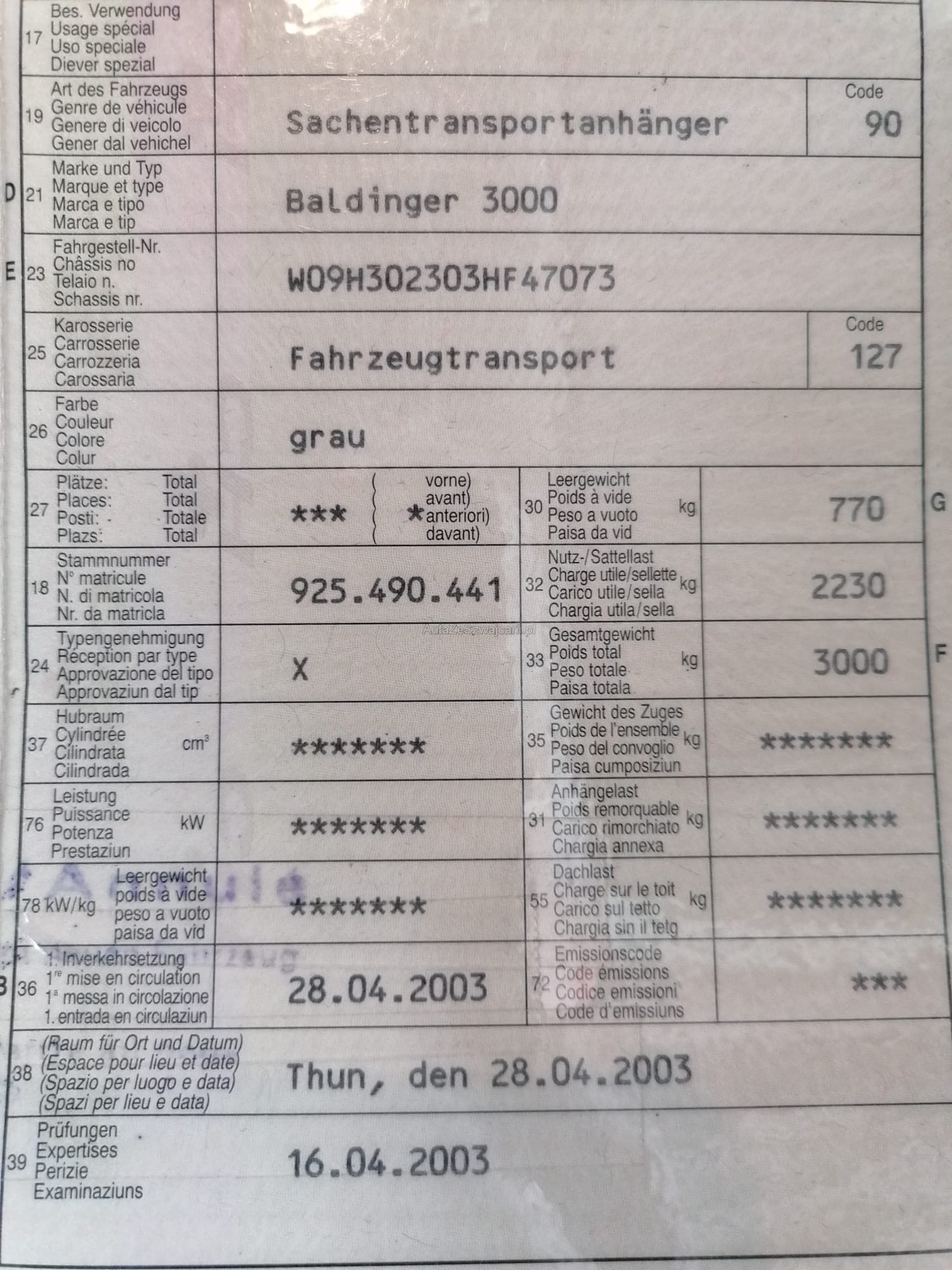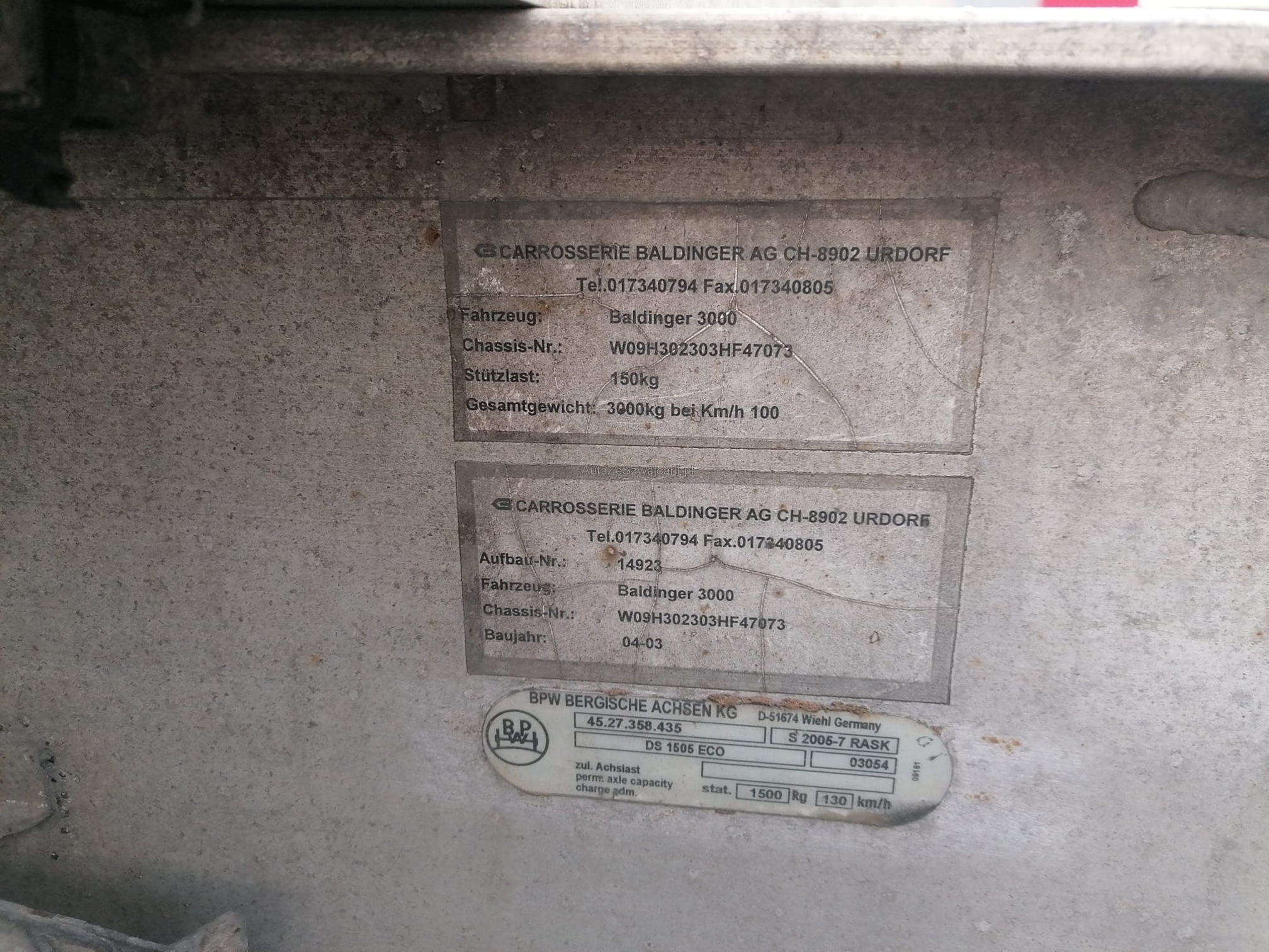 | Kommentar | Baldinger Fahrzeugtransport-Absenkanhänger Baldinger 3000 28.04.2003 innert Sekunden absenkbar und anhebbar 5m Ladefläche 2m breit Beleuchtung, Elektrik in gutem Zustand Elektronische Winde (Abnehmbar) ist mit dabei inkl. Fernbedienung 2'230 Kg Nutzlast 3'000 Kg Gesamtgewicht Gewährleistungen, Wandlungen oder Minderungen sind Ausgeschlossen, gemäss Gesetzgebung. Ab Platz für Export oder Aufbereitung! Marke stimmt im Inserat nicht da die Korrekte Marke nicht angewählt werden kann. Dies ist hier erwähnt und somit kein Rücktritt Grund. Wird im Kundenauftrag verkauft und inseriert |