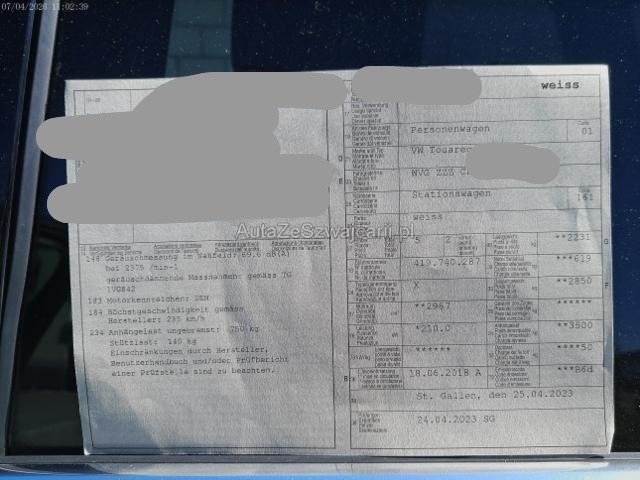 | Condition_and_Equipment | Schlüssel Beide Schlüssel vorhanden. Kategorie Das Fahrzeug wird vom Besitzer noch benutzt. --- Front Front rechts eingedrückt. Kotflügel vorne rechts eingedrückt. Sonstige Schäden Div.Carrosserie Teile sind leicht beschädigt. Weitere Beschädigungen siehe Fotos --- Serienaustattung Airbag Fahrer und Beifahrerseite Kindersitz-Vorbereitung Isofix Innenspiegel automatisch abblendbar Regensensor Parkdistanz-Kontrolle vorne + hinten Vordersitze beheizbar Aussenspiegel elektrisch verstellbar und heizbar Elektrische Fensterheber vorne + hinten Klimaanlage Climatronic 2-Zonen Dachreling eloxiert Elektrisch verstellbare Vordersitze Deaktivierung Beifahrerairbag Fussmatten vorne + hinten ESP inkl. Bremsassistent/ ABS/ ASR/ EDS Aussenspiegel elektrisch anklappbar und autom. abblendend Dekoreinlagen in Aluminium Rücksitzbank verschiebbar Auto-Hold-Funktion Reifenkontrollanzeige RKA Chromleisten an den Seitenfenstern Automatische Distanzregelung ACC/ Front Assist Dieselpartikelfilter Elektronische Parkbremse Berganfahr- Bergabfahrassistent Seitenairbags vorne inkl. Kopfairbagsystem Spurhalteassistent Lane Assist Dachhimmel schwarz Stop + Start System mit Brems-Energie-Rückgewinnung Multifunktionsanzeige Premium Verkehrszeichenerkennung Müdigkeitserkennung Multifunktions-Lederlenkrad 3-Speichen R-Line/ beheizbar Keine Gewähr auf die Angaben der Serienausstattungen Digitaler Radioempfang DAB+ Navigationssystem Discover Pro Media Control/ App-Connect/ Mobiltelefon-Vorbereitung LED-Scheinwerfer VSSP Volkswagen Swiss Service Package 4 Jahre/ 100'000 km Pack R-Line Exterieur Leichtmetallräder 19" Sebring Lederausstattung Vienna Sonderausstattung Anhängevorrichtung elektrisch abklappbar Heizbare Frontscheibe Park-Lenkassistent/ Distanz-Kontr.v+h/ Rückfahrkamera Klimaanlage Climatronic 4-Zonen Ambiente Pack/ Beleuchtung Pack Licht und Sicht/ Memory Panorama-Schiebe-/ Ausstelldach elektrisch Schliess- und Startsystem Keyless Access ohne Safe-Lock Seitenairbags hinten inkl. Knieairbag Fahrerseite Seiten- und Heckscheibe hinten abgedunkelt/ Verbundglas Pack Memory Vordersitze mit aktiver Klimatisierung/ Massagefunktion Pack Fahrerassistenz Plus Treibstofftank 90 Liter |
