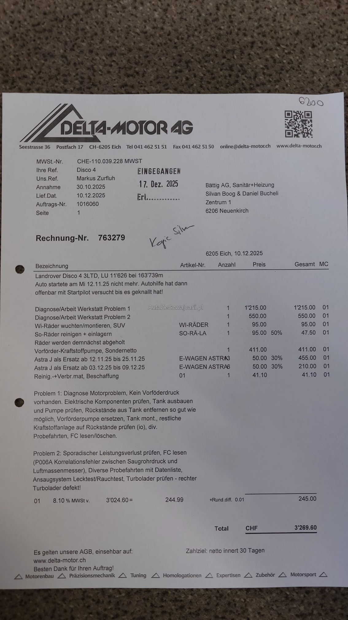 | Kommentar | Vorförderpumpe und ZV Motor hi re wurden ersetzt. Auto ist gut fahrbar, hat aber bei grosser Belastung zu wenig Leistung weil der rechte Turbo nicht funktioniert. Service und MFK fällig, sonst keine Diagnose gemacht. Kauf auf eigenes Risiko, keine Nachverhandlung. |