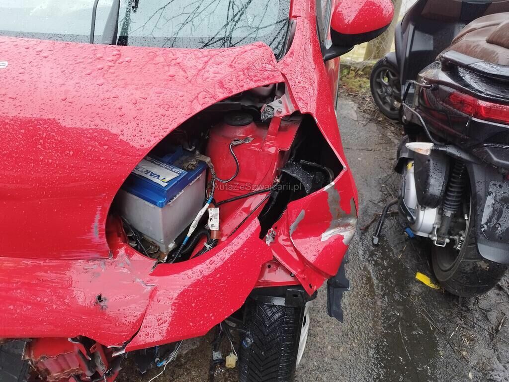 Die ganze Front ist deformiert und gestaucht, die Front ist nach rechts verschoben, das Rad vorne links steht schräg, alle Gurtstraffer sind ausgelöst, der Fahrerairbag und Beifahrerairbag sind ausgelöst.