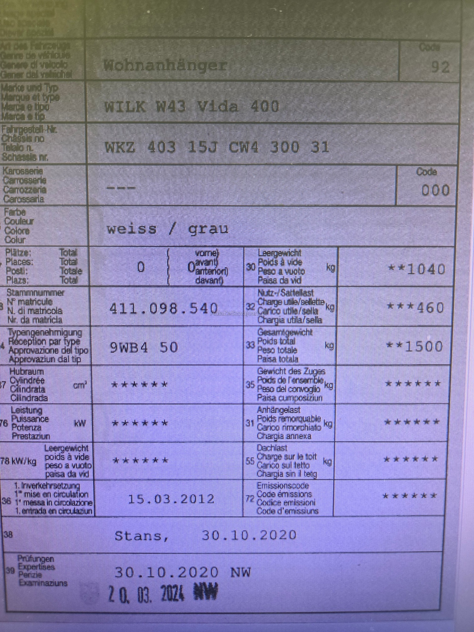 | Kommentar | Komplette Historie und Ausstattung sowie alle Infos im angefügte DOCX Dokument. Fotos und Beschrieb von Kunde erhalten. Bitte beachten, dass das Camping Zubehör eventuell nicht dabei ist (Gläser, Geschirr, etc.) welches auf den Bildern zu sehen ist. Aber sonst sehr gut ausgestattet. Wilk W43 VIDA Natura 400 FD Kompakt-Wohnwagen für 2 (-3) Personen aus erster Hand. Idealer Kompakt-Wohnwagen für 2 (bis 3) Personen aus erster Hand. Gefahrene Kilometer ca. 23'000. Zustand sehr gut, bis auf selbst reparierte Heckstossstange links. • Fahrzeugart: Gebrauchtwagen • Erstzulassung: 03/2012 • Letzte MFK: 03/2024 • Gasprüfung: 07/2023 • Zustand: sehr gut • Garantie: keine Garantie • Farbe: weiss • Gesamtlänge: 605 cm • Gesamtbreite: 232 cm • Gesamthöhe: 257 cm • Innenlänge: 400 cm • Innenhöhe: 196 cm • zul. Gesamtgewicht: 1'500 kg • kg Leergewicht (fahrbereit): 1'040 • Zuladung: 460 kg • Anzahl Türen: 1 Tür • Schlafplätze Total: Schlafplätze 3 • Schlafplätze Doppelbett: 1x im Doppelbett • Schlafplätze Einzelbett: 1 Einzelbett • Küche: Heckküche • Bad: Seitenbad • Frischwassertank: 70 l Wasser • Abwassertank: 25 l Abwasser Zubehör/Ausrüstung: • Heizung/Boiler Truma Combi 4. • Mover Truma. • Insektenschutztüre. • Vorzelt und Sonnendach (Fotos). • VanProtect Schutzdach (Foto). • Kupplung auf Deichsel für Thule-Veloträger (nicht typengeprüft). Weiteres: • Überwinterung erste Jahre unter Spezialdach (Foto), dann in Garage (ganzjährig). • Neue Pneus 2025. • Neue Bremstrommeln und -backen 2025. • Linke Seitenwand im Jahr 2020 durch Mobil Center Dahinden AG ersetzt, infolge Manövrierschaden. • Kühlschrank kann nicht mehr mit Gas betrieben werden. Ausstattung: • Batterie • Dachluke (2) • Dachreling mit Leiter • Dusche • Feuerlöscher • Gasheizung • Gasherd • Gefrierabteil • Kurbelstützen Front und Heck • Kühlschrank • Mover • Vorhänge, Insektengitter, Blenden • Vorzelt und Sonnendach • Warmwasserboiler • Waschbecken • WC Chemie • WC elektrisch • Aussendusche Verkauf, da der Kunde ein Wohnmobil gekauft hat und den Wohnwagen nicht mehr benötigt Verkauf ab Platz ohne Garantie und ohne Nachverhandlungen |