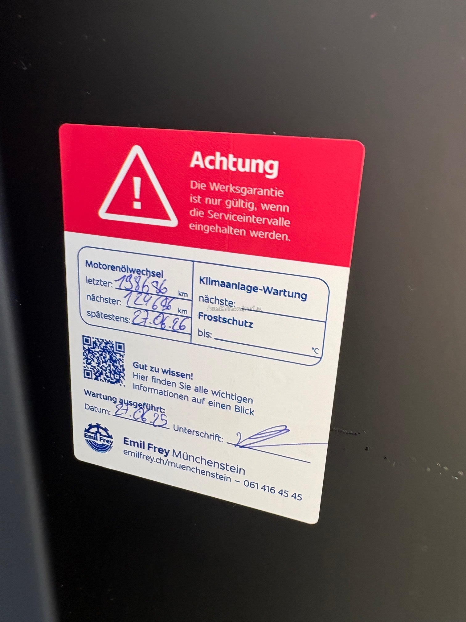| Kommentar | Fahrzeug hat eine Komplett-Folierung (12'000.-) in weiss. Hinten links an der Türe kleiner Parkschaden (siehe Foto) Das Fahrzeug ist technisch in einwandfreiem Zustand. Es sind keine Mängel bekannt. DPF ist ok. Gemäss Kunde leuchtet sporadisch eine Warnlampe für den Frontsensor vorne in der Frontscheibe. Jede Gewährleistung wird wegbedungen insbesondere sind Wandlung und Minderung ausgeschlossen. Eine Garantie wird nicht gewährt. Preise werden nicht nach verhandelt. |