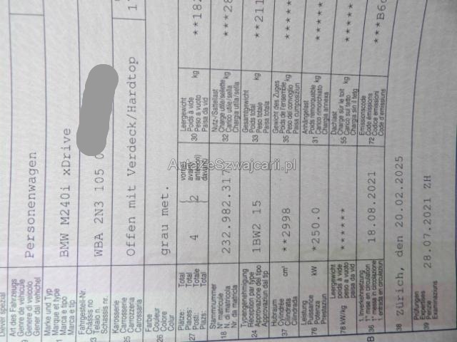 | Condition_and_Equipment | Zustand Fahrzeug muss transportiert werden (Höhe und Breite beachten). Fahrzeug ist NICHT fahrbar. Fahrzeug ist NICHT rollbar. Bereifung Fahrzeug wird mit Winterräder abgegeben. Schlüssel Nur ein Schlüssel vorhanden. Weitere wichtige Hinweise Siehe Fotos, ohne Gewähr. --- Rechts Rechte Seite beschädigt. Tür vorne rechts ist eingedrückt. Front Fussgängerschutz ausgelöst. Front rechts eingedrückt. Kotflügel vorne rechts eingedrückt. Motorhaube eingedrückt. Frontblech/Maskenblech eingedrückt. Radhaus vorne rechts eingedrückt / gestaucht. Längsträger vorne rechts gestaucht. Motor Risiko Motor. Risiko Getriebe. Risiko Differenzial. Motoranbauteile beschädigt. Alle Kühler vorne sind eingedrückt. Achse Vorderachse ist beschädigt. Aufhängungsteile vorne rechts beschädigt. Risiko Vorderachse. Risiko Hinterachse. Lenkgetriebe ist beschädigt. Risiko Lenkung. Motoraufhängung/Aggregateträger ist beschädigt. Elektrik Risiko Steuergeräte. Kabelstränge verbrannt, beschädigt, abgerissen. Risiko Scheinwerfer. Risiko Nebellampen. Risiko Tagfahrleuchten. Innenraum Fahrerairbag ausgelöst. Beifahrerairbag ausgelöst. Armaturenbrett ist beschädigt. Gurtstraffer vorne ausgelöst. Glas Windschutzscheibe ist gerissen. Weitere Beschädigungen Überrollbügel hat ausgelöst. Motor wurde nicht gestartet. --- Serienaustattung Seitenairbag für Fahrer und Beifahrer Radio BMW Professional Reifendruck-Kontrollsystem RDC Durchladesystem Regensensor Dynamische Stabilitäts-Control DSC Antiblockiersystem ABS M-Sportfahrwerk Pack M Aerodynamik Pack Ablage Überrollschutz Hochglanz Shadow-Line Windschutz M-Lederlenkrad Fahrer und Beifahrer-Airbag Sportsitze für Fahrer und Beifahrer Velours-Fussmatten Multifunktions-Lenkrad Pack Licht Dynamische Traktions-Control DTC Armauflage vorn verschiebbar Park Distance Control PDC hinten Geschwindigkeitsregelung mit Bremsfunktion Deaktivierung Beifahrerairbag Klimaautomat 2-Zonen inkl. Mikrofilter Kindersitzbefestigung Isofix für Fondsitze Digital audio DAB-Tuner Auto Start Stopp Funktion Sportlenkung variabel Freisprecheinrichtung mit USB-Schnittstelle Interieurleisten Aluminium Hexagon Keine Gewähr auf die Angaben der Serienausstattungen M Sportbremse Stoff Hexagon/ Alcantara ConnectedDrive Services Remote Services LED-Scheinwerfer BMW Service Plus 10 Jahre/ 100'000 km Ottopartikelfilter Sonderausstattung HiFi-System Harman/Kardon Lenkradheizung Lordosenstütze für Fahrer und Beifahrer Elektrische Sitzverstellung mit Memory Sitzheizung für Fahrer und Beifahrer Innen- und Aussenspiegel automatisch abblendbar Diebstahlwarnanlage Navigationssystem Professional Komfortzugang Park Distance Control PDC vorn und hinten Fernlichtassistent Rückfahrkamera Aktive Geschwindigkeitsregelung mit Stop&Go Funktion Parkassistent Instrumentenkombination/ erweitert Adaptive LED-Scheinwerfer Real Time Traffic Information Concierge Service M Leichtmetallräder Doppelspeiche 719 Pack Connected Drive Services Driving Assistant |