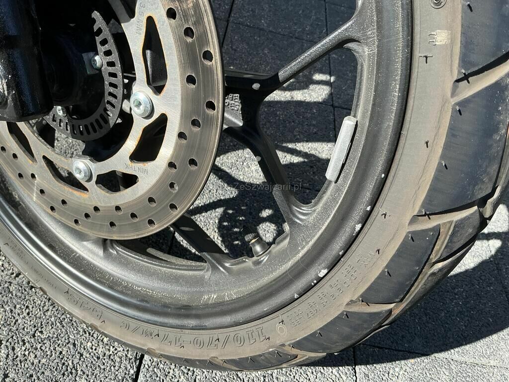 Pare-boue avant, phare avant, clignoteurs droit, fourreau de fourche avant droit, cache carter droit, rétroviseur, levier et poids de guidon droit, échappement, pédale de frein, cale pied droit, jante avant griffés. Guidon faussé.