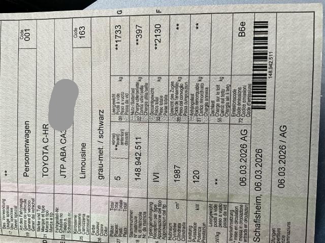 | Condition_and_Equipment | Zustand Fahrzeug muss transportiert werden (Höhe und Breite beachten). Fahrzeug ist NICHT fahrbar. Fahrzeug ist NICHT rollbar. --- Rechts Anstoss rechts im Bereich der A-Säule. Achse Aufhängungsteile vorne rechts beschädigt. --- Serienaustattung Airbag Fahrer und Beifahrerseite Sitzheizung vorne Aussenspiegel heizbar Navigationssystem Zentralverriegelung mit Fernbedienung Höhenverstellbarer Beifahrersitz Innenspiegel automatisch abblendbar Kopfairbag vorne und hinten Regensensor Leichtmetallfelgen 18" Deaktivierung Beifahrerairbag Park-Distanz-Sensor vorne + hinten Stabilitätskontrolle VSC + Traktionskontrolle TRC Rückfahrkamera Multimedia-System Seitenairbags vorne 4 Winterräder Alu 18" Dachhimmel schwarz Knieairbag Fahrer Dunkelgetönte Scheiben seitlich und hinten ABS und EBD Elektr. Bremskraftverteilung Elektr. Lendenwirbelstütze Fahrersitz Geschwindigkeitsbegrenzer Fahrersitz höhenverstellbar Fernlichtassistent Lenkradheizung LED-Scheinwerfer Multi-Informationsdisplay Aussenspiegel elektrisch einklappbar LED Rückleuchten Totwinkel-Assistent Details siehe gültige Preisliste des Importeurs Ladekabel Keine Gewähr auf die Angaben der Serienausstattungen Klimaanlage automatisch 2-Zonen Notruf LED-Nebelscheinwerfer Smart Entry Fernprogrammierung der Klimaautomatik Wireless Charging für mobile Geräte Connect Apple Car Play/ Android Auto Ausstiegs-Assistent Lenkrad in Kunstleder USB-C Anschluss Garantie 10 Jahre/ 185'000 km Pack Safety Sense 3.0 Sonderausstattung Metallic-Lackierung Ladekabel Haushaltssteckdose |