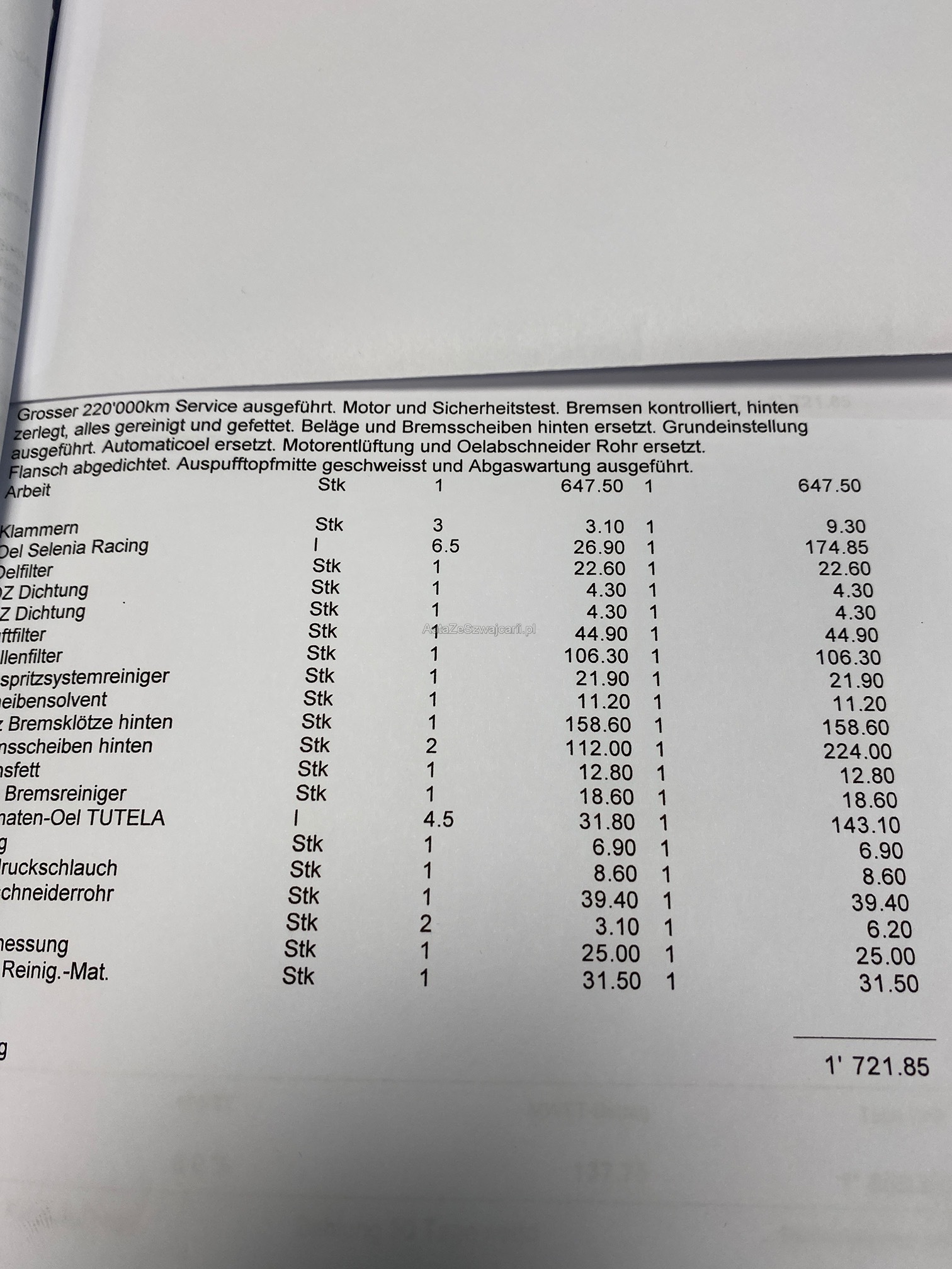 | Kommentar | Fahrzeug hat kleiner Hagelschaden. Zahnriemen muss ersetzt werden. Investitionen siehe Fotos! Keine mechanische Prüfung. Abholung innert 5 Tagen. Keine Nachverhandlung. Ab Platz und ohne Garantie. Wandelung und Minderung werden wegbedungen. Belege im Wert von Fr.38‘000 vorhanden und im Fahrzeug. |