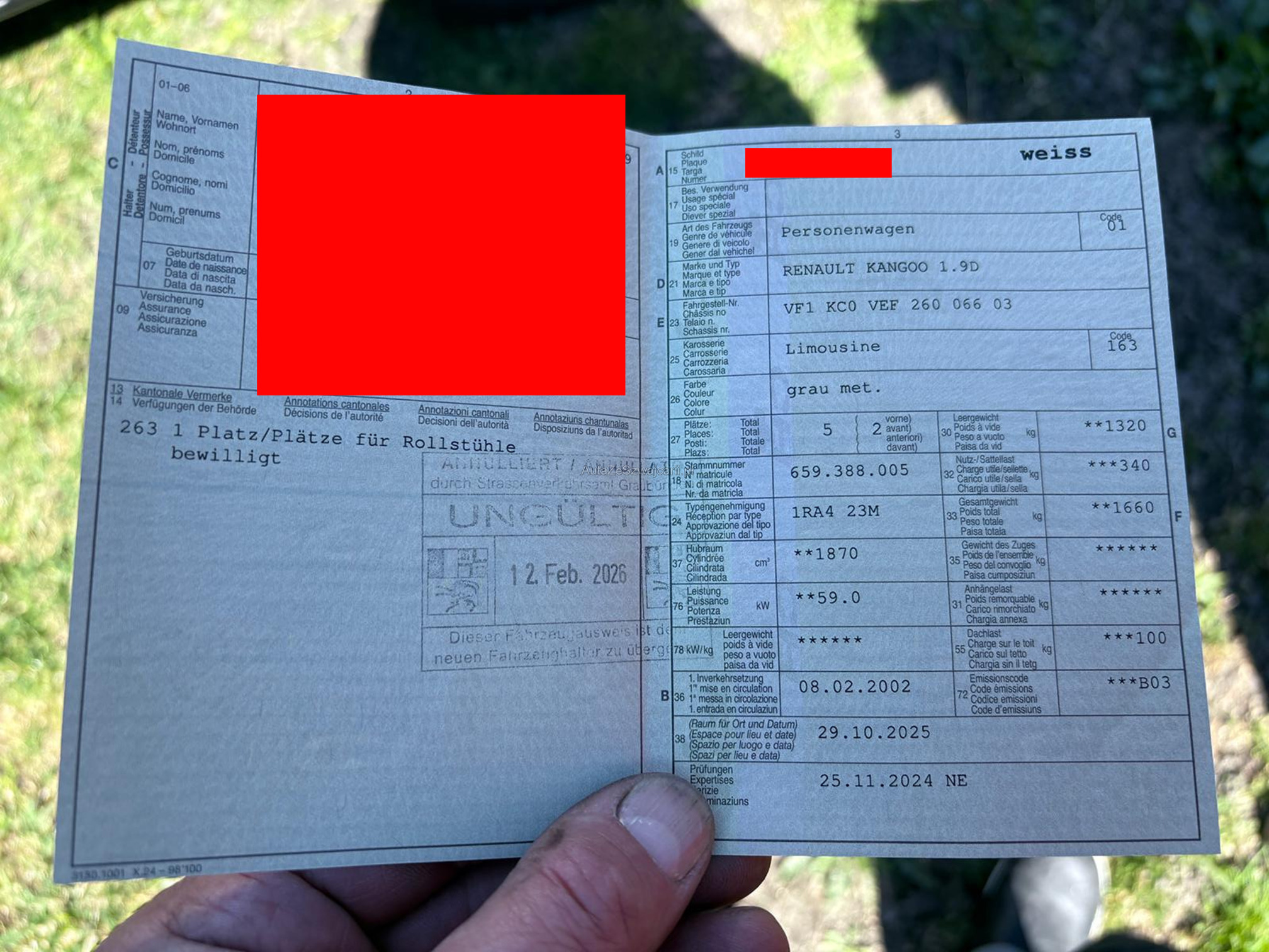 | Kommentar | Hat einige Kratzer Heck hydraulisch absenkbar für Rollstuhl Hinweis: Das Fahrzeug wurde keinem Werkstatttest unterzogen. Eine Überprüfung sämtlicher Funktionen wurde nicht durchgeführt. Für sichtbare sowie nicht sichtbare Mängel wird keine Haftung übernommen. Der Verkauf erfolgt ab Platz, ohne Garantie oder Gewährleistung. Jegliche Ansprüche auf Wandelung oder Minderung werden ausdrücklich wegbedungen. Nach Zuschlag bzw. Kaufabschluss sind Nachverhandlungen ausgeschlossen, auch im Falle nachträglich entdeckter, nicht deklarierter Mängel. Das Risiko trägt vollumfänglich der Käufer. |