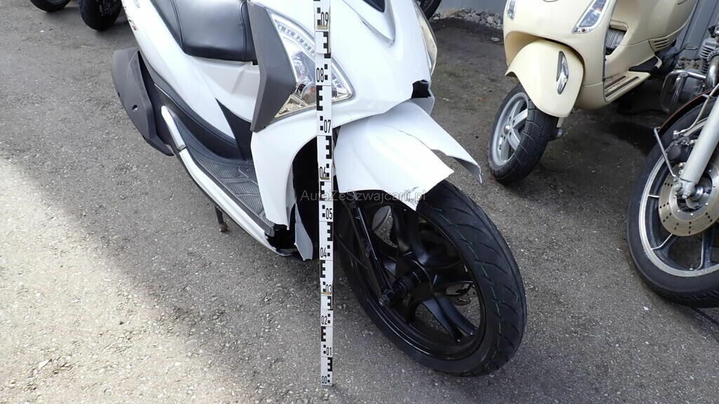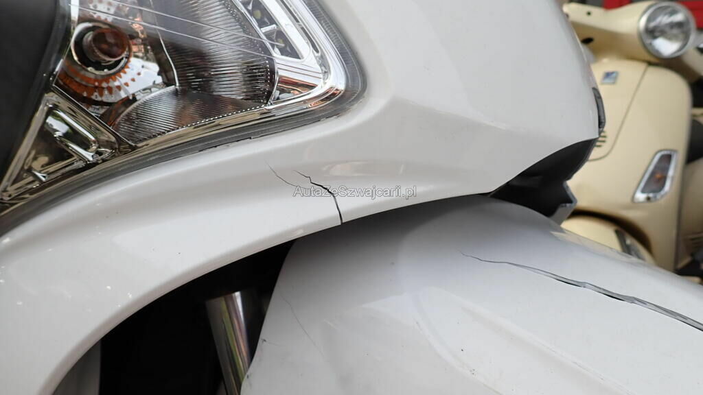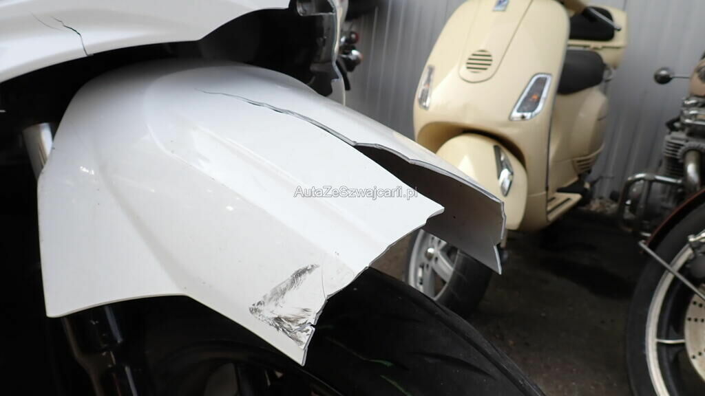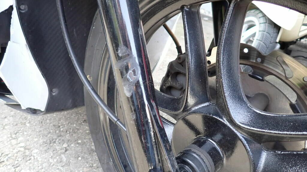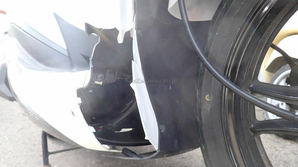 Carénages avant, bas de caisse droit, fourches avant, pontets, axe de roue et guidon, cadre en risque.