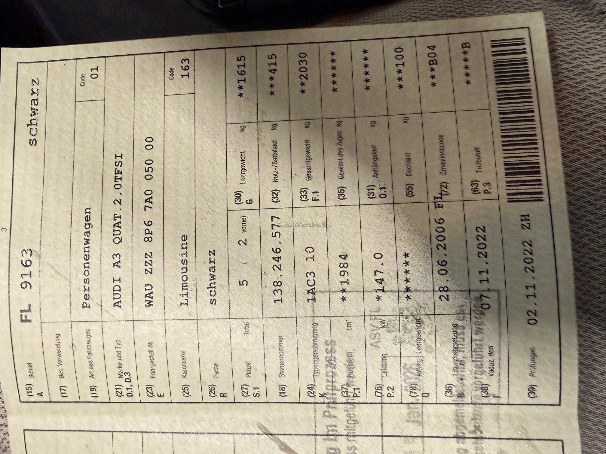 | Kommentar | Kotflügel vorne links und rechts -> Rost Delle Kotflügel vorne links. Es wurde kein ausführlicher Eintauschcheck durchgeführt. Jegliche Gewährleistung wird wegbedungen, insbesondere sind Wandelung und Minderung ausgeschlossen. Die Verantwortung liegt beim Käufer. Rückgabe ausgeschlossen. Irrtümer vorbehalten. |