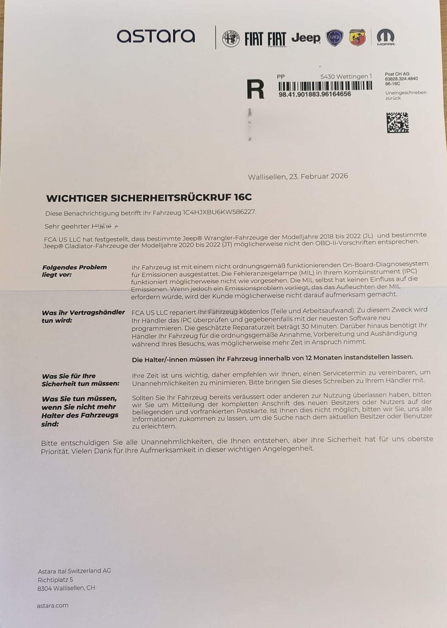 | Beschädigte Windschutzscheibe | No |
