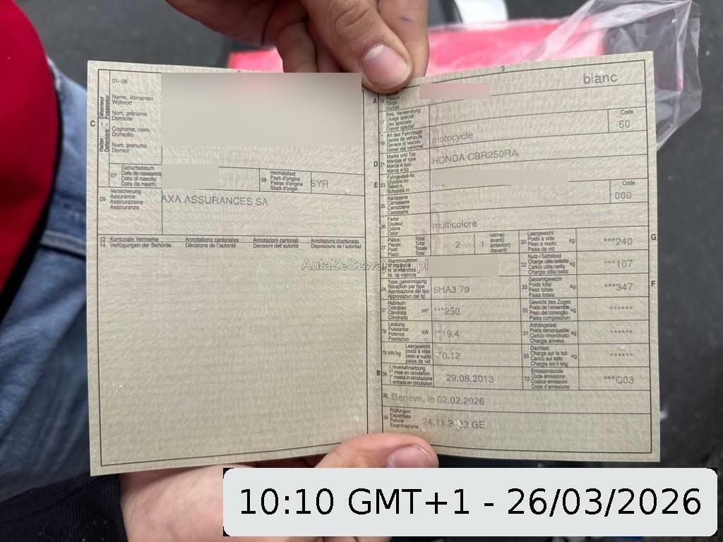 | Beschädigungen | Aussenspiegel rechts, Front, Fussraster rechts, Griff rechts, Kabelstrang, Lenker, Scheinwerfer, Verschalungen hinten, Verschalungen links, Verschalungen rechts, Verschalungen vorne |