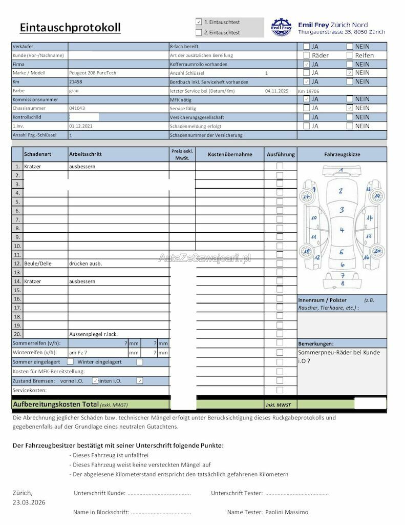 | Information | Keine technische Prüfung (Werkstatttest) vorgenommen Diverse Schäden an Karosserie/Lack. 8-fach bereift. Fahrzeug ab Platz, ohne Garantie und Aufbereitung. Keine Gewähr auf die Angaben der Sonder- und Serienausstattung / keine mechanische Prüfung. Fahrzeug wurde unzerlegt expertisiert / keine Haftung für allfällige, nach Demontage bekanntwerdenden Mängel. Fahrzeugbereifung und Ausstattung gemäss Fotos / Fahrzeugkauf auf eigenes Risiko ab Platz ohne Nachwährschaft. - Div. Dellen und Kratzer - 4 Raddeckel fehlen |