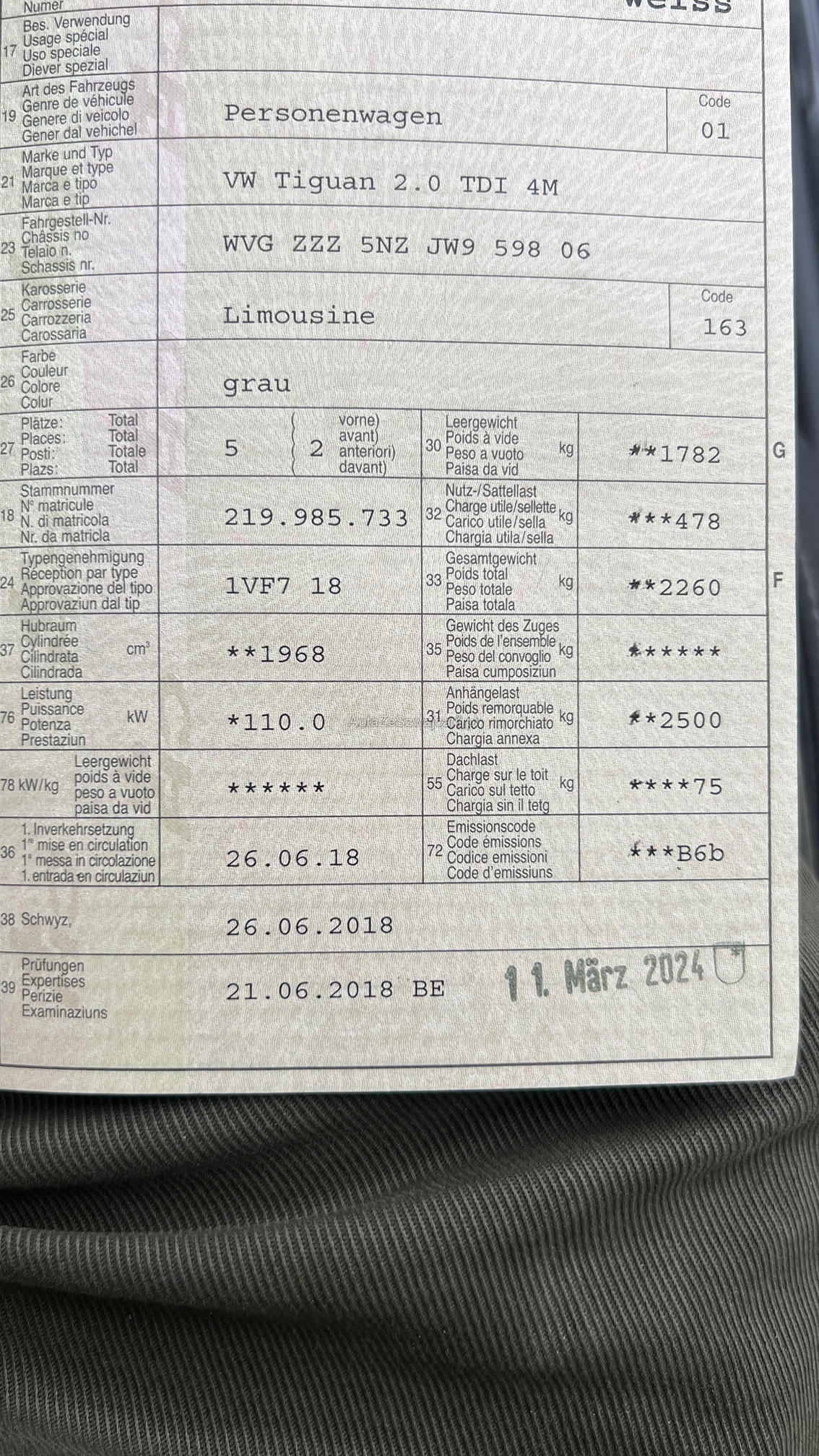 | Kommentar | Service Fällig, diverse Beulen sowie Steinschläge (Motorhaube), Bremsen vorne zu ersetzen, Stossdämpfer vorne Ölig, sehr geringer Ölverlust Kurbelwellensimmering. Wird ab Platz ohne Garantie verkauft. Bei einer Fahrzeugbeschreibung kann immer etwas vergessen oder nicht gesehen werden. Das Risiko liegt somit vollumfänglich beim Käufer. Minderung und Wandelung sind ausgeschlossen. Bei Fragen |