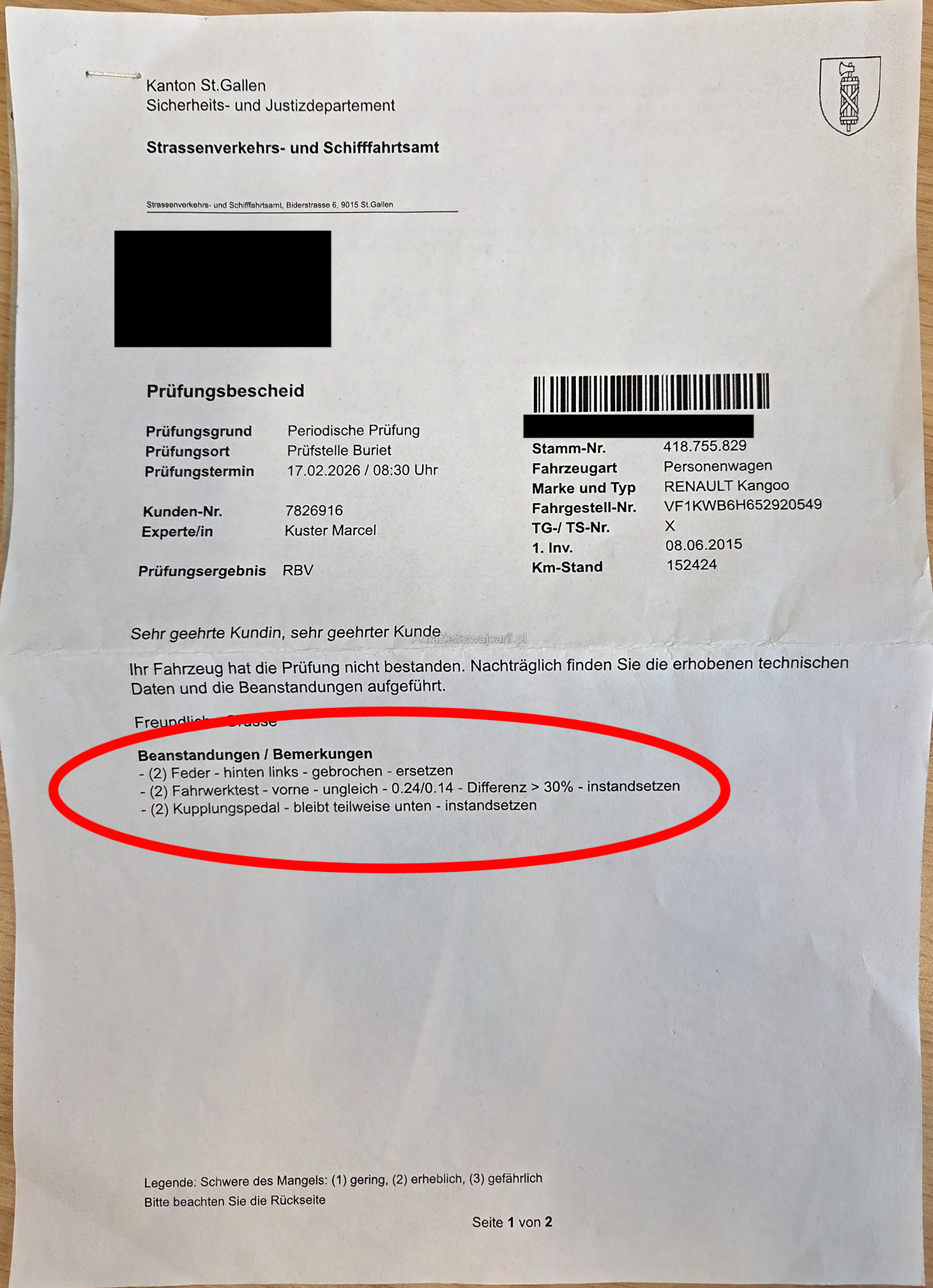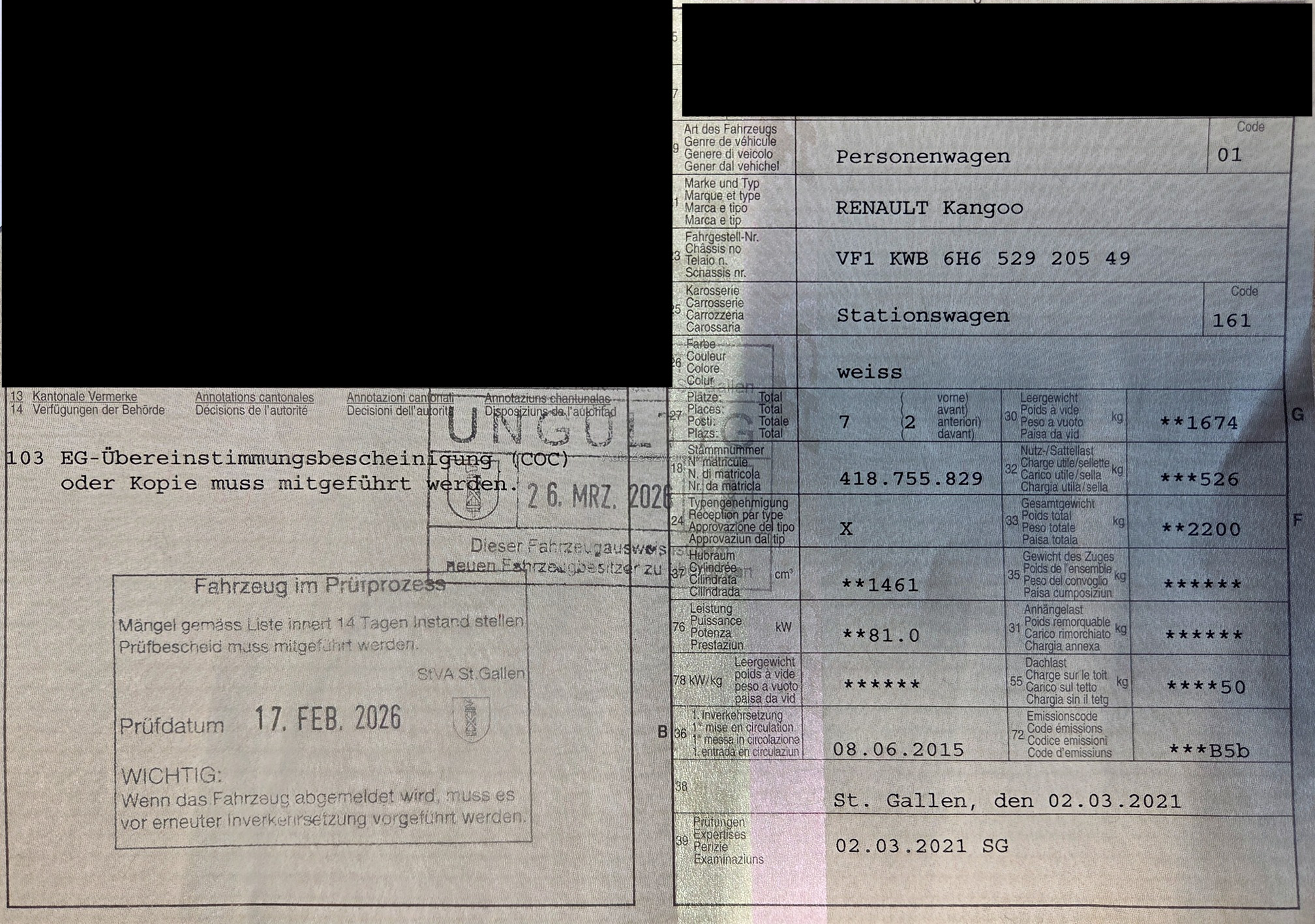 | Kommentar | Am Fahrzeug wurde keine genaue technische Prüfung durchgeführt! - siehe Mängel von MFK Termin - DPF wurde bei MFK nicht beanstandet, deshalb i.O. - Fahrzeug sollte mit Anhänger abgeholt werden, da das Kupplungspedal häufig unten bleibt und dann nicht mehr ausgekuppelt werden kann! - 8-fach bereift - 7-Plätzer - inkl. Dach-Grundträger Am Fahrzeug wurde kein Werkstatttest durchgeführt. Für sichtbare oder nicht sichtbare Mängel wird keine Haftung übernommen. Wir prüfen und kontrollieren nicht alle Funktionen des Fahrzeugs. Das Risiko liegt vollständig beim Käufer. Nach Zuschlag an den Höchstbietenden sind Nachverhandlungen ausgeschlossen, auch wenn nicht deklarierte Mängel auftreten. |