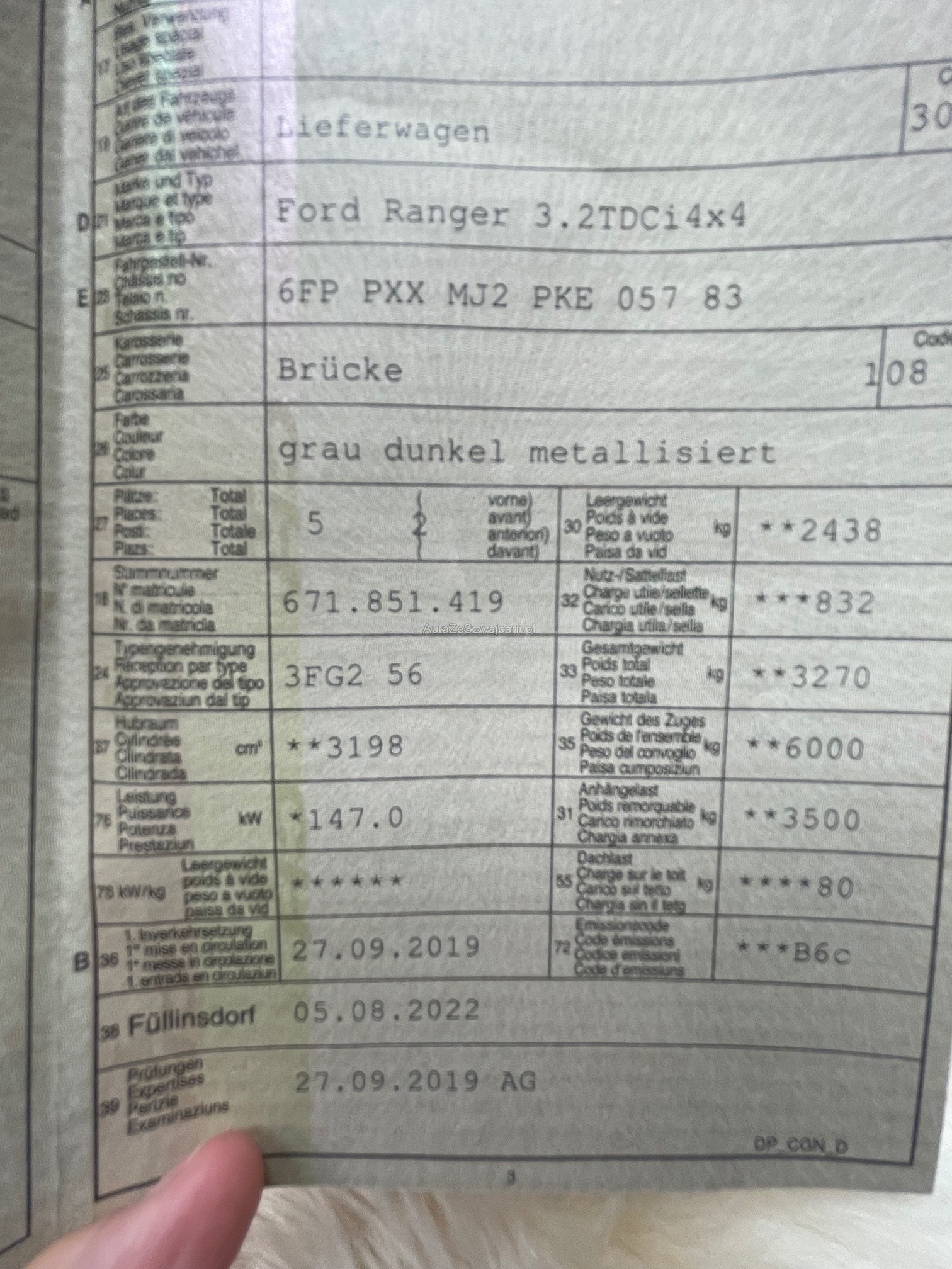 | Kommentar | Sehr gepflegter Ford Ranger 3.2 Liter Diesel. Ab Platz und ohne Garantie. Jede Gewährleistung wird ausdrücklich wegbedungen, insbesondere sind Wandelung und Minderung ausgeschlossen. |