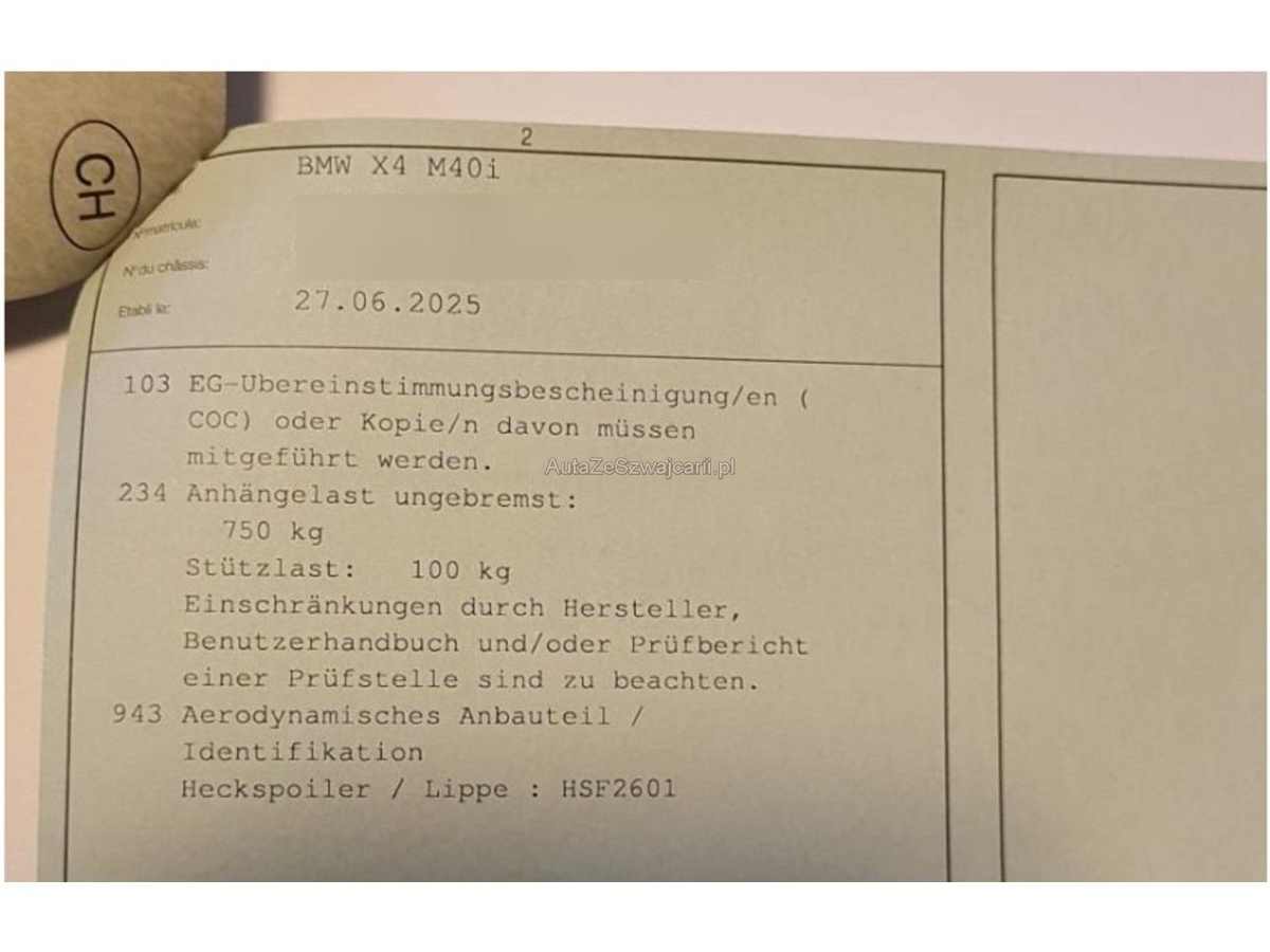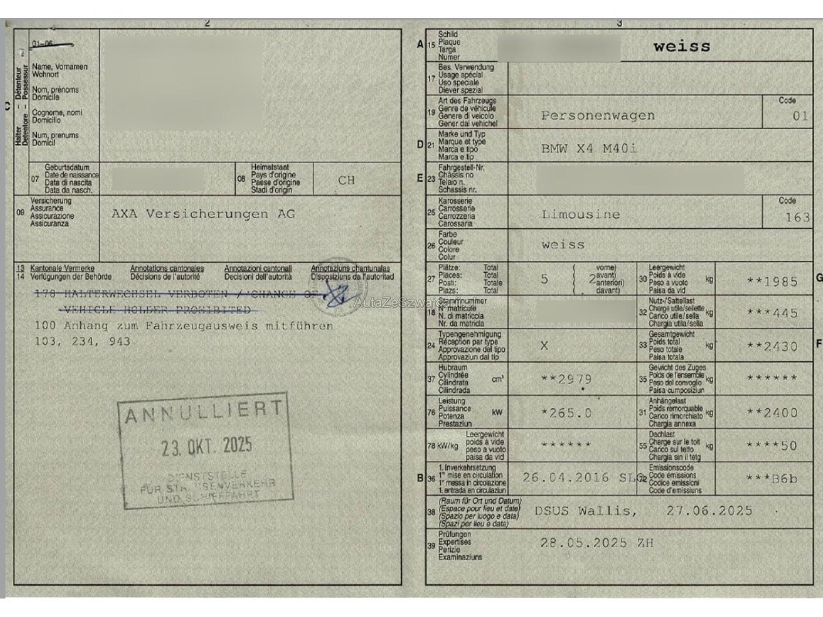 | Fahrzeugausweis | Vorhanden |