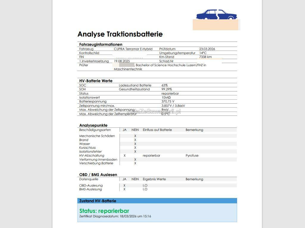 | Zusatzinformationen | Verkaufstext: Die Hochvoltbatterie wurde geprüft und ist reparierbar. Das Fahrzeug wird mit der HV-Batterie verkauft. Die Pyrofuse in der HV-Batterie muss durch einen Fachbetrieb ersetzt werden.Die (vom Fahrzeugexperten) ermittelten Reparaturkosten beziehen sich auf das versicherte Ereignis. Allfällige zusätzliche, nicht versicherte Schäden/Vorschäden, sind in den Reparaturkosten nicht enthalten. Die deklarierten Ausstattungsmerkmale können von der effektiven Ausstattung abweichen.AchtungBei einem Hochvoltsystem - Spannungsfreiheit prüfen. Sicherheitshinweise und Betriebsanleitungen des Herstellers konsultieren und befolgen. Das Fahrzeug steht beim nachfolgend aufgeführten Standortbetrieb und muss vor Gebotsabgabe besichtigt werden.Bitte melden Sie Ihren Besuch beim Standortbetrieb telefonisch an:Autoverwertung Müller AGLuzernerstrasse 406144 Zell LU041 988 19 87 |