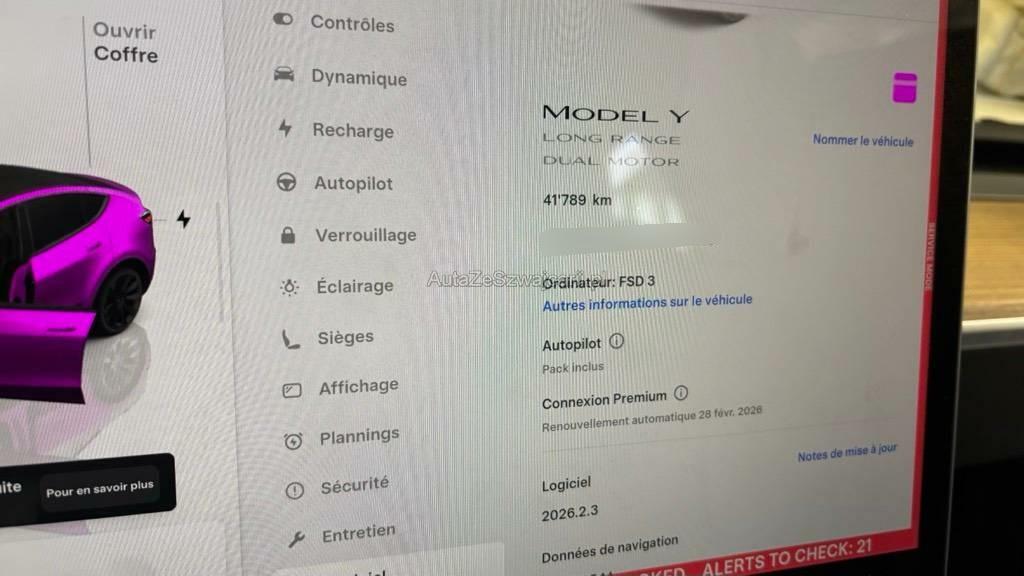 | Serienausstattung | Sitze: Vordersitze elektrisch verstellbar 12-fach, Assist: ABS und TCS, Gurtstraffer vorne, Lackierung: Pearl-Lackierung, Räder: 19" Gemini Wheels, Servolenkung, ISOFIX Kindersitzvorrichtung, Assist: Lenkassistent - Mit den neuen Tesla Vision-Kameras, Sensoren und der erhöhten Rechenleistung kann Ihr Tesla nun über komplexere Strassenführungen navigieren., Licht: LED Scheinwerfer, Assist: Spurhalteassistent, Mittelkonsole mit Ablagefach, Media: Bluetooth Freisprecheinrichtung, Licht: Nebelschlussleuchte, Media: Touchscreen, Elektrische Fensterheber vorne, Aussenspiegel automatisch abblendend, Media: Navigationssystem mit Onboard-Karten, Fußgängerwarnsystem, Licht: Drittes Bremslicht LED, Media: Premium-Audiosystem - 14 Lautsprecher - Subwoofer - 2 Verstärker und Klangfeldprozessor, Lenkrad: Lenkrad elektrisch längs- und höhen-verstellbar, Assist: Kollisionswarnung, Media: Wi-Fi Hotspot, Assist: Rückfahrkamera, Lenkrad: Multifunktionslenkrad, Assist: Adaptive Cruise Control, Easy Entry - Sie können eine Easy Entry-Einstellung festlegen, die die Position des Lenkrads und des Fahrersitzes anpasst, um den Ein- und Ausstieg in bzw. aus Model Y zu erleichtern, Heckklappe elektrisch, Performance Upgrade, Assist: Park Distance Control (PDC), Assist: Frontaufprallwarnung, Dekor: Black PUR Interior, Sitze: Fünfsitzer-Innenraum, Airbag: Airbag Fahrer und Beifahrer, Kabinenkamera, Media: Media Player - Radio - Bluetooth - Streamen - Spotify - Caraoke - TuneIn - Tidal, Scheibenwischer vorne mit Intervall, Heckscheibenheizung, Innenraumbeleuchtung - Deckenleuchten - Ambientebeleuchtung - Leseleuchten - Lenkradbeleuchtung, Panorama-Glasdach, Assist: Basic Autopilot, Airbag: Seiten- und Kopfairbags, Bordcomputer, Seitenaufprall-Schutzsystem, Sicherheitsgurtsystem, Wegfahrsperre elektronisch, Ladekabel, Polster: Kunstleder-Polsterung, Sitze: Rücksitze heizbar, Getönte Scheiben, Zentralverriegelung mit Fernbedienung, Klima: Klimatisierungsautomatik, Assist: Notbremsassistent, 12-Volt-Steckdose vorne, Aussenspiegel rechts und links beheizt, elektrisch verstell- / und einklappbar, Sitze: Ausführung 5 Sitzplätze, Elektronisches Stabilitäts-Programm (ESP), Assist: Parkassistent, Keyless Entry, Media: USB-A Anschluss im Handschuhfach mit abnehmbaren 128 GB Speichermedium, Sitze: Vordersitze heizbar, Licht: LED-Nebelscheinwerfer, Getriebe: Direktantrieb, Sitze: Kopfstützen verstellbar, Sitze: Vordersitze belüftet, Licht: Fernlichtautomatik, Supercharger Network Access + Pay-as-you-go, Sitze: Rücksitzlehne geteilt abklappbar, Lenkrad: Lenkradheizung, Reifendruck-Kontrollanzeige, Garantie: 8 Jahre oder 160'000 km auf Elektroantriebssystem und Batterie (ab 1. Inv.), Reifenreparatur-Set (Tire Fit), Garantie: 4 Jahre oder 80'000 km, Licht: LED-Tagfahrlicht, Airbag: Airbag Beifahrer deaktivierbar |