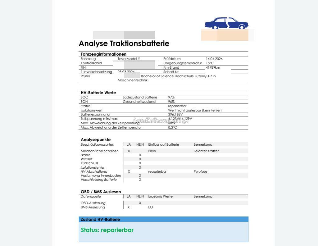 | Zusatzinformationen | Die Hochvoltbatterie wurde geprüft und ist reparierbar. Das Fahrzeug wird mit der HV-Batterie verkauft.Die Pyrofuse in der HV-Batterie muss durch einen Fachbetrieb ersetzt werden.Die (vom Fahrzeugexperten) ermittelten Reparaturkosten beziehen sich auf das versicherte Ereignis. Allfällige zusätzliche, nicht versicherte Schäden/Vorschäden, sind in den Reparaturkosten nicht enthalten. Die deklarierten Ausstattungsmerkmale können von der effektiven Ausstattung abweichen.AchtungBei einem Hochvoltsystem - Spannungsfreiheit prüfen. Sicherheitshinweise und Betriebsanleitungen des Herstellers konsultieren und befolgen. |